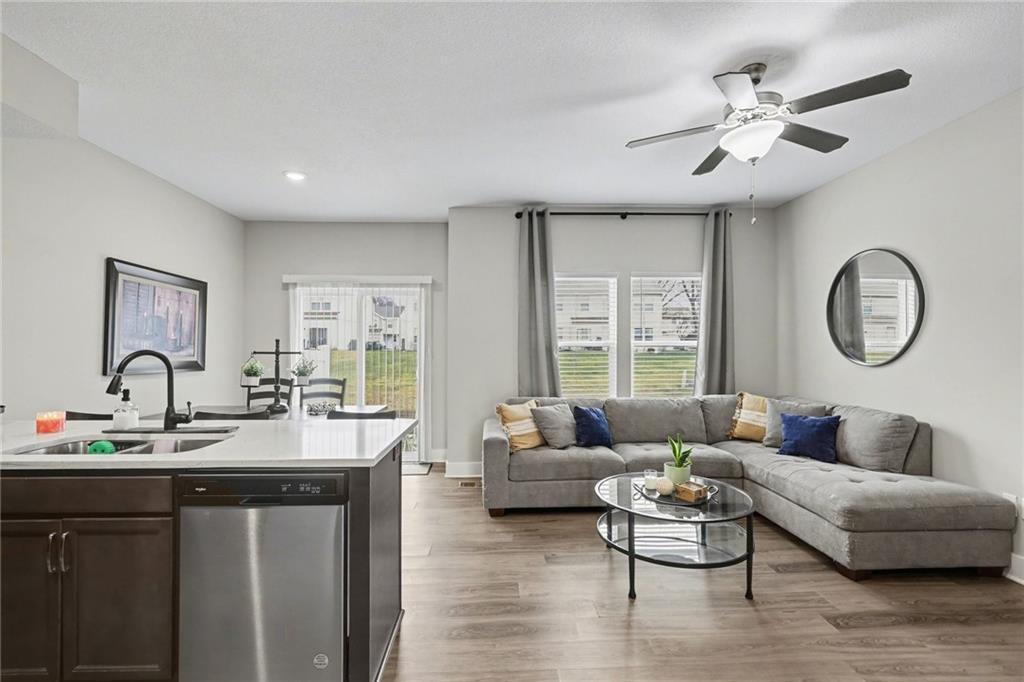 Well-appointed single unit within a four-plex, featuring excellent curb appeal. The inviting entry showcases an open foyer with iron spindle staircase accented by designer carpet. Luxury vinyl plank flooring spans the entire first floor. The thoughtfully designed kitchen offers stainless steel appliances and quartz countertops, seamlessly flowing into the breakfast nook and spacious great room—ideal for both everyday living and entertaining. The oversized owner’s suite includes a walk-in closet, while the conveniently located upstairs laundry serves all bedrooms. Secondary bedrooms feature generous closet space, complemented by a large upstairs bathroom. The unit also includes a full, unfinished basement, providing abundant storage or future living space potential.