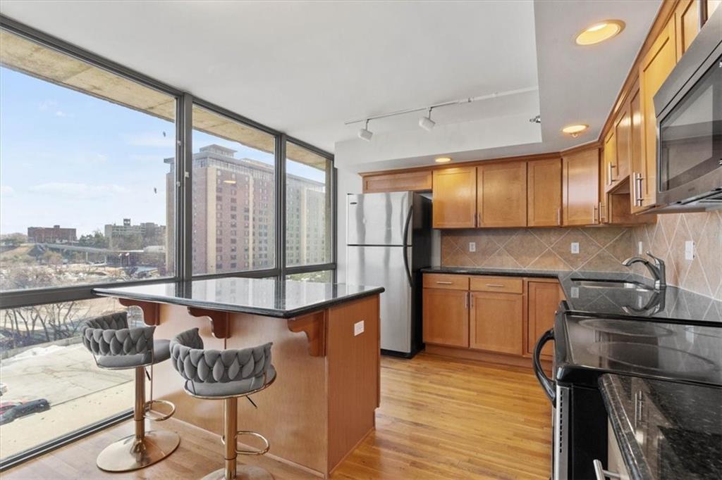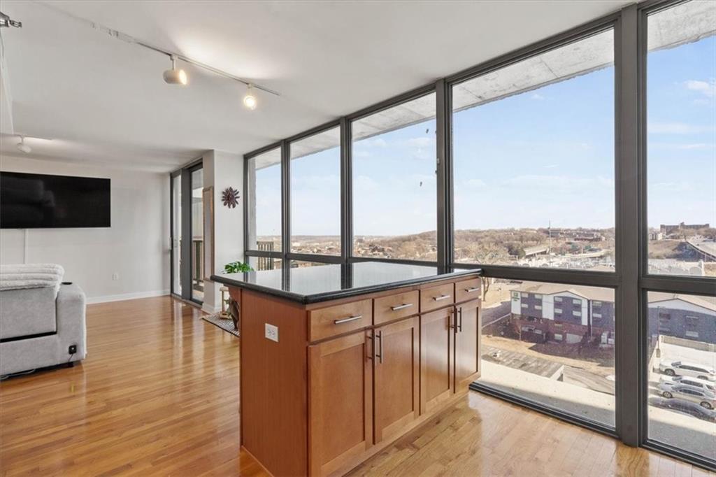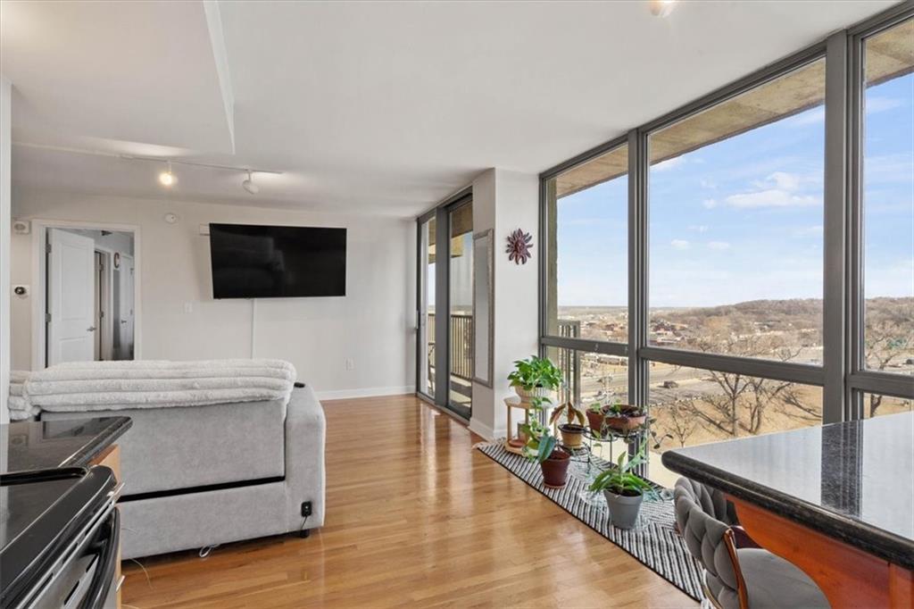 Bright, cheerful, and full of good vibes, this is the kind of place that makes you smile the moment you step inside. Drenched in sunlight, it features a full window wall that frames the city, has sensational amenities, a tax abatement, and a coveted outdoor space you will adore. The layout is open, airy, and thoughtfully designed to maximize space. The kitchen is well-equipped with today’s conveniences, generous cabinetry, granite counters, and a central island that anchors the room. Steps to the living area, it’s perfectly suited for casual entertaining, cozy nights in, or simply enjoying the sunset while dinner comes together. Hardwoods add warmth and continuity throughout, while the balcony provides the ultimate spot to start or end the day. The bedroom offers a serene escape, filled with natural light and expansive windows that keep the skyline in view, complemented by an ensuite that blends style with everyday function. Thoughtful extras include in-unit laundry, two parking spots (one in the garage and one surface), and additional storage for your convenience. The amenities go above and beyond, with pools, hot tubs, and basketball courts. Hit the gym, unwind in the sauna, or stretch and strengthen in the yoga room. Add a tennis/pickleball court, a club room, a movie theater, an executive kitchen, and a garden for quiet escapes. There is even a laundry service and a 24/7doorman. Perfect as a first home, city retreat, or investment property, this charming condo offers the complete package just moments from all the downtown action.
