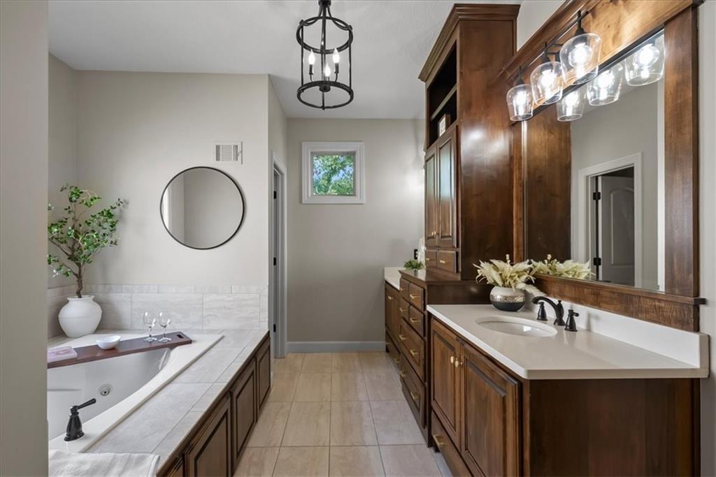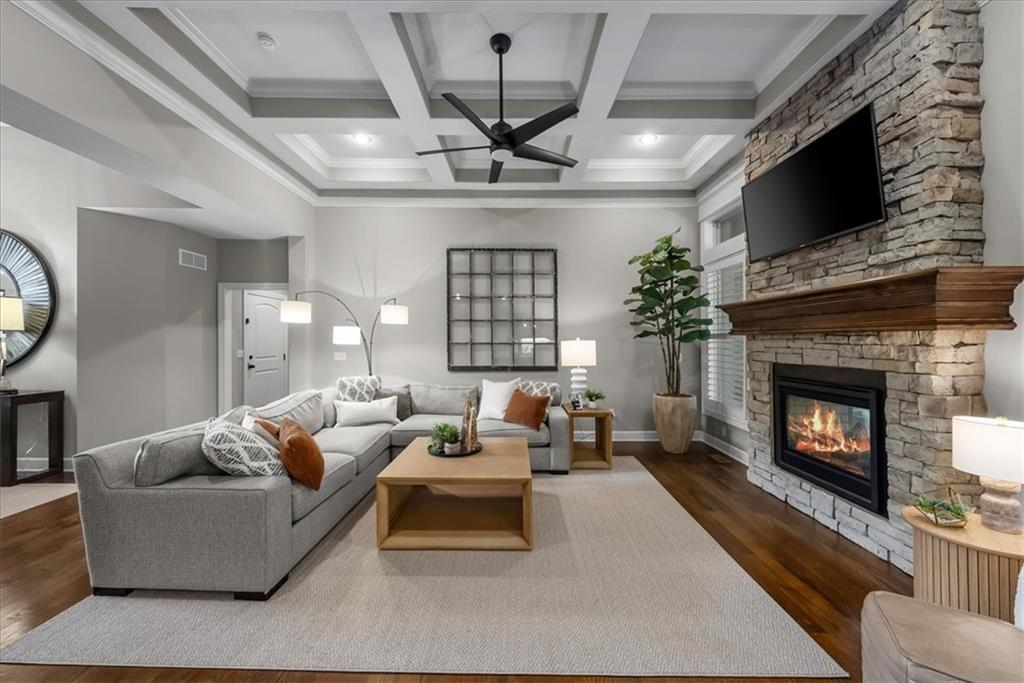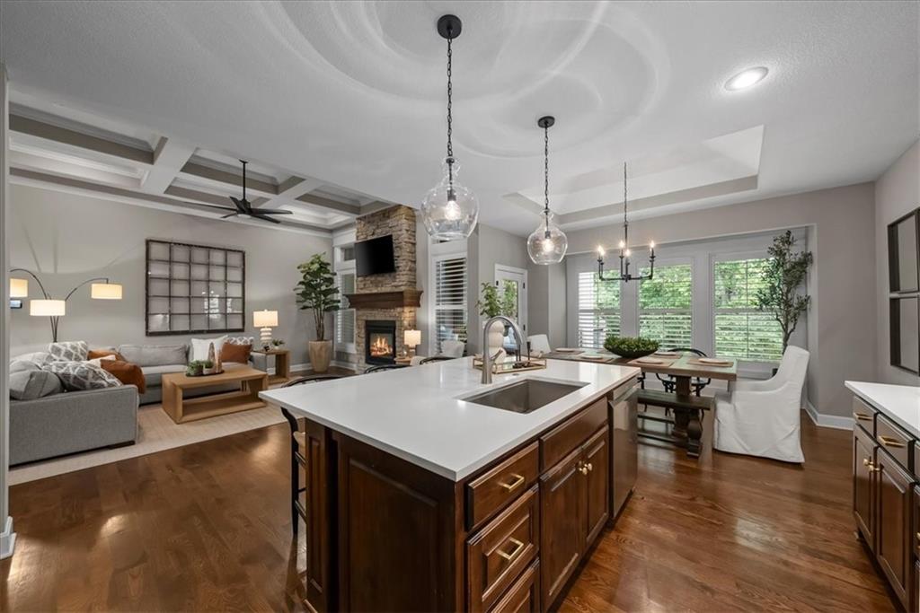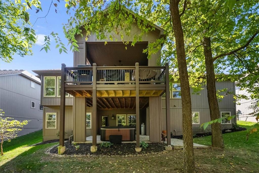 Welcome home to effortless comfort and quiet luxury in this lightly lived-in former Rodrock model home (Dillon Reverse), beautifully set on a private wooded walk-out lot. The open floor plan invites you in with gleaming hardwoods, a beamed great-room ceiling, and a cozy two-sided fireplace perfect for gatherings. A chef’s kitchen shines with quartz countertops, stained cabinetry, stainless steel appliances, and an oversized walk-in pantry, while the main-level bedroom offers flexibility as a guest suite or home office. The serene primary suite features peaceful backyard views, a spa-like bath with whirlpool tub, separate shower, dual vanities, and a walk-in closet connected to the laundry room. Entertaining is effortless in the expansive lower level with a wet bar, family room, and two private ensuite bedrooms. Outdoor living is highlighted with a covered deck and see-through fireplace plus a covered patio overlooking tranquil trees and wildlife. Thoughtful updates include fresh interior and exterior paint, plantation shutters throughout, new quartz kitchen counters, updated lighting, deck extension, and refreshed landscaping. Nestled in a secluded hilltop neighborhood with no neighbors behind - yet minutes from Shawnee Mission Parkway shopping, dining, and award-winning DeSoto schools - this home is ready to impress.