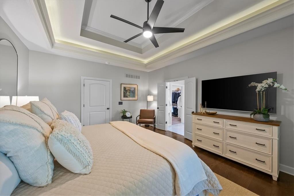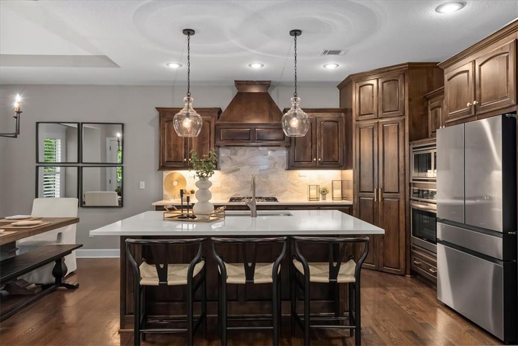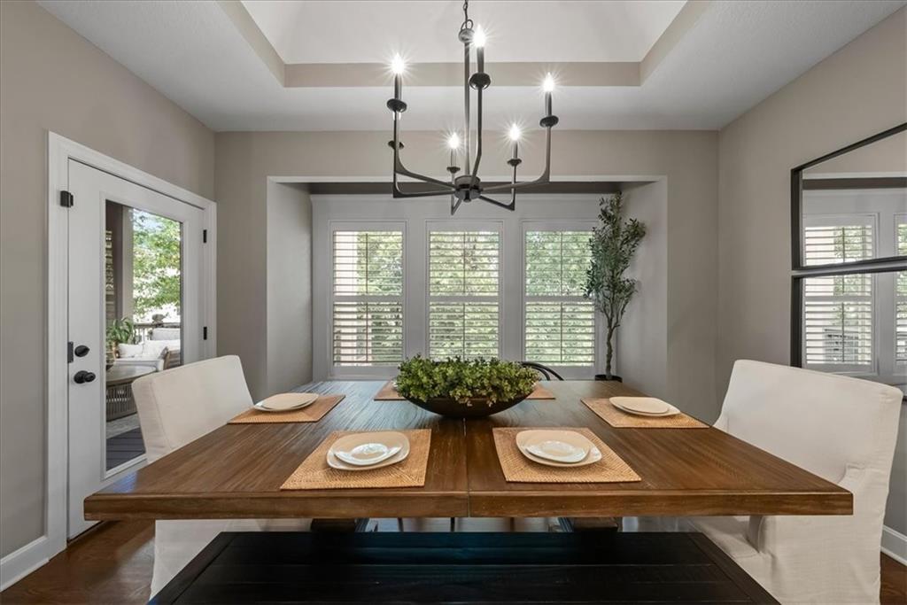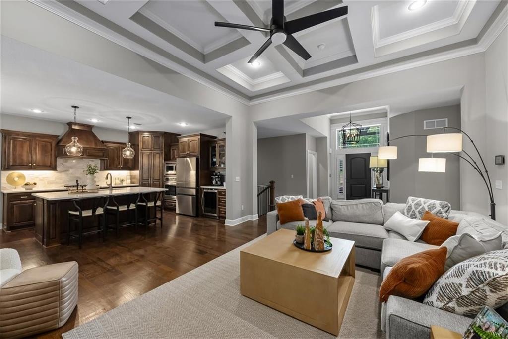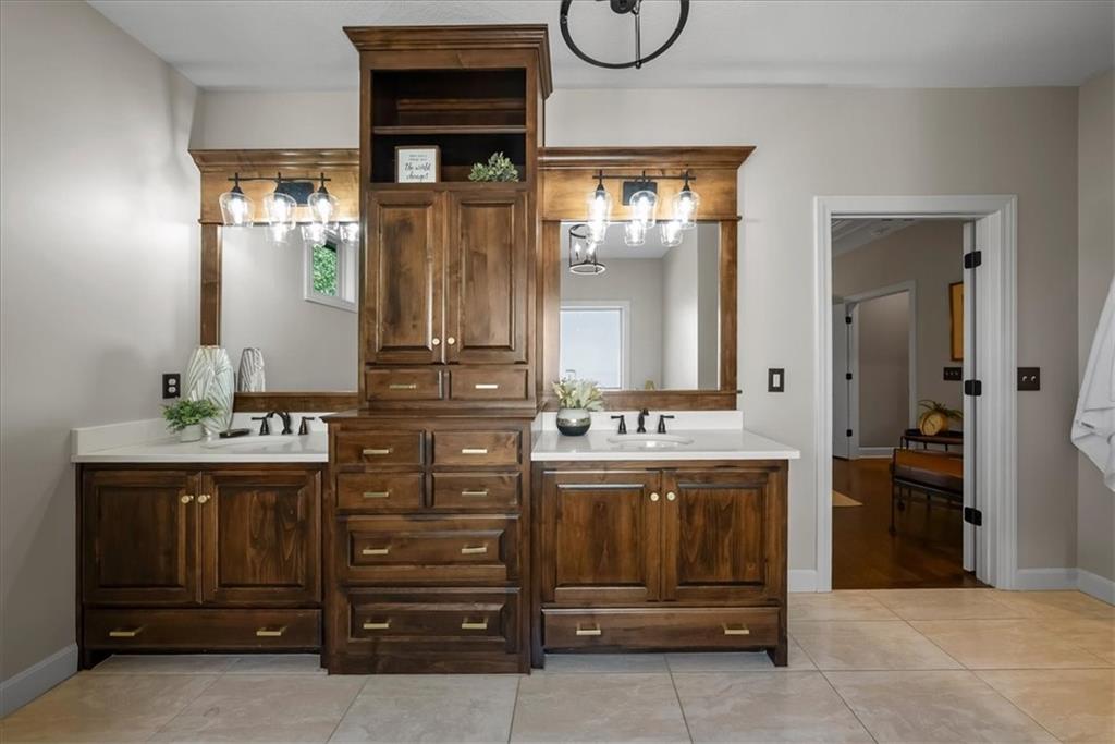 Welcome home to effortless comfort and quiet luxury in this lightly lived-in former Rodrock model home (Dillon Reverse), beautifully set on a private wooded walk-out lot. The open floor plan invites you in with gleaming hardwoods, a beamed great-room ceiling, and a cozy two-sided fireplace perfect for gatherings. A chef’s kitchen shines with quartz countertops, stained cabinetry, stainless steel appliances, and an oversized walk-in pantry, while the main-level bedroom offers flexibility as a guest suite or home office. The serene primary suite features peaceful backyard views, a spa-like bath with whirlpool tub, separate shower, dual vanities, and a walk-in closet connected to the laundry room. Entertaining is effortless in the expansive lower level with a wet bar, family room, and two private ensuite bedrooms. Outdoor living is highlighted with a covered deck and see-through fireplace plus a covered patio overlooking tranquil trees and wildlife. Thoughtful updates include fresh interior and exterior paint, plantation shutters throughout, new quartz kitchen counters, updated lighting, deck extension, and refreshed landscaping. Nestled in a secluded hilltop neighborhood with no neighbors behind - yet minutes from Shawnee Mission Parkway shopping, dining, and award-winning DeSoto schools - this home is ready to impress.