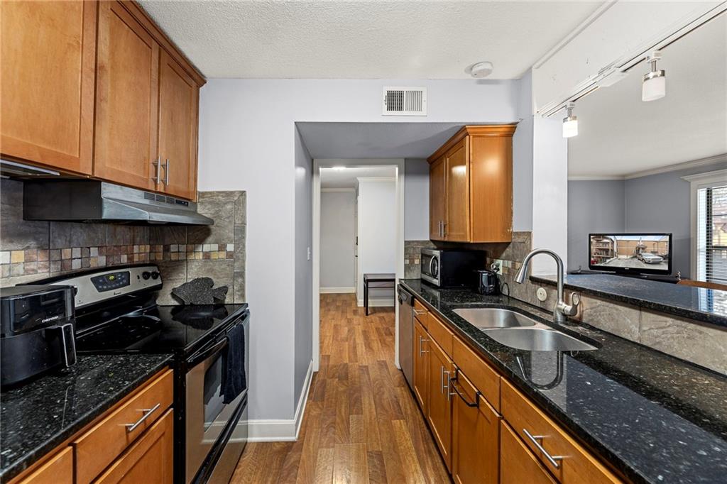 Welcome to Plaza Hills—where location and lifestyle meet in the heart of Kansas City. This light-filled condo offers two spacious bedrooms, two full bathrooms, and one of the largest floor plans in the community. Located in a secure, gated complex just one block from the Country Club Plaza, this upper-level unit features an open-concept layout ideal for everyday living and entertaining. The updated kitchen showcases ceiling-height cabinetry for exceptional storage including a wine rack, granite countertops, stainless steel appliances, and a classic subway tile backsplash. Luxury vinyl plank and hardwood flooring, fresh interior paint, and updated fixtures create a bright, modern feel throughout. All appliances, including the in-unit washer and dryer, stay with the home. French doors open to a private covered deck overlooking the pool—perfect for morning coffee or relaxing evenings. A reserved parking space directly behind the building adds everyday convenience. Residents enjoy premium amenities including a fitness center, secured package delivery, and a beautiful community pool. Ideally positioned between the Country Club Plaza and Westport, and minutes from the Nelson-Atkins Museum of Art, this condo offers unbeatable access to Kansas City’s best dining, shopping, and entertainment.