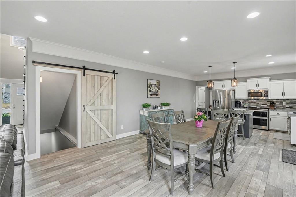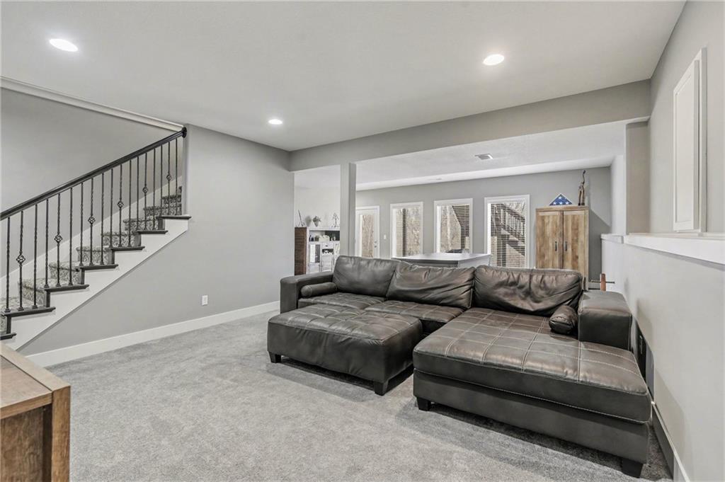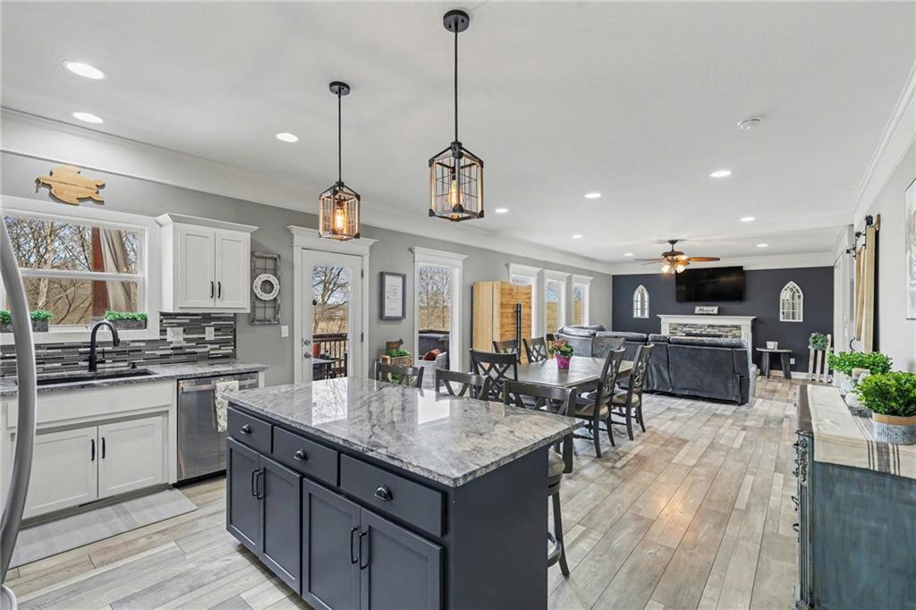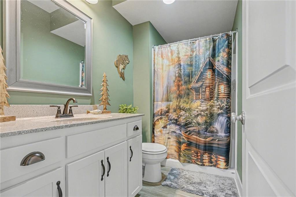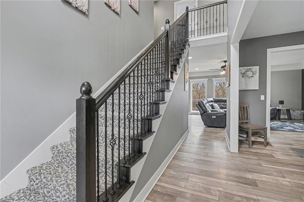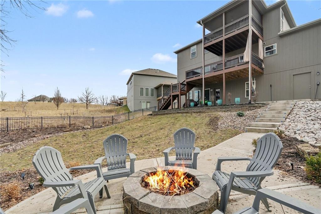 This stunning, like-new 2-story in the popular Lakeside Crossing community is ready to welcome you home. Just minutes from Smithville Lake, you’ll enjoy effortless access to swimming, fishing, walking trails, camping & more. Curb appeal begins w/the covered front porch-perfect for slow mornings & coffee in hand. Step inside to a 2-story entry & an open-concept floor plan designed for both everyday living & entertaining. LVP flooring flows through the majority of the home, complemented by versatile gray tones (just painted last Summer) that make decorating a breeze. The formal dining room offers space for gatherings & large family dinners, while the inviting living room features a stone-surround electric fireplace & a wall of windows showcasing peaceful views of the green-space behind. The kitchen is both stylish and functional, offering granite countertops, a tile backsplash, stainless steel appliances, ample cabinet & counter space, a center island for quick meals & a bright breakfast area. Just around the corner, you’ll find a pantry, convenient drop zone off the garage & a main-level half bath. Upstairs, the spacious primary suite impresses w/a coffered ceiling & private access to the tiered covered deck. The ensuite bath features a jacuzzi tub, rain-head shower, dual vanities w/abundant storage, & an oversized walk-in closet that conveniently connects to the laundry room. Three additional bedrooms & a full bath complete the upper level. The finished walk-out lower level expands your living space w/a large rec room, 3rd full bathroom, & a true 5th bedroom-ideal for guests, a home office, or workout space. The suspended 3-car garage provides exceptional storage options. Outside, the upgraded iron fencing frames a backyard that backs to open green-space & trees. Spend evenings around the firepit & enjoy the privacy and views that make this lot truly special. Don’t miss your opportunity to own this beautifully maintained 2-story in the heart of Smithville.