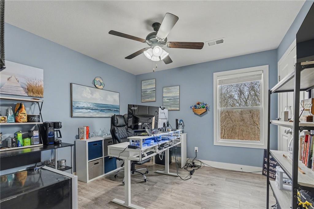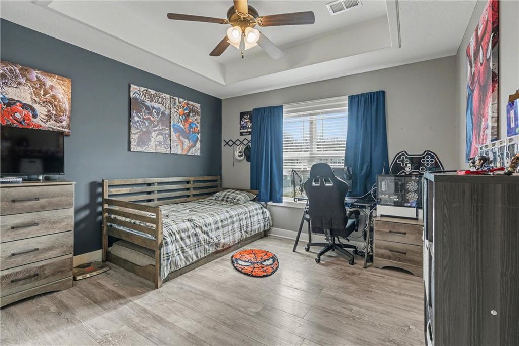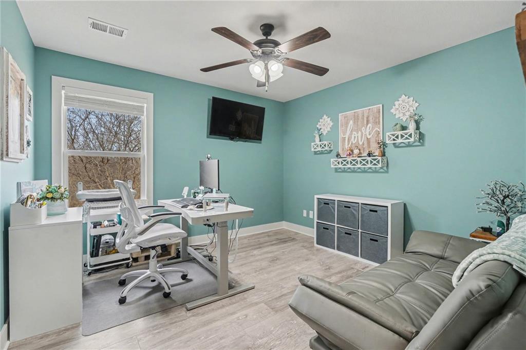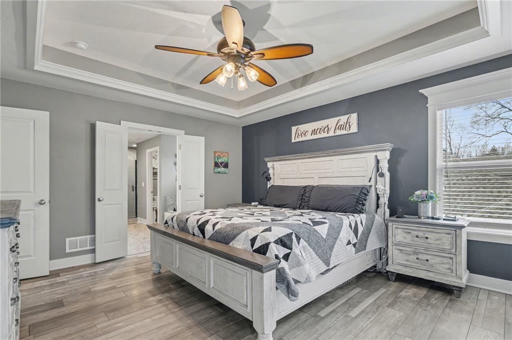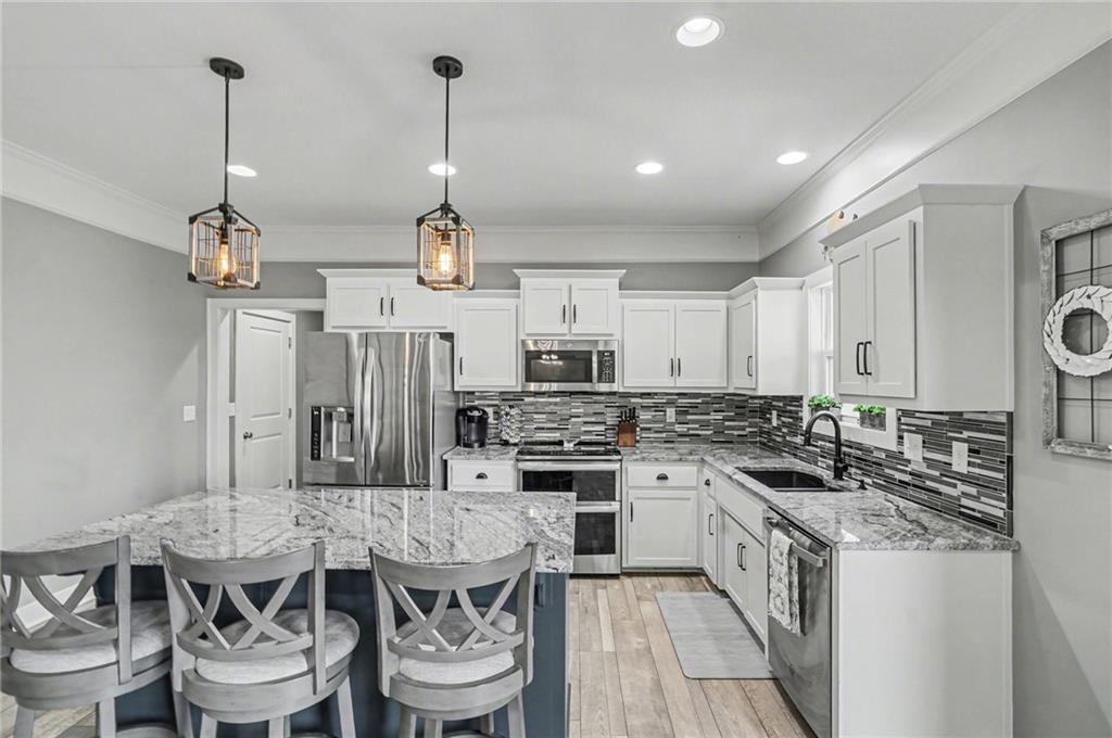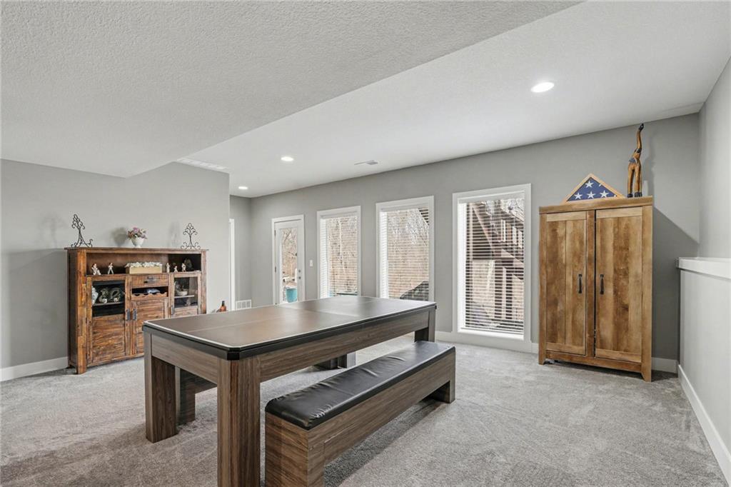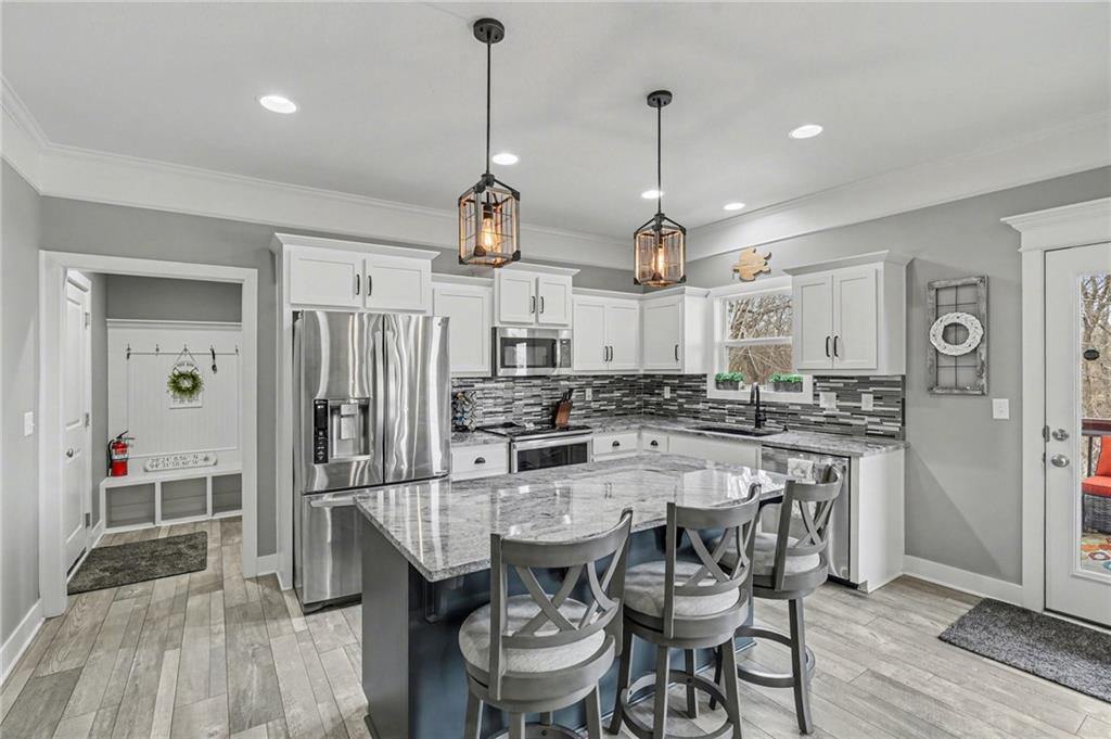 This stunning, like-new 2-story in the popular Lakeside Crossing community is ready to welcome you home. Just minutes from Smithville Lake, you’ll enjoy effortless access to swimming, fishing, walking trails, camping & more. Curb appeal begins w/the covered front porch-perfect for slow mornings & coffee in hand. Step inside to a 2-story entry & an open-concept floor plan designed for both everyday living & entertaining. LVP flooring flows through the majority of the home, complemented by versatile gray tones (just painted last Summer) that make decorating a breeze. The formal dining room offers space for gatherings & large family dinners, while the inviting living room features a stone-surround electric fireplace & a wall of windows showcasing peaceful views of the green-space behind. The kitchen is both stylish and functional, offering granite countertops, a tile backsplash, stainless steel appliances, ample cabinet & counter space, a center island for quick meals & a bright breakfast area. Just around the corner, you’ll find a pantry, convenient drop zone off the garage & a main-level half bath. Upstairs, the spacious primary suite impresses w/a coffered ceiling & private access to the tiered covered deck. The ensuite bath features a jacuzzi tub, rain-head shower, dual vanities w/abundant storage, & an oversized walk-in closet that conveniently connects to the laundry room. Three additional bedrooms & a full bath complete the upper level. The finished walk-out lower level expands your living space w/a large rec room, 3rd full bathroom, & a true 5th bedroom-ideal for guests, a home office, or workout space. The suspended 3-car garage provides exceptional storage options. Outside, the upgraded iron fencing frames a backyard that backs to open green-space & trees. Spend evenings around the firepit & enjoy the privacy and views that make this lot truly special. Don’t miss your opportunity to own this beautifully maintained 2-story in the heart of Smithville.