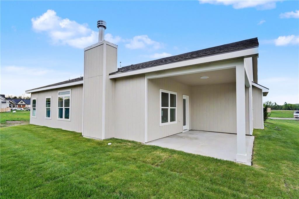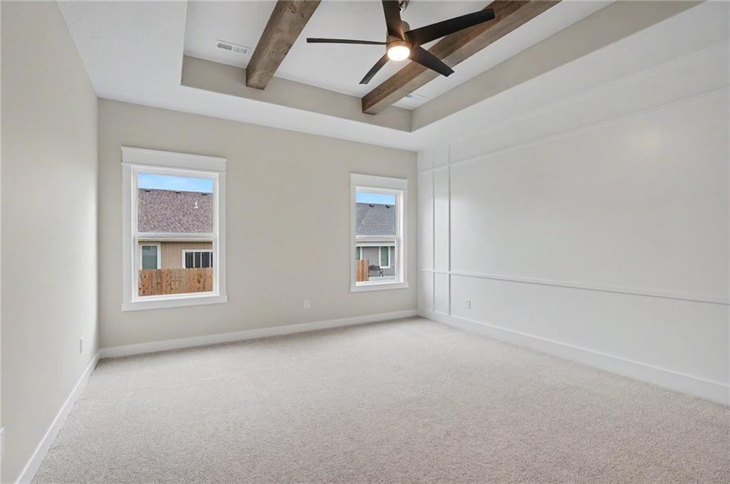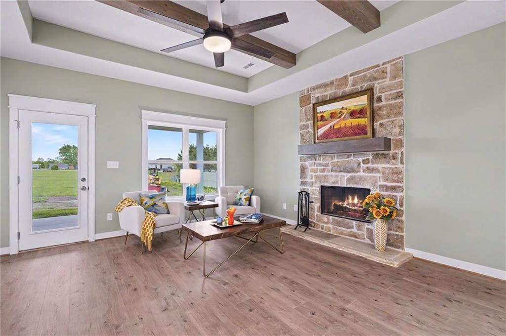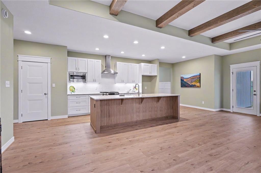 This impeccably built 3 bedroom, 1 and ¾ bath home offers 1,805 sq ft of comfort, quality, and timeless style. A welcoming wainscoted entry, designer interior doors, and quality finishes throughout elevate the home’s character. The kitchen is both functional and inviting, featuring a large island with farmhouse sink, an impressive gas range, and a 47-decibel ultra-quiet stainless steel dishwasher, ideal for entertaining or everyday living. The open living room is anchored by a stunning natural native Kansas limestone fireplace surround, wood burning fireplace made easy with gas log lighter, accented by exposed timber beams that continue into the primary bedroom for a warm, rustic elegance. Retreat to the primary bedroom enhanced by a custom designed accent wall and coffered ceiling, en suite primary bath boasts a large walk-in closet, walk-in shower and double vanity. The generous laundry room with sink adds convenience and practicality. One level living complete with an insulated 3-car garage for added ease and storage. Sound insulation in living areas and bathrooms and an insulated perimeter floor slab enable year-round comfort and quiet living. This thoughtfully designed home offers modern amenities and quality construction; perfect for those seeking space, style, and serenity.