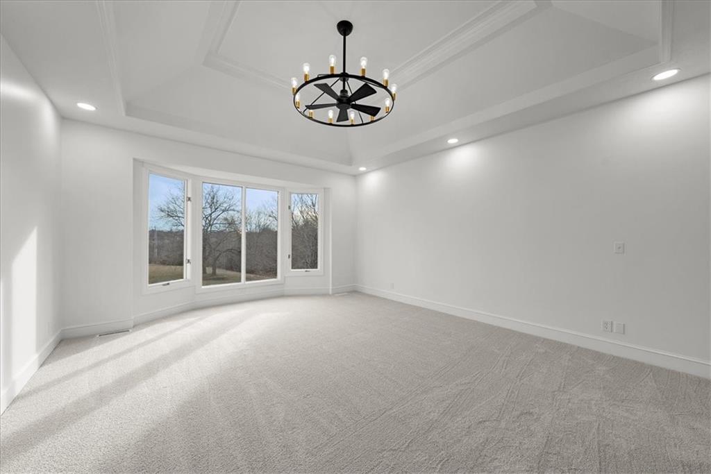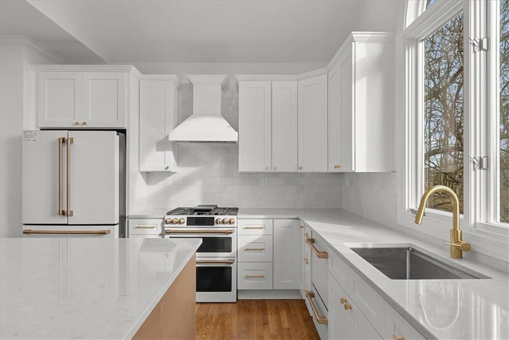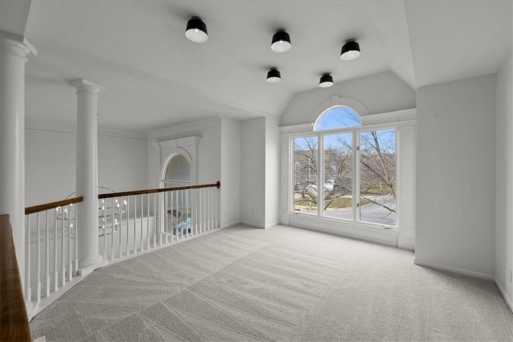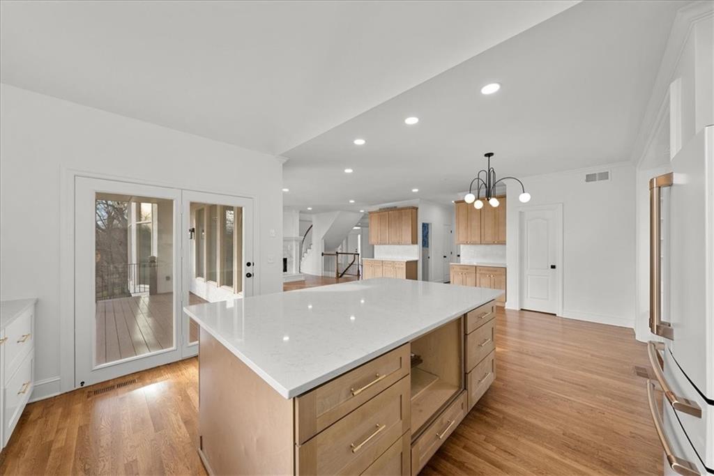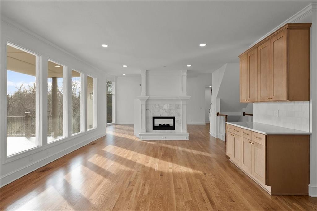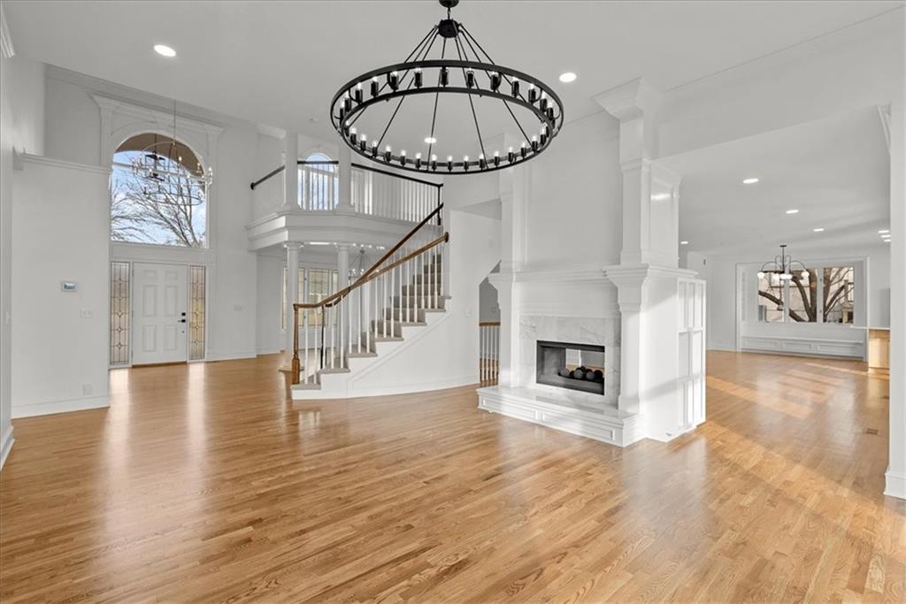 This stunning home in coveted Leawood is sure to impress! Once you enter, you're greeted by a sweeping staircase and vaulted ceilings throughout most of the home. All the rooms are extra large and everything has been beautifully updated with higher end finishes. You'll fall in love with this chef's kitchen where the island is such a statement piece! Plus all the kitchen cabinets, quartz countertops and appliances are new! There are 4 bedrooms with the primary bedroom on the main level. The primary bathroom has a large shower, 2 walk-in closets, a soaking tub sitting right next to a fireplace and double vanities. Upstairs there are 2 more bedrooms and an open loft space that overlooks the expansive living room. The walkout basement has another bedroom making it great for guests or multi-generational living. This is a fantastic family home or an impressive grand home for those who love to host large gatherings. Located inside the Pavilions neighborhood, this home is situated on a private yard that backs up to beautiful green space. Don't miss this incredible opportunity to make wonderful memories in this very stylish executive home in Leawood.