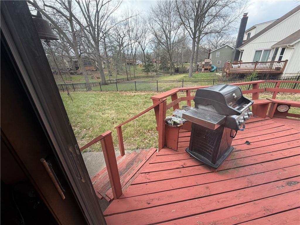 Excellent location in Piper School District. Close by golf course and to the Chief’s new stadium site. Nice size corner lot with circular driveway. Great room has a cathedral ceiling and large fireplace. 3 bedrooms on main level. Master bedroom has cathedral ceiling and en-suite bathroom with accessible walk-in shower. 3 nonconforming bedrooms in the basement plus large family room and full bath. Fireplace also in the family room downstairs. Two full bathrooms on main floor plus half bath off of the laundry room on main level. Breakfast room off of kitchen. Appliances stay. Several sliding doors from the main level out to the wraparound deck. Lots of unfinished storage space and workshop in basement. House has good bones, move in ready, but needs TLC.
