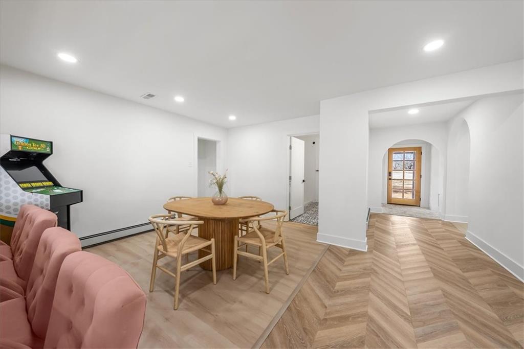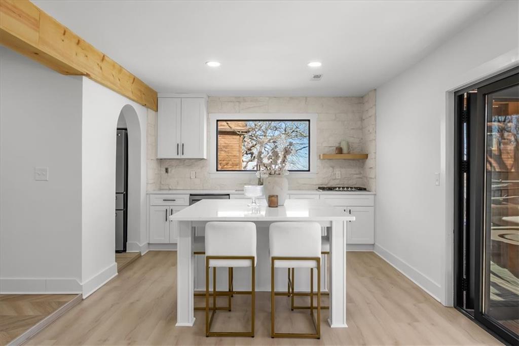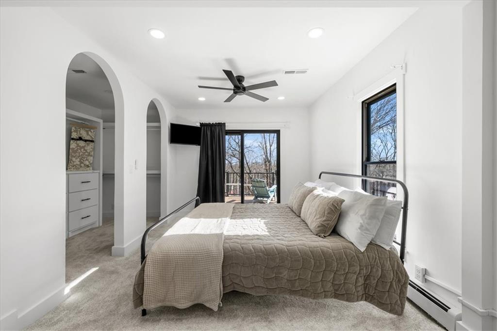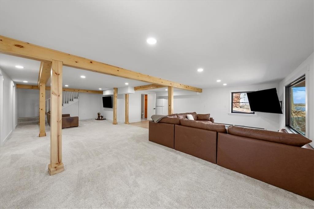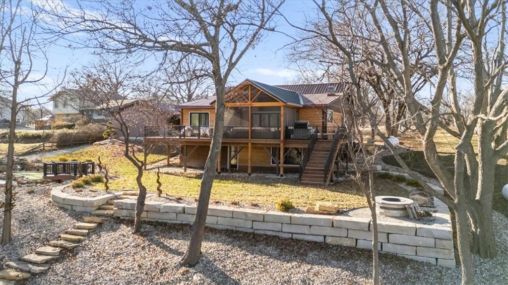 Welcome to your own slice of paradise at the lake! This stunning ranch-style lakefront home at Lake Pomona offers 5 bedrooms and 4 bathrooms, and has been meticulously updated and lovingly maintained. A marble-tiled entry welcomes you into an expansive eat-in kitchen featuring abundant prep space, extensive countertops, and a large center island with seating for four—perfect for gathering with family and friends. Just off the kitchen, a sitting room with louvered folding patio doors opens to a three-season room and onto a renovated deck overlooking the beautifully maintained grounds, complete with a putting green and tranquil pond. The formal dining room is conveniently located just steps away, making entertaining effortless. The main level includes a spacious primary en-suite retreat with a soaking tub, separate shower, and generous vanity. Two additional bedrooms and a full bath with double sinks and a walk-in shower complete the main floor. The finished lower level offers even more living space with a large family room, two additional bedrooms—one currently designed as a bunk room that sleeps eight—plus a full bath and laundry area. Step outside from the lower level to enjoy the fire pit and pathway leading directly to the double dock. Designed for making memories, this exceptional lakefront property is the perfect weekend escape for large families and year-round enjoyment.