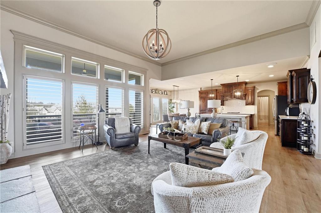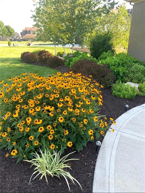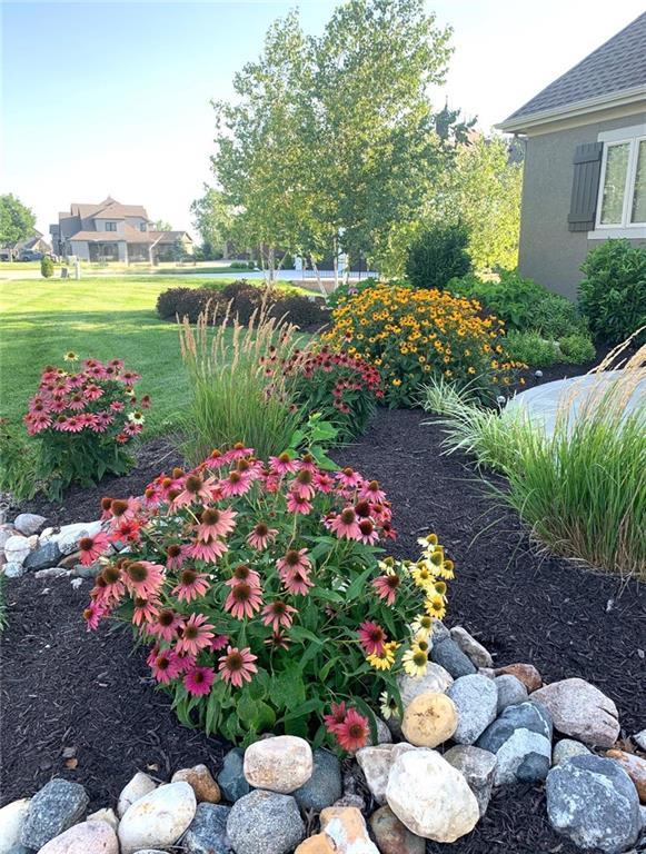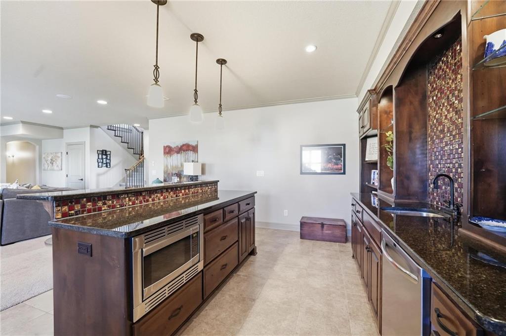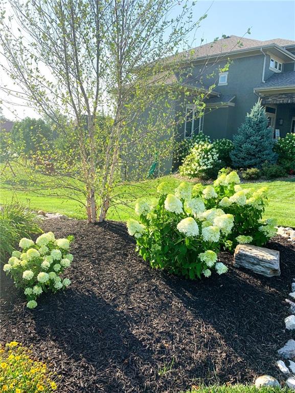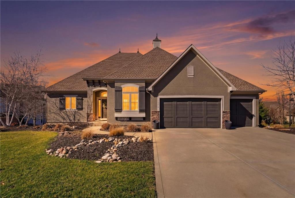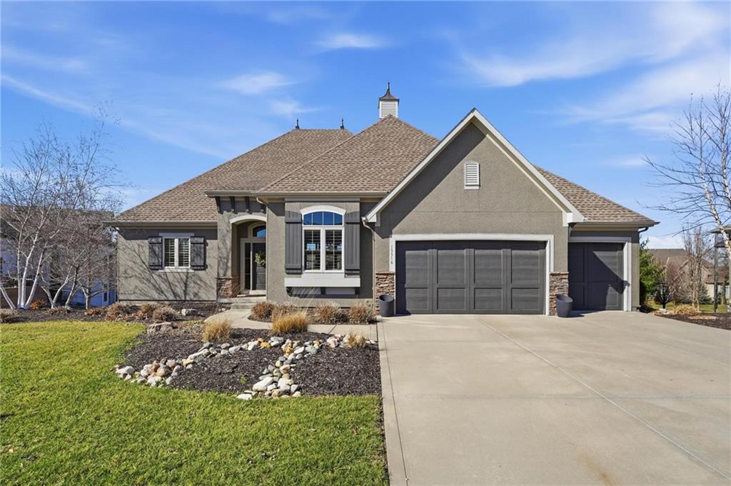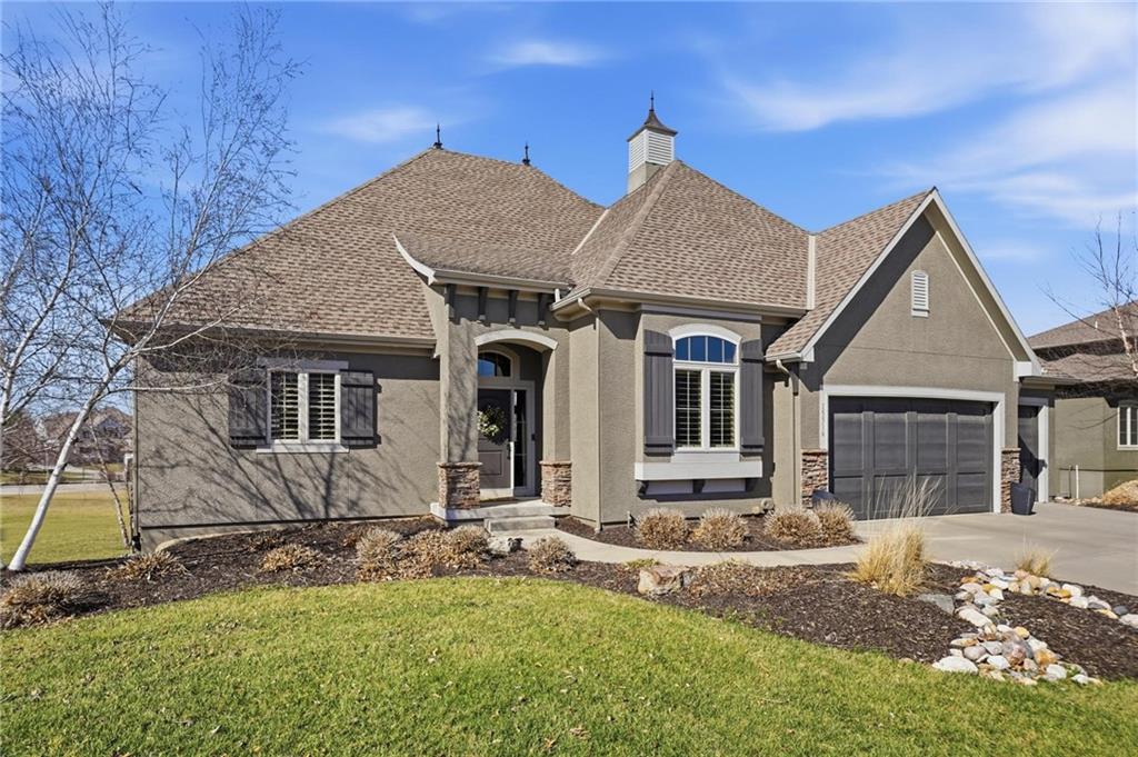 MAGNIFICENT REVERSE 1.5 ON A CUL-DE-SAC IN COLTON LAKES SOUTH IN THE AWARD-WINNING BLUE VALLEY SCHOOL DISTRICT! This stunning home perfectly blends warm, inviting contrasts with clean, modern design, all showcased in a desirable open floor plan ideal for everyday living and entertaining. Light-filled Great Room is anchored by a dramatic floor-to-ceiling stacked stone fireplace with custom built-ins—creating a striking focal point and the perfect place to gather. Chef’s kitchen is sure to impress with quartz countertops, a generous center eat-in island, walk-in pantry and stainless steel appliances, including a gas cooktop, built-in oven and microwave. An adjacent breakfast nook and formal dining room offer versatile spaces for hosting guests or enjoying cozy nights at home. Retreat to the luxurious primary suite featuring direct access to the covered deck—for your morning coffee or evening unwind. Spa-inspired en-suite boasts a double vanity, whirlpool tub, separate walk-in shower and a spacious walk-in closet with convenient in-suite laundry. Second bedroom, full bath and mudroom complete the thoughtfully designed main level. Finished walk-out lower level expands your living space with a large family room, wet bar, three additional bedrooms, two full baths and a second laundry area—ideal for guests or multi-generational living. Professionally designed landscaping creates a serene, private outdoor retreat. Enjoy time on the deck or patio, both overlooking the extra-wide, spacious lot and tree-filled greenspace. Unbeatable location just minutes from Heritage Park, the Overland Park Arboretum, Blue Hawk's shopping and dining and easy highway access. WELCOME HOME!