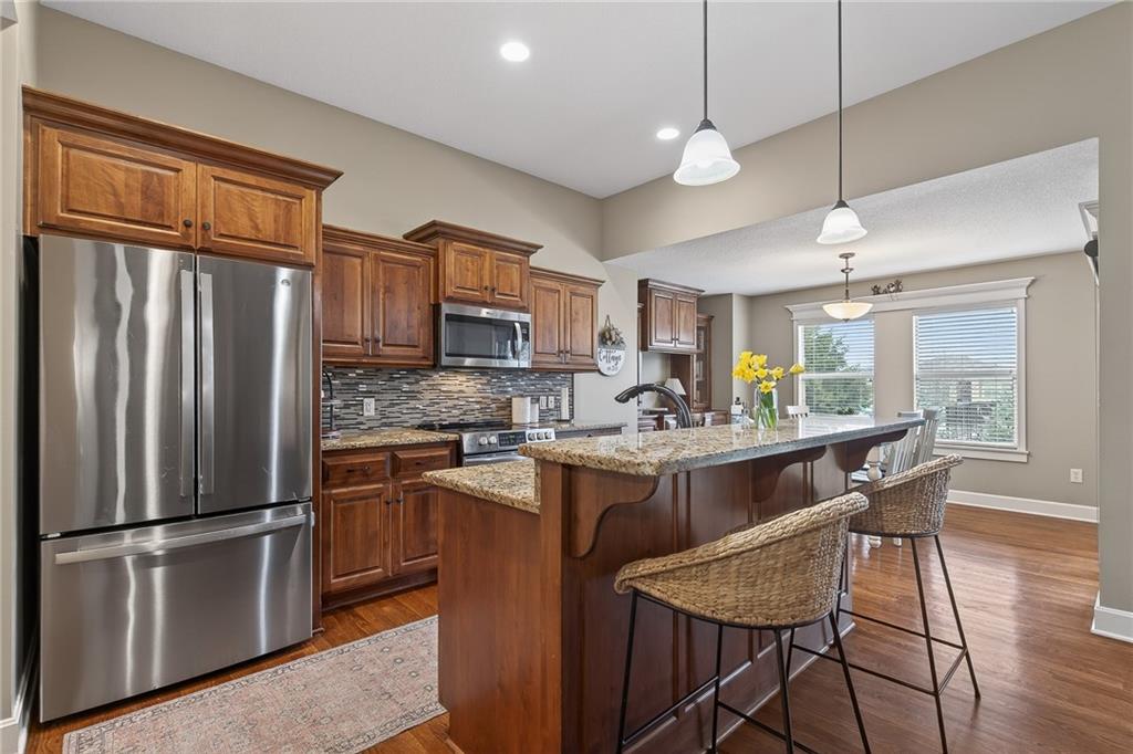 Beautiful Reverse 1.5 Story on dead end CUL-DE-SAC with 3 car garage! The Main Floor features 3 bedrooms, hardwood floor, main level laundry, and an extra large screened porch. Newer black wrought iron fence has a gate to access community pool and amenities within steps of backyard. Open Great Room w/ hardwood, fan and gas stone fireplace. The kitchen features a walk-in pantry, hardwood, granite island and countertops, stainless steel appliances. The Primary suite features vaulted ceiling, walk-in closet and private bath with walk-in shower, oversized tub, double vanity and tile floor. Finished lower level boasts large living area for entertaining, 4th bedroom with large walk-in closet and 3rd full bath. Also, a 5th non-conforming bonus bedroom. This home is within walking distance of the elementary, middle school and Spring Hill High School. Enjoy all the amenities that the neighborhood has to offer with the fishing lake, pool, playground and walking trail.