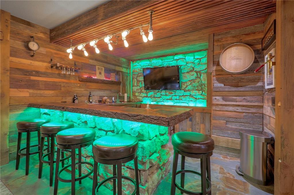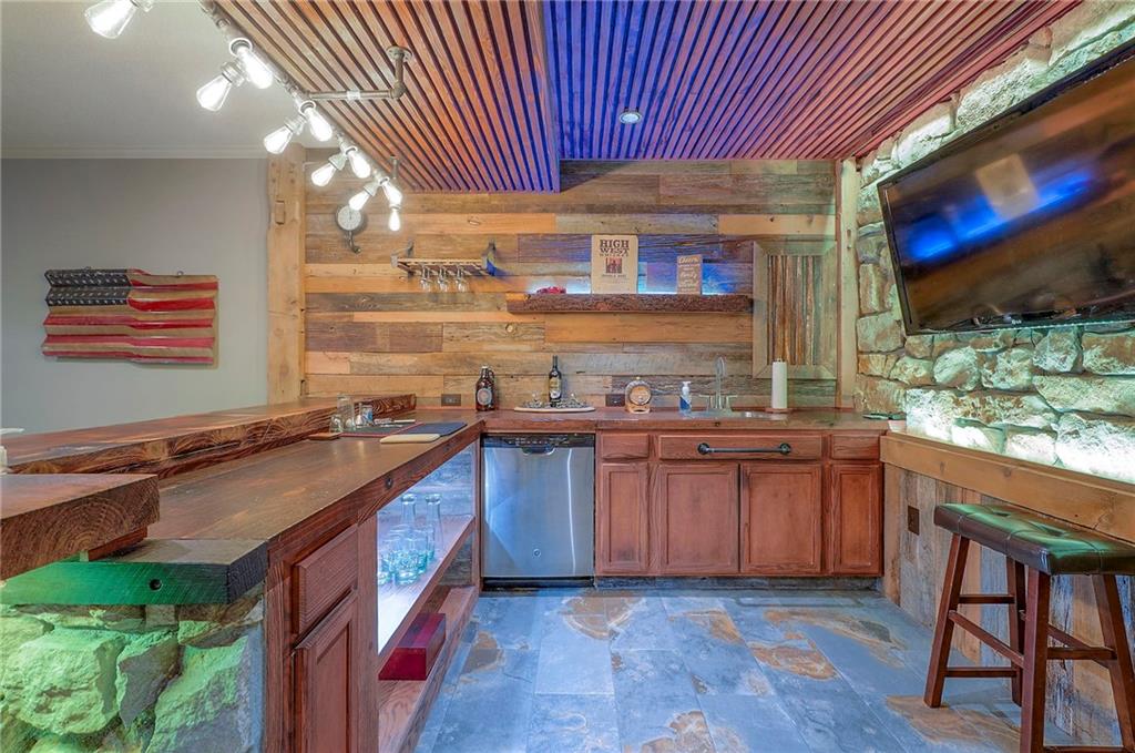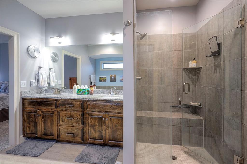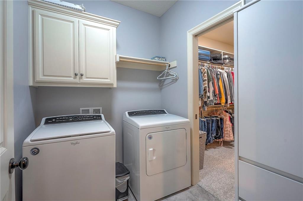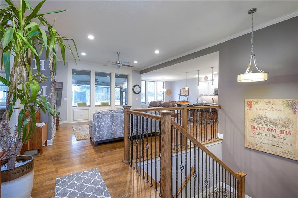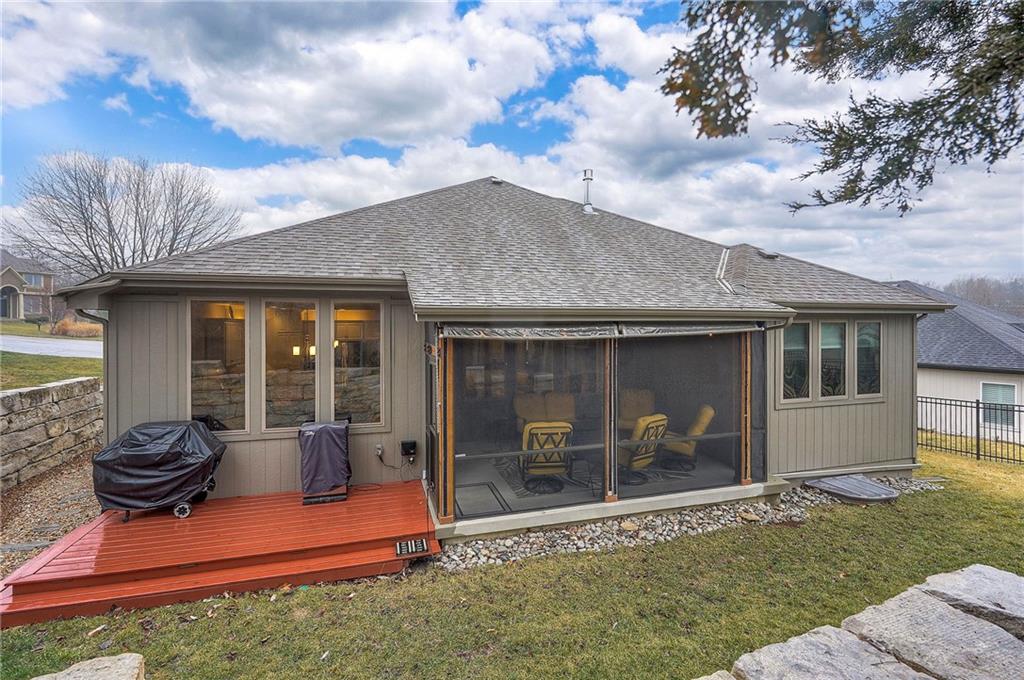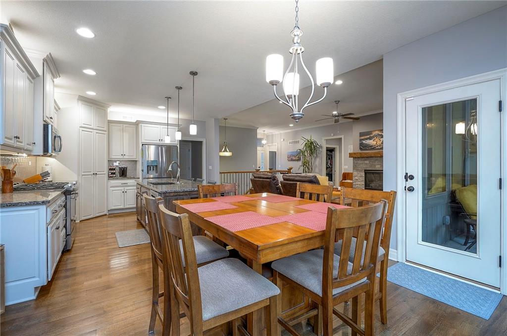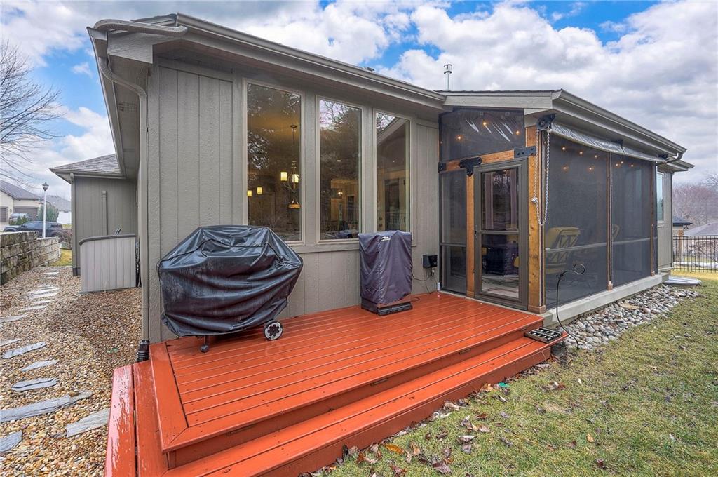 Nestled in a quiet cul-de-sac, this EXTREMELY WELL-MAINTAINED 2,800 SF ranch offers the ultimate in MAIN FLOOR LIVING. The open-concept design impresses with 10’ ceilings, wide-plank wood floors, and CROWN MOLDING throughout. A spacious chef’s kitchen serves as the heart of the home, featuring a large island, gas cooktop, deep walk-in pantry, and a generous dining area. The primary suite is a true retreat, boasting a soaker tub, dual vanity, and a walk-in shower with a seat that conveniently connects to the MAIN FLOOR LAUNDRY via the closet. Step outside to your private oasis: a SCREENED PATIO WITH AN EXTENDED ROOF and ceiling fan, overlooking UPGRADED LANDSCAPING with an engineered limestone retaining wall and berm—perfect for those seeking a TIDY YARD WITH LOW MAINTENANCE. The curb appeal is unmatched, featuring FRESH EXTERIOR PAINT (OCT 2025), GUTTER SCREENS, and PERMANENT CHRISTMAS LIGHTING for year-round ease. For the hobbyist, the 3-CAR GARAGE is a standout, fully equipped with a MINI-SPLIT AC/HEAT SYSTEM (SUMMER 2025). Inside, the home feels brand new with FRESH INTERIOR PAINT (2022) and NEWER CARPET THROUGHOUT. The finished basement is an entertainer's dream, showcasing high ceilings, a LARGE CUSTOM BAR (INCLUDES REFRIGERATOR), and an expansive game/media space, along with two additional bedrooms and a full bath. Additional high-value upgrades include a HAGUE WATER SOFTENER SYSTEM WITH A TRANSFERABLE WARRANTY, a 50-gallon water heater, a gas fireplace, and a durable 50-YEAR ROOF. This home combines luxury and practicality in an unbeatable location near K-10, I-35, premier shopping, dining, parks, and top-rated schools.