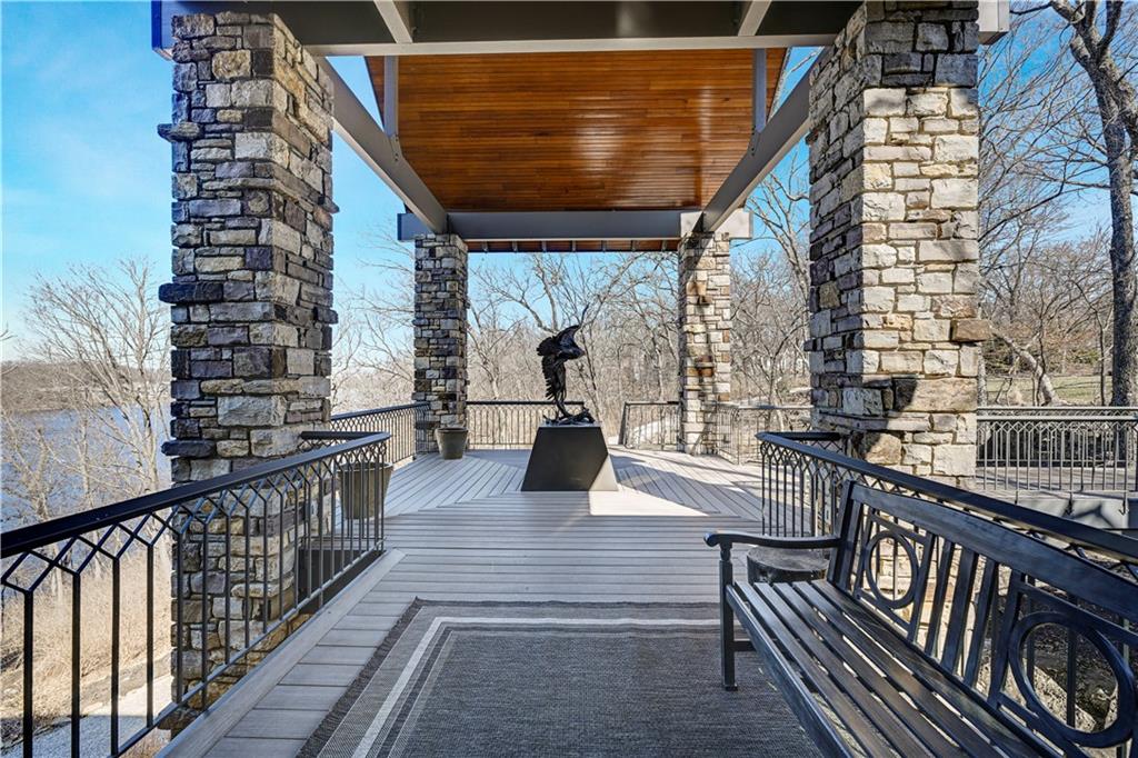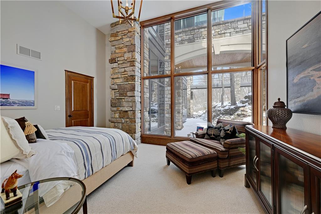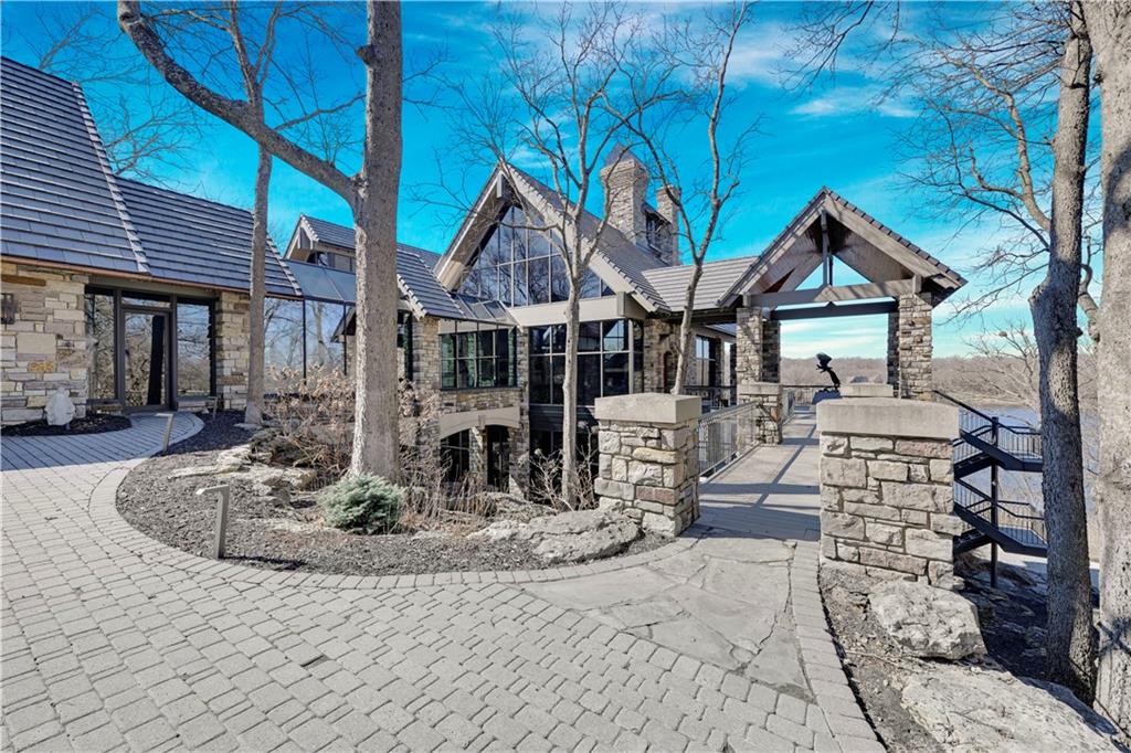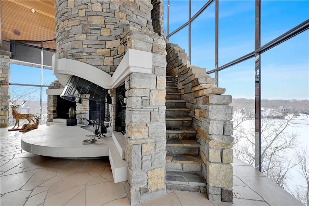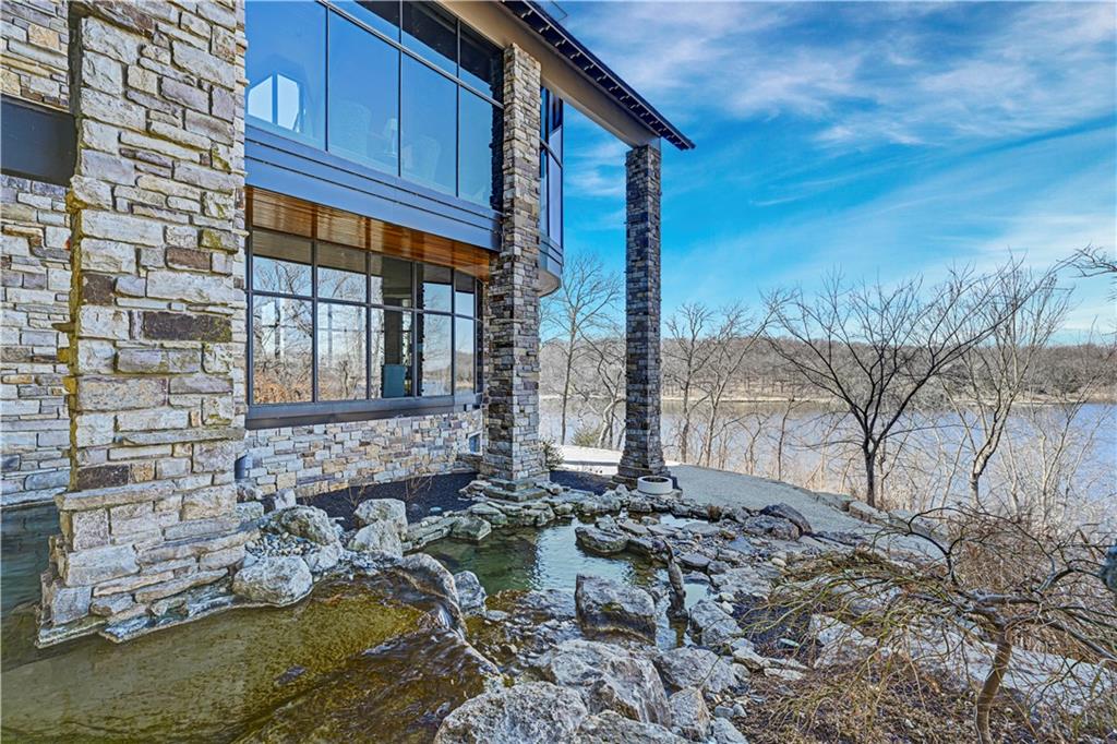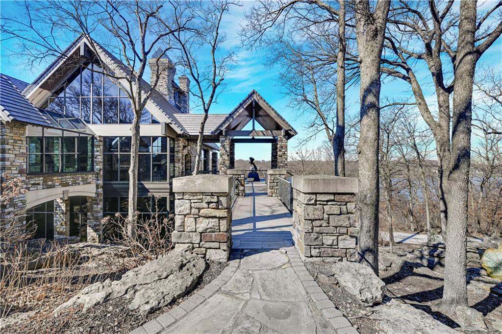 An architectural masterpiece rising from the shoreline, this iconic Loch Lloyd estate expertly fuses glass and stone to create the stunning effect of living within the landscape itself. The great room is a true "wow", anchored by a monumental, two-story stone fireplace and a soaring wood-plank cathedral ceiling. Tucked behind this massive hearth is a secret: a spiral staircase that climbs through the stone to a glass-walled lookout tower, and up even further to a deck atop the home, offering the most exclusive lake views in the community. Every level is designed to invite the outside in with walls of glass on all sides.The kitchen, featuring a secondary butler’s kitchen and seamlessly open to the great room, serves as the central hub for entertaining on the main level. The primary suite includes heated floors and a private loft. The primary bath is a serene spa-like setting with heated floors, dual vanities, a soaring vaulted ceiling, and separate tub and shower. The walk-out lower level is built for grand-scale hosting, centered around a massive family room with a fireplace, full bar and a full second kitchen. A passenger elevator offers ease of movement for people and entertaining equipment. This level also includes four additional bedrooms, two baths, and a second laundry room with dog wash station. Step down to a second lower level which features a large media/rec room plus a massage room for ultimate wellness. The grounds are a sensory and entertaining masterpiece with five tiered decks, an outdoor kitchen, firepit, cascading waterfall spilling into a koi ponds and custom outdoor art works scattered throughout the incredibly landscaped and wooded 2.5 acres. Despite the wow factor of the home, practicality abounds with features including a whole-house generator, new tile roof, and a 4-car garage. A rare fusion of nature and sophisticated design, every season is a new delight in this landmark home!