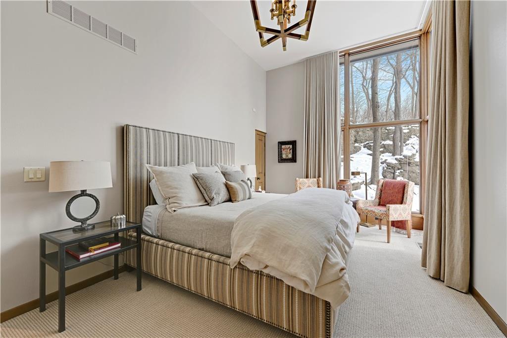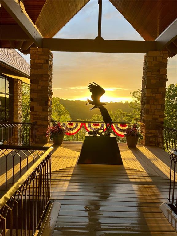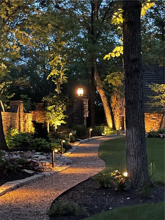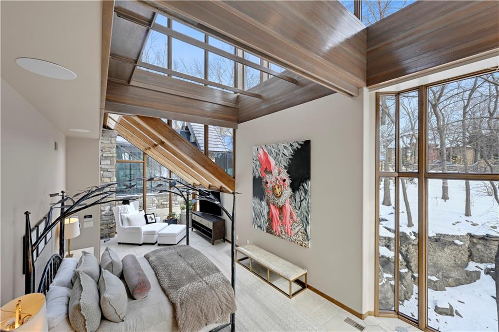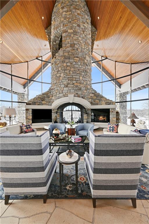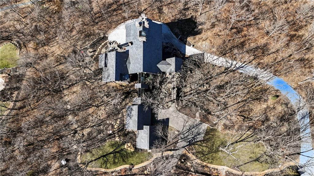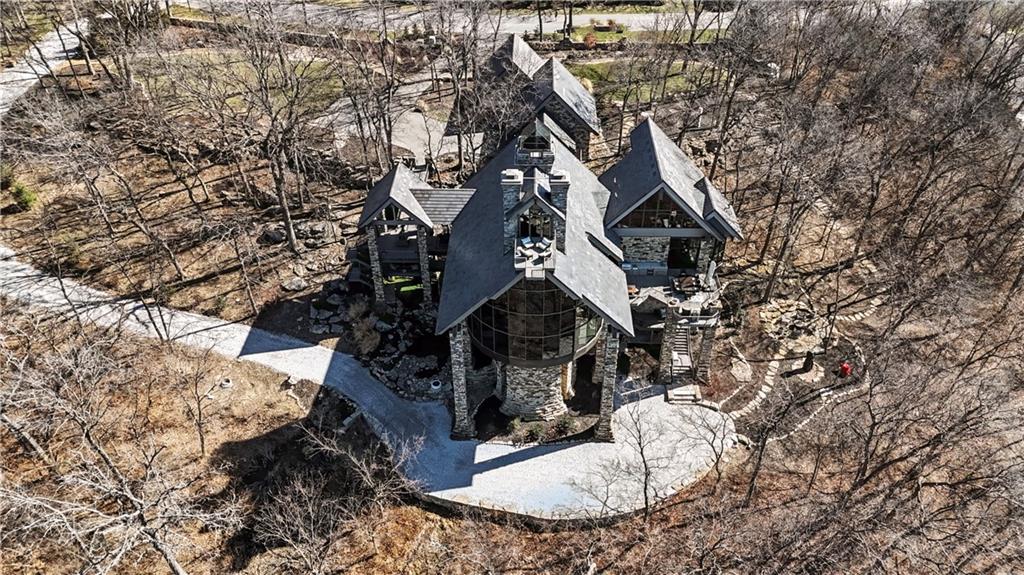 An architectural masterpiece rising from the shoreline, this iconic Loch Lloyd estate expertly fuses glass and stone to create the stunning effect of living within the landscape itself. The great room is a true "wow", anchored by a monumental, two-story stone fireplace and a soaring wood-plank cathedral ceiling. Tucked behind this massive hearth is a secret: a spiral staircase that climbs through the stone to a glass-walled lookout tower, and up even further to a deck atop the home, offering the most exclusive lake views in the community. Every level is designed to invite the outside in with walls of glass on all sides.The kitchen, featuring a secondary butler’s kitchen and seamlessly open to the great room, serves as the central hub for entertaining on the main level. The primary suite includes heated floors and a private loft. The primary bath is a serene spa-like setting with heated floors, dual vanities, a soaring vaulted ceiling, and separate tub and shower. The walk-out lower level is built for grand-scale hosting, centered around a massive family room with a fireplace, full bar and a full second kitchen. A passenger elevator offers ease of movement for people and entertaining equipment. This level also includes four additional bedrooms, two baths, and a second laundry room with dog wash station. Step down to a second lower level which features a large media/rec room plus a massage room for ultimate wellness. The grounds are a sensory and entertaining masterpiece with five tiered decks, an outdoor kitchen, firepit, cascading waterfall spilling into a koi ponds and custom outdoor art works scattered throughout the incredibly landscaped and wooded 2.5 acres. Despite the wow factor of the home, practicality abounds with features including a whole-house generator, new tile roof, and a 4-car garage. A rare fusion of nature and sophisticated design, every season is a new delight in this landmark home!