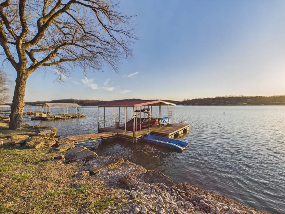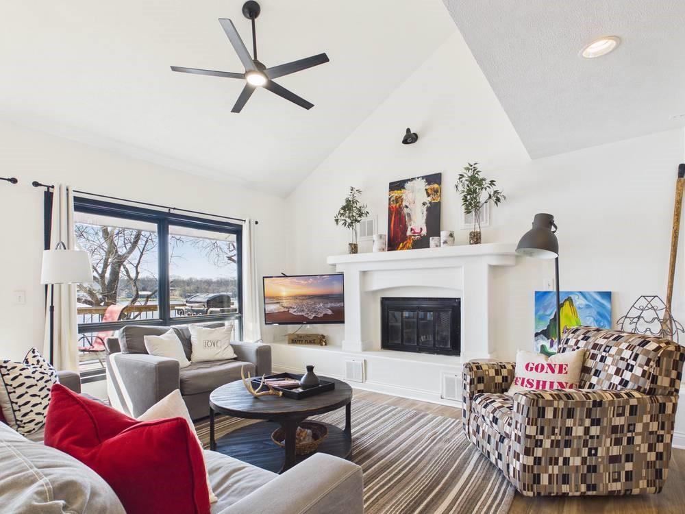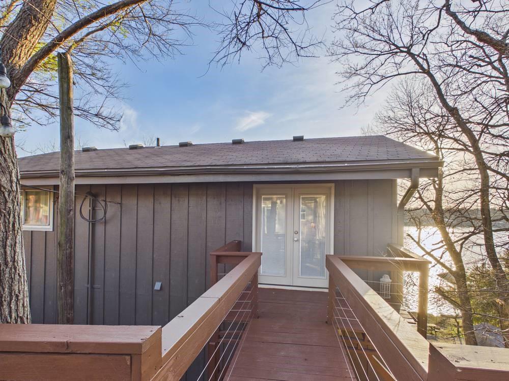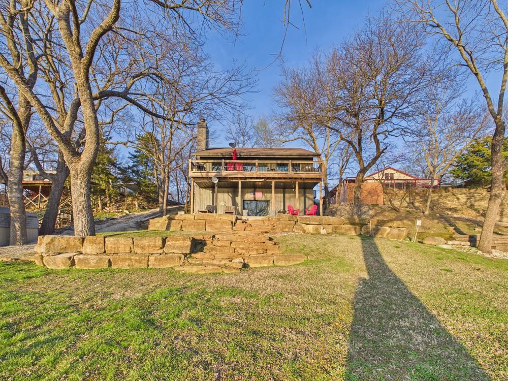 Situated on the tranquil shores of Lake Fort Scott, this fully furnished property features a charming main house and a separate recreation building, ideal for hosting guests and enjoying leisure time. The main house boasts three bedrooms and two-and-a-half bathrooms. Spanning three levels, the residence features a bright and airy open floor plan on the main level, highlighted by vaulted ceilings and modern stainless steel appliances in the kitchen. The expansive deck provides ample space for outdoor gatherings, while the lower-level covered patio serves as an additional entertainment area, ideal for relaxing by the lake. The separate recreation building enhances the property with an entertainment area, complete with a full bath, wet bar, sleeping area, and dining space, making it an excellent retreat for relaxation or entertaining. Additional perks include two storage sheds for convenience and a private boat dock complete with a lift, making it a perfect retreat just an hour and 15 minutes from the Kansas City area. Enjoy lakeside living at its finest! The exterior of the main house has just been completely repainted with wood repair and interior touch-ups. Lake Fort Scott has a $150 a year lake frontage fee and a monthly sewage bill paid to the city.