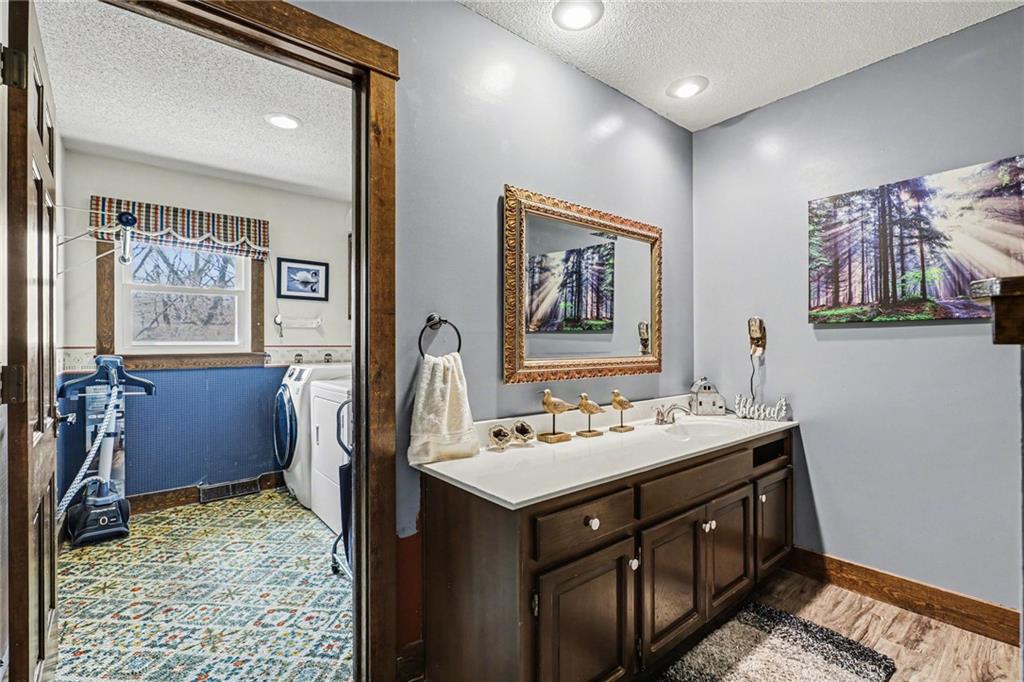 This charming, storybook home near the golf course is nestled on just over an acre with beautiful wooded views, offering character, space, and inviting farmhouse touches throughout. As you walk through the front door, you are greeted with original wood floors, open living spaces, and a gorgeous see through brick fireplace with a wood burning insert as the focal point of the living room. The dining room flows seamlessly from the living area and shares the two sided fireplace, while the spacious kitchen features granite countertops, a large pantry, and cottage inspired farmhouse charm. The primary bedroom is a true retreat with a bow window, hardwood floors, and an oversized walk in closet. The ensuite includes double sinks and a custom barn door. A second main level bedroom with its own bathroom, along with additional half baths, a laundry room, and a three car garage, complete the main floor. Upstairs offers two bedrooms and a full bathroom. The finished basement adds extra living space with a large recreation area, custom shuffleboard, a bedroom, full bathroom, generous storage, and a fourth garage, plus potential for a non conforming fifth bedroom or second kitchen. Outside, enjoy a spacious fenced backyard with a deck, covered gazebo, and patio, all backing to woods with golf course views. A charming fire pit with swings adds the perfect touch for relaxing or entertaining.