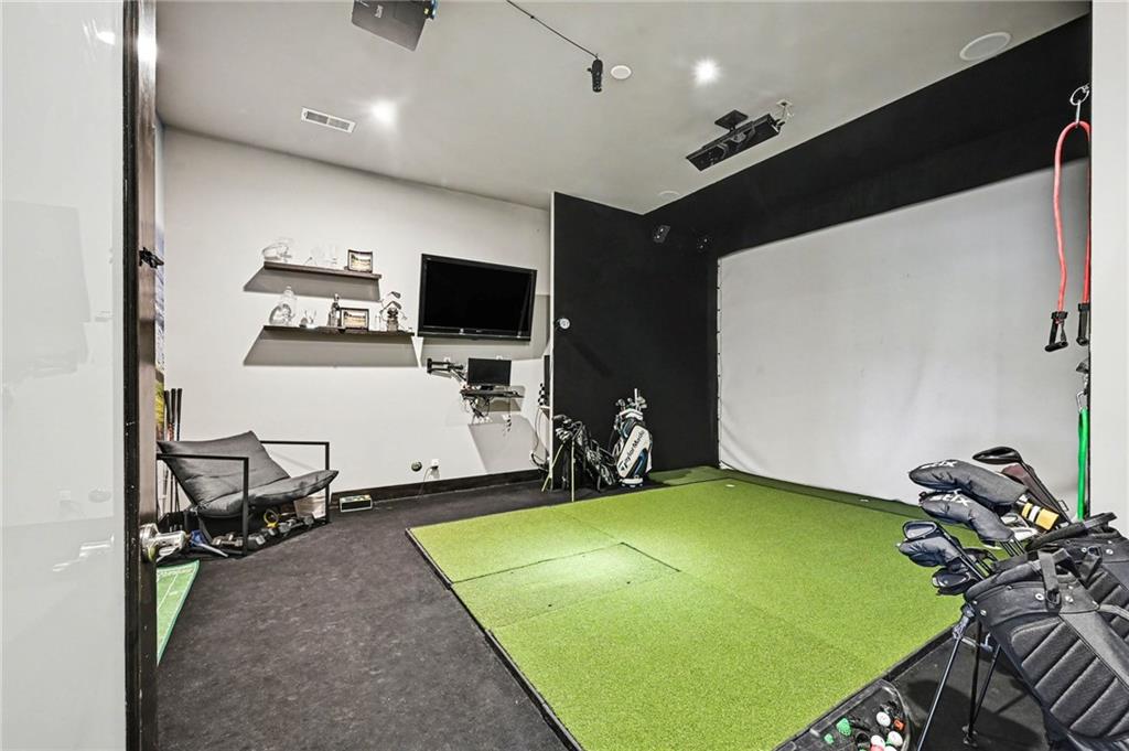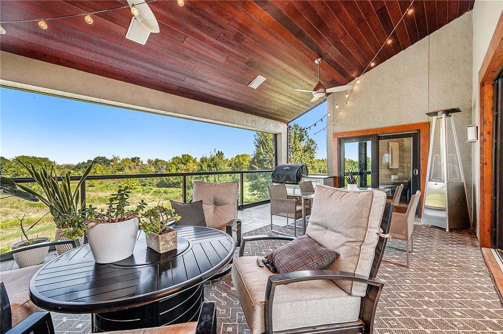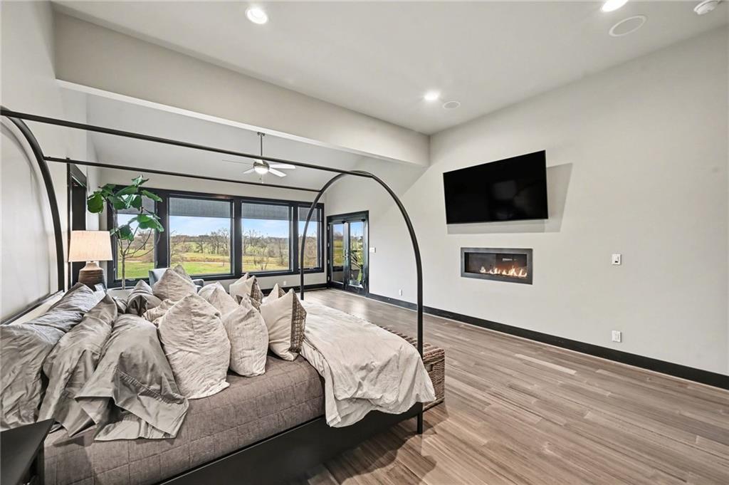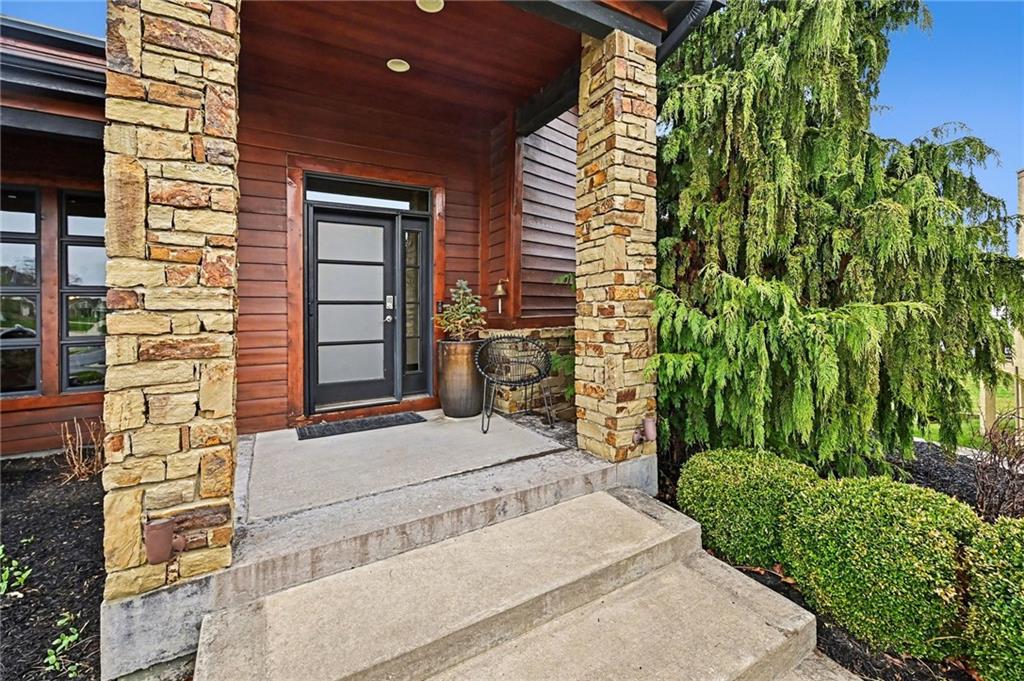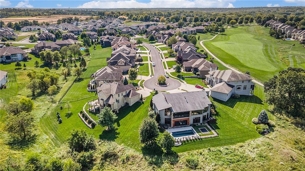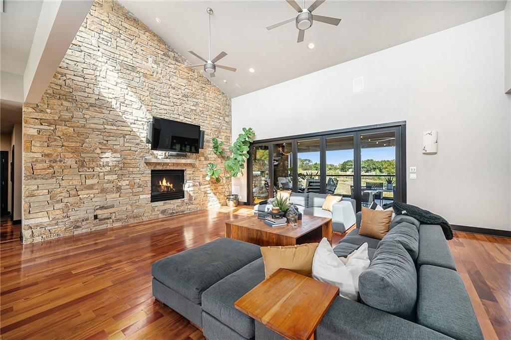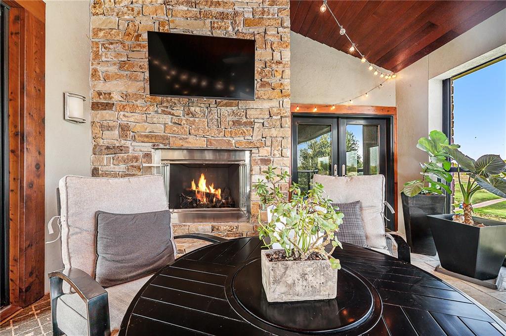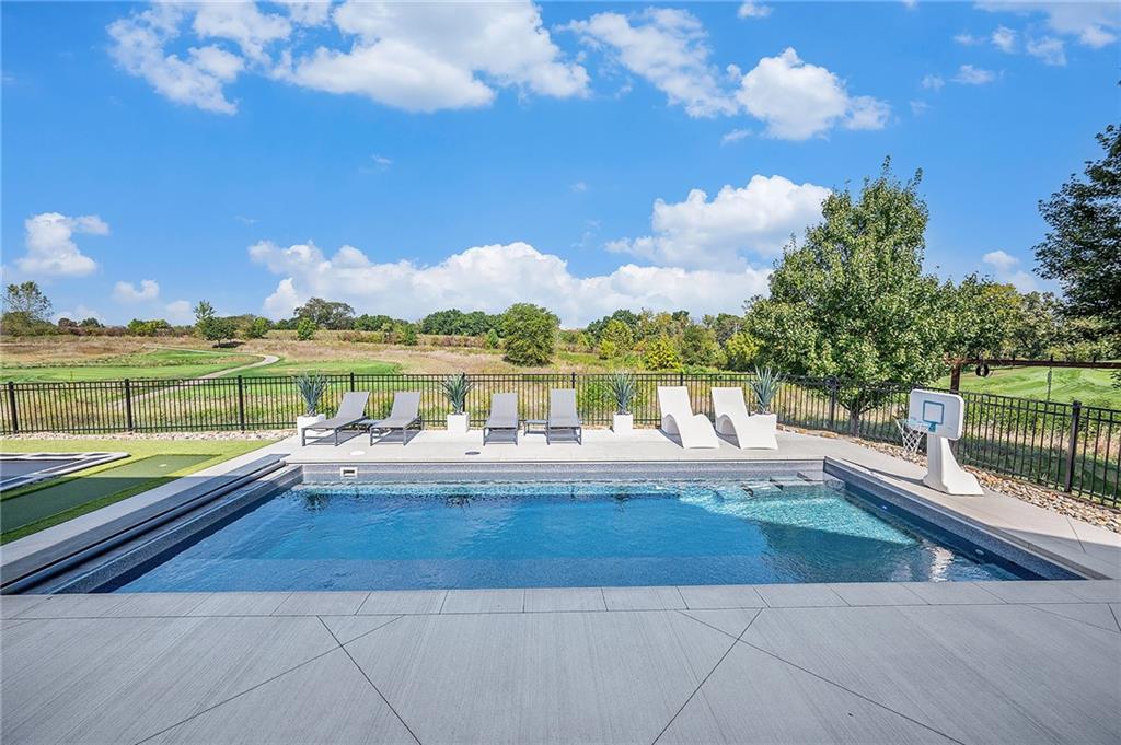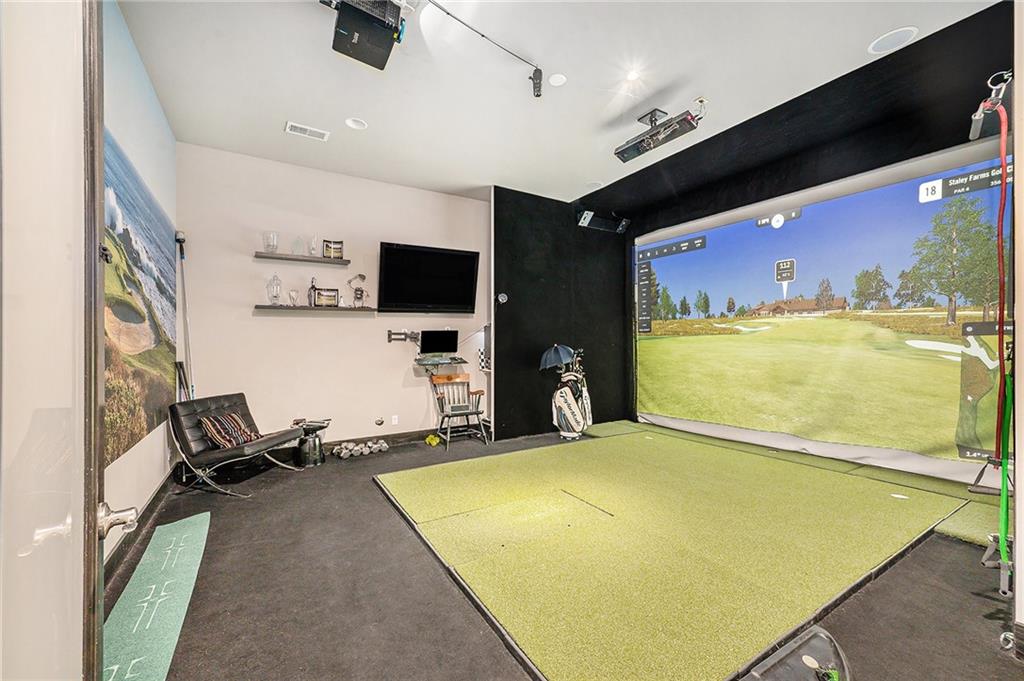 New Roof - Modern Golf Course Retreat w/ Resort-Style Outdoor Living, a striking contemporary residence with open-concept design & exceptional golf course views, ideally positioned in a quiet cul-de-sac along the 10th fairway. This impressive home blends architectural sophistication with everyday comfort. The cedar and stucco front elevation sets the tone for the distinctive design found throughout. Inside, the main level showcases Brazilian Koa hardwood flooring, expansive living spaces, and a dramatic stone fireplace wall anchoring the great room. A stunning 20-foot panoramic door system seamlessly connects the interior to the covered outdoor living area, creating effortless indoor-outdoor flow. The recently remodeled chef’s kitchen is both stylish and highly functional. A walk-in pantry, formal dining room, and charming breakfast room with built-in bench seating complete the space. The main-level office offers built-ins and french glass doors for privacy, ideal for working from home. The luxurious primary suite provides a peaceful retreat, featuring three closets, a spa-inspired bath with soaker tub overlooking the golf course, dual vanity with concrete sinks, large shower, and direct deck access for evening relaxation. The suite also includes a convenient stacked washer and dryer hookup. Designed for entertaining, the lower level offers a spacious recreation room with custom lighting, plus a stylish wet bar. A dedicated golf simulator room provides year-round practice or can easily convert into a fitness studio. Three architecturally interesting en-suite bedrooms, each with walk-in closets, provide comfort and privacy for family or guests. The lower level also features a large laundry room with cabinetry, plus a hallway study area with built-ins. The outdoor amenities continue with a 30’ x 14’ fiberglass heated pool with chiller, turf lawn, in-ground trampoline, hot tub, and beautifully designed paver patio with a garage-style opening wall for incredible views.