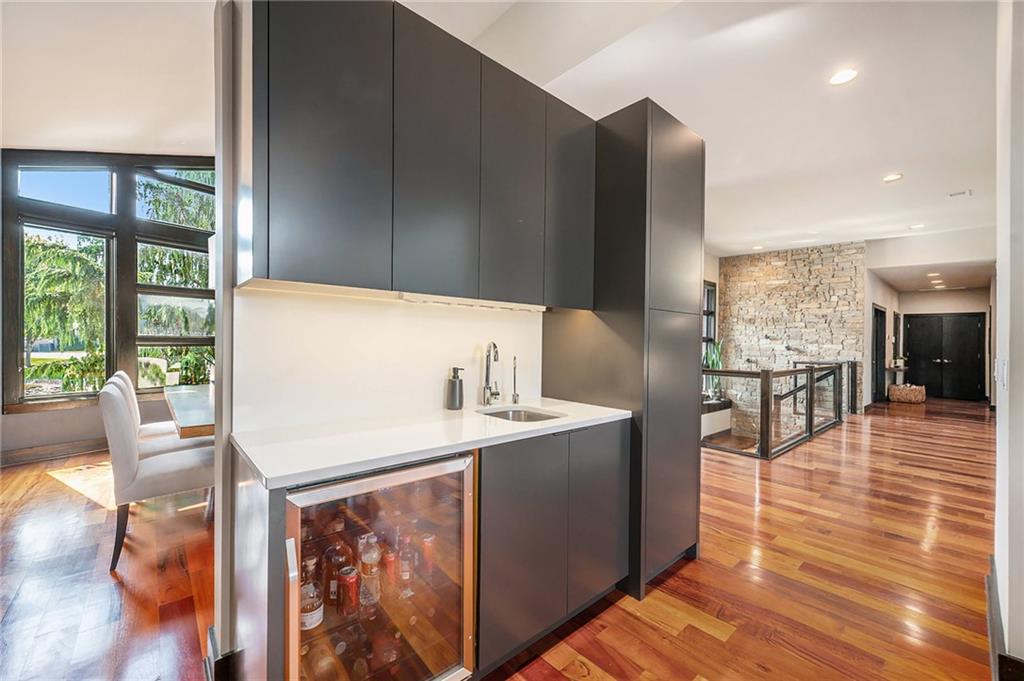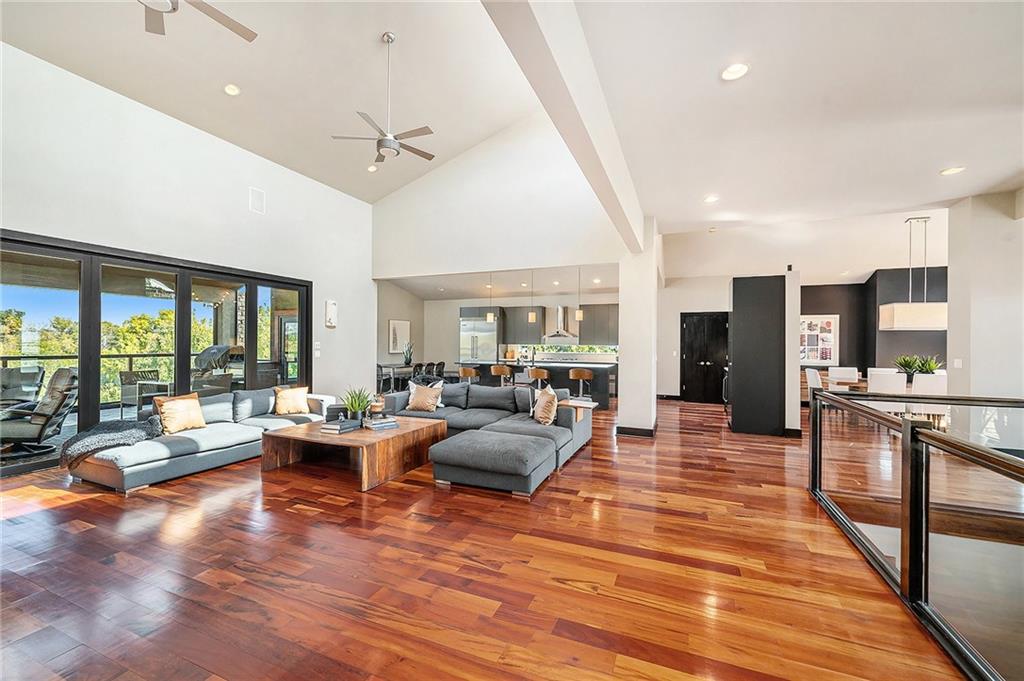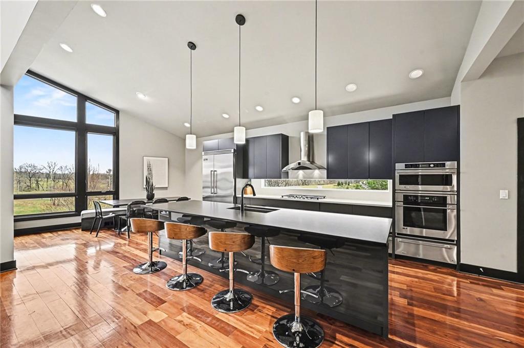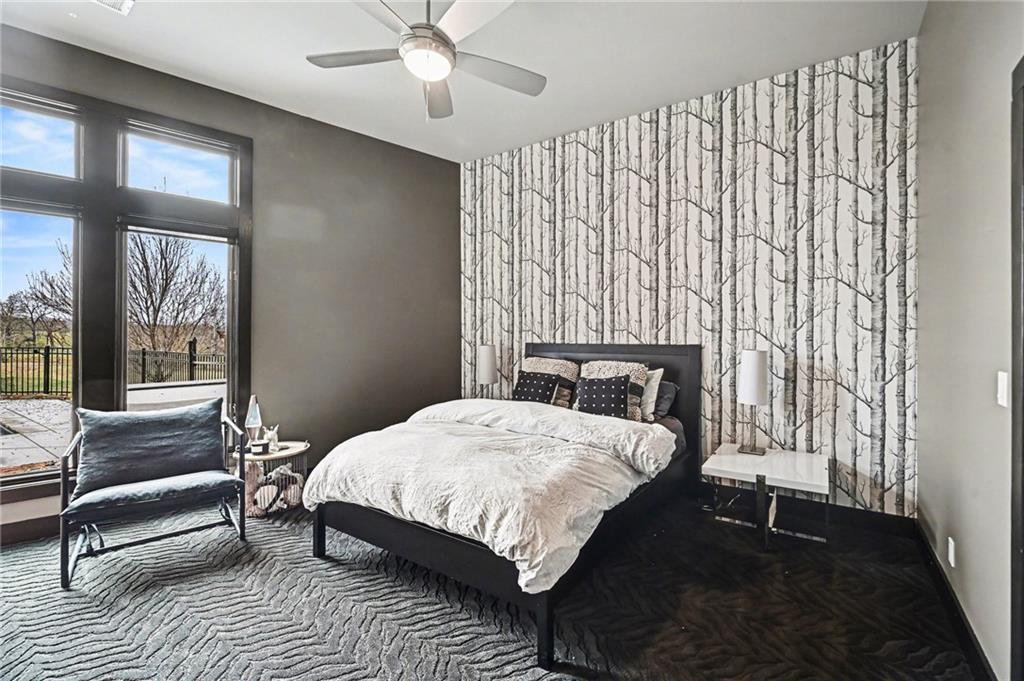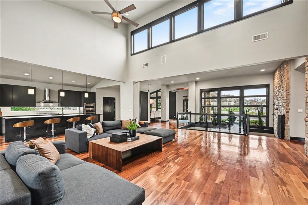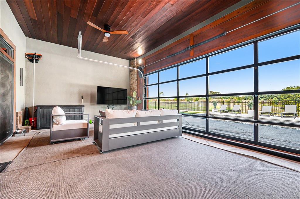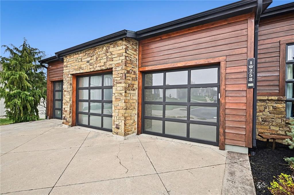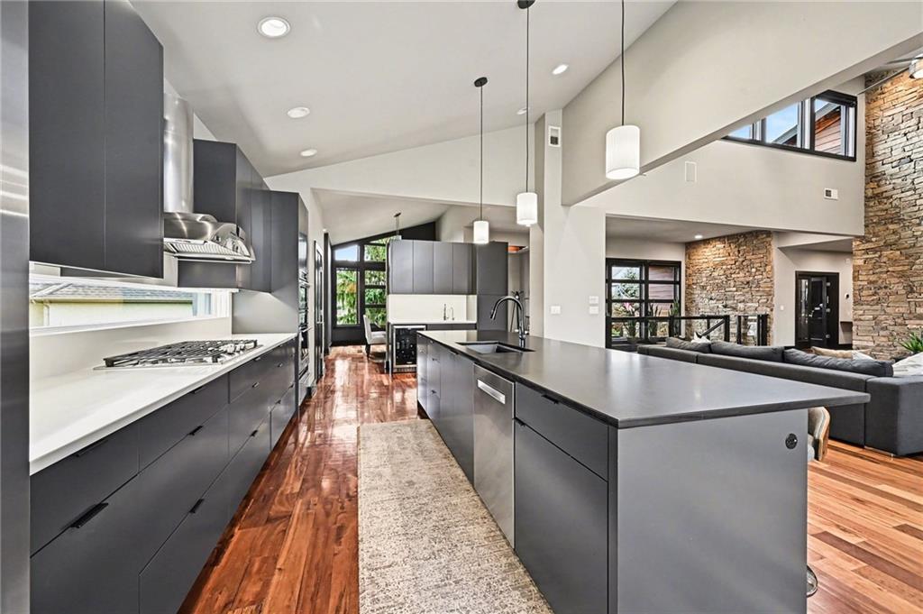 New Roof - Modern Golf Course Retreat w/ Resort-Style Outdoor Living, a striking contemporary residence with open-concept design & exceptional golf course views, ideally positioned in a quiet cul-de-sac along the 10th fairway. This impressive home blends architectural sophistication with everyday comfort. The cedar and stucco front elevation sets the tone for the distinctive design found throughout. Inside, the main level showcases Brazilian Koa hardwood flooring, expansive living spaces, and a dramatic stone fireplace wall anchoring the great room. A stunning 20-foot panoramic door system seamlessly connects the interior to the covered outdoor living area, creating effortless indoor-outdoor flow. The recently remodeled chef’s kitchen is both stylish and highly functional. A walk-in pantry, formal dining room, and charming breakfast room with built-in bench seating complete the space. The main-level office offers built-ins and french glass doors for privacy, ideal for working from home. The luxurious primary suite provides a peaceful retreat, featuring three closets, a spa-inspired bath with soaker tub overlooking the golf course, dual vanity with concrete sinks, large shower, and direct deck access for evening relaxation. The suite also includes a convenient stacked washer and dryer hookup. Designed for entertaining, the lower level offers a spacious recreation room with custom lighting, plus a stylish wet bar. A dedicated golf simulator room provides year-round practice or can easily convert into a fitness studio. Three architecturally interesting en-suite bedrooms, each with walk-in closets, provide comfort and privacy for family or guests. The lower level also features a large laundry room with cabinetry, plus a hallway study area with built-ins. The outdoor amenities continue with a 30’ x 14’ fiberglass heated pool with chiller, turf lawn, in-ground trampoline, hot tub, and beautifully designed paver patio with a garage-style opening wall for incredible views.