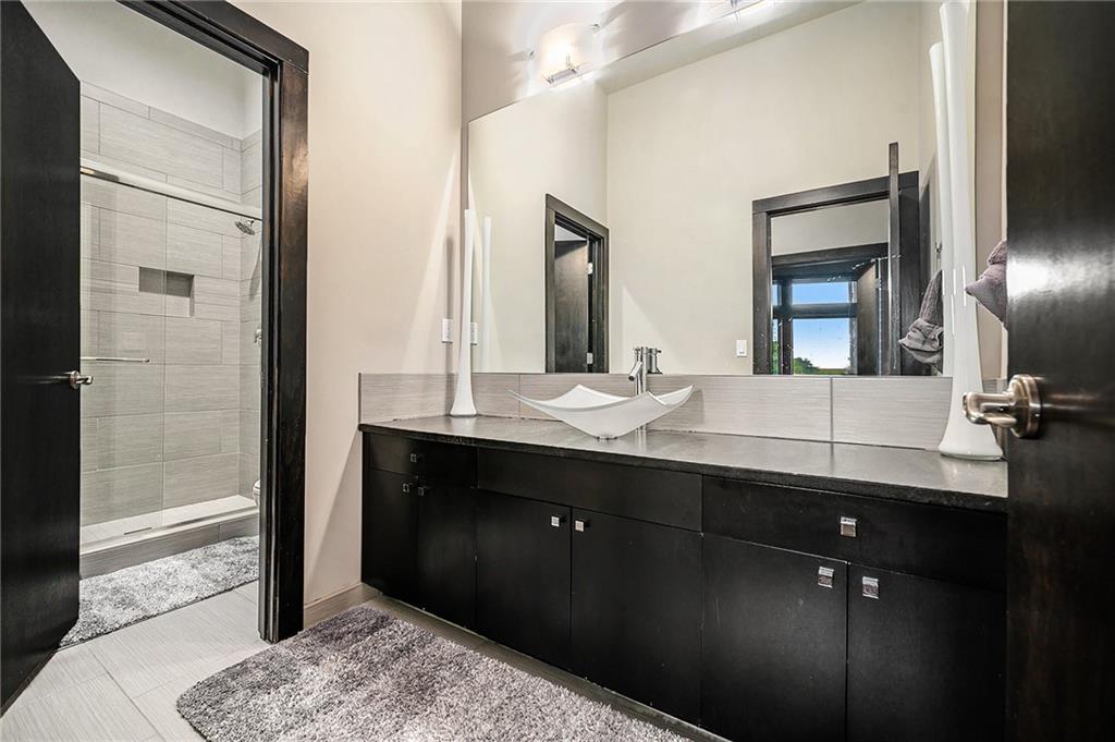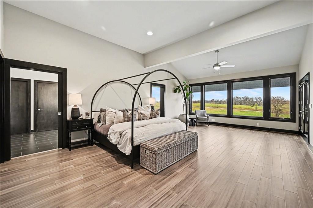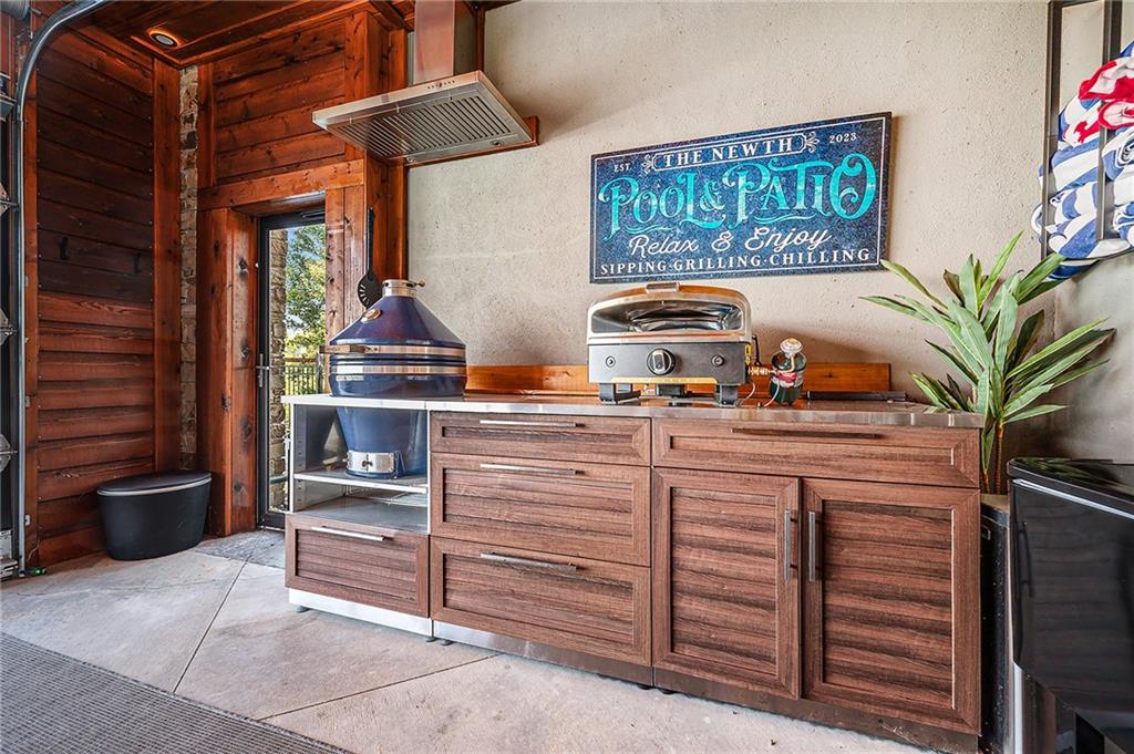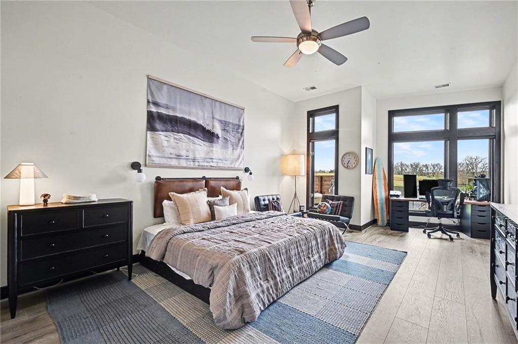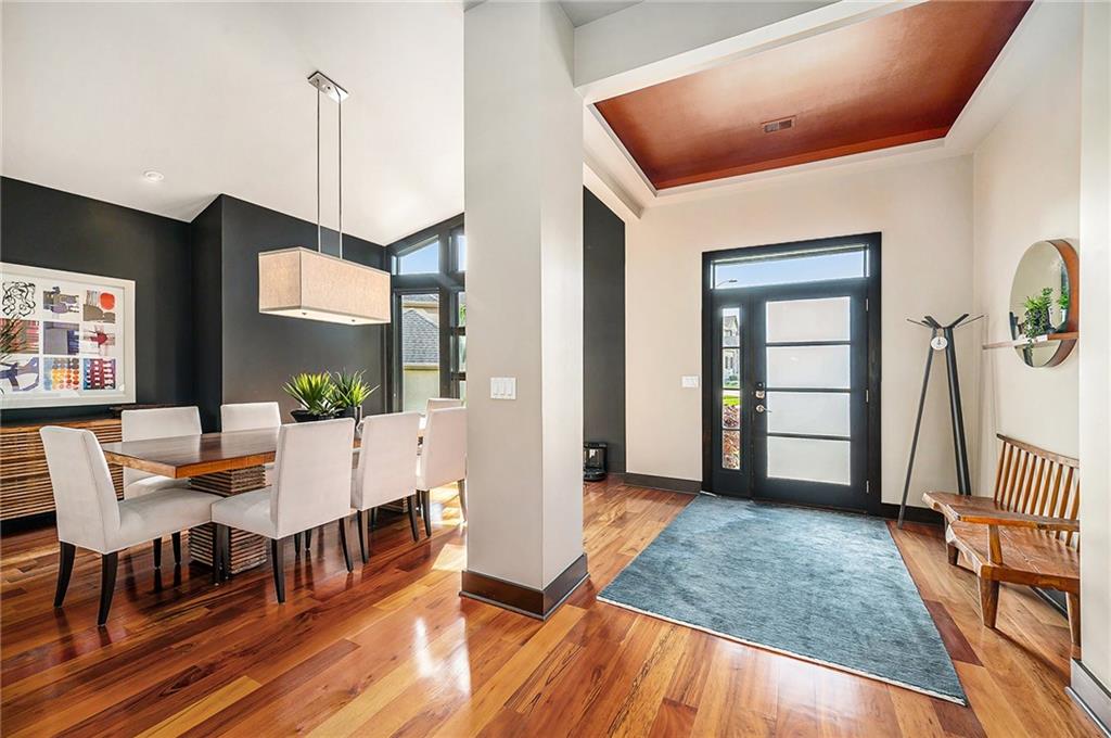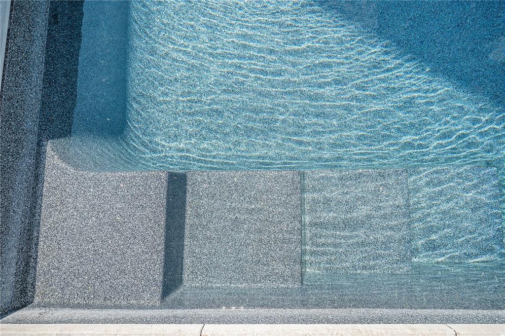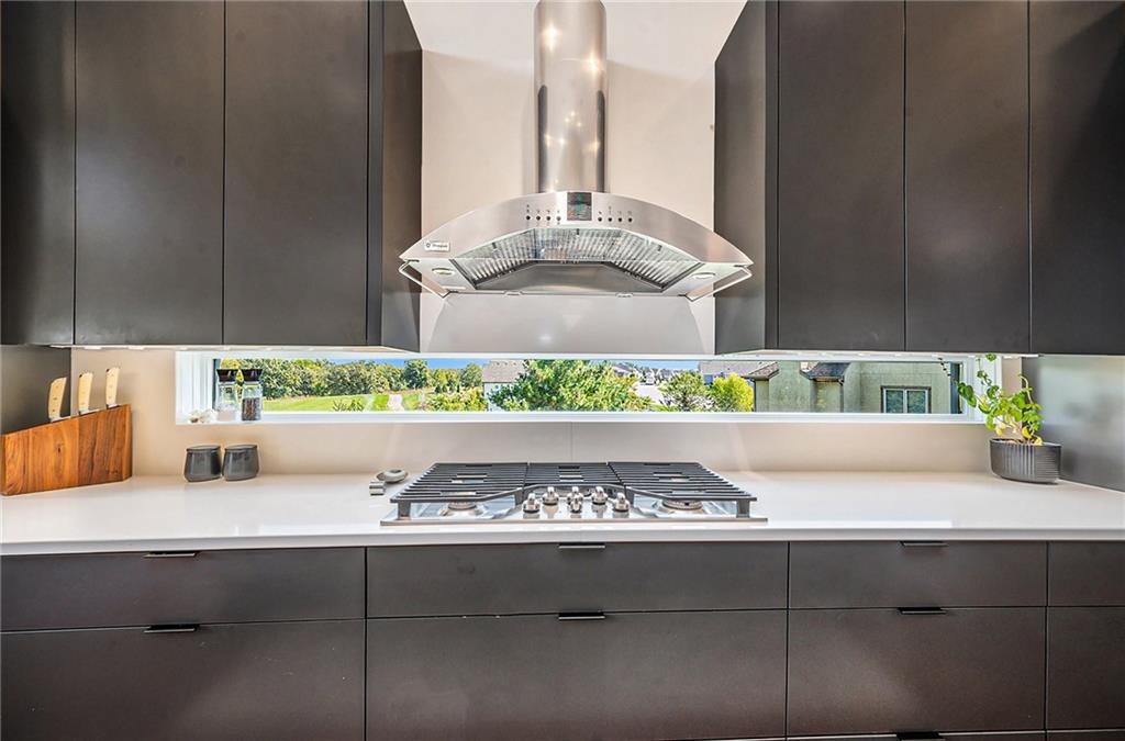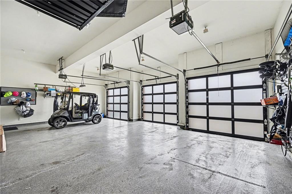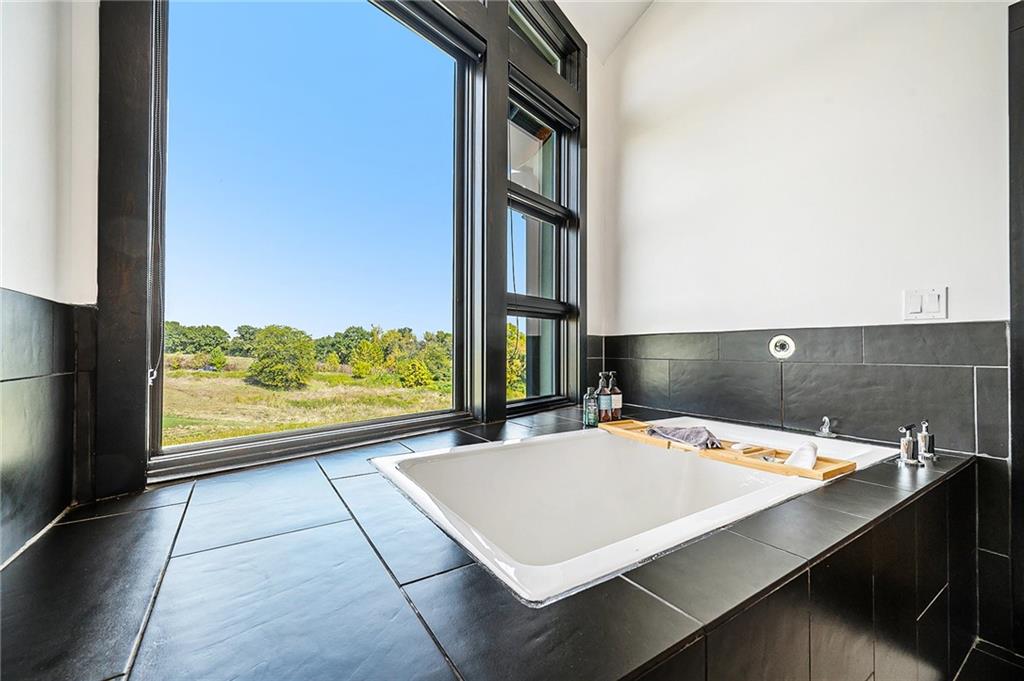 New Roof - Modern Golf Course Retreat w/ Resort-Style Outdoor Living, a striking contemporary residence with open-concept design & exceptional golf course views, ideally positioned in a quiet cul-de-sac along the 10th fairway. This impressive home blends architectural sophistication with everyday comfort. The cedar and stucco front elevation sets the tone for the distinctive design found throughout. Inside, the main level showcases Brazilian Koa hardwood flooring, expansive living spaces, and a dramatic stone fireplace wall anchoring the great room. A stunning 20-foot panoramic door system seamlessly connects the interior to the covered outdoor living area, creating effortless indoor-outdoor flow. The recently remodeled chef’s kitchen is both stylish and highly functional. A walk-in pantry, formal dining room, and charming breakfast room with built-in bench seating complete the space. The main-level office offers built-ins and french glass doors for privacy, ideal for working from home. The luxurious primary suite provides a peaceful retreat, featuring three closets, a spa-inspired bath with soaker tub overlooking the golf course, dual vanity with concrete sinks, large shower, and direct deck access for evening relaxation. The suite also includes a convenient stacked washer and dryer hookup. Designed for entertaining, the lower level offers a spacious recreation room with custom lighting, plus a stylish wet bar. A dedicated golf simulator room provides year-round practice or can easily convert into a fitness studio. Three architecturally interesting en-suite bedrooms, each with walk-in closets, provide comfort and privacy for family or guests. The lower level also features a large laundry room with cabinetry, plus a hallway study area with built-ins. The outdoor amenities continue with a 30’ x 14’ fiberglass heated pool with chiller, turf lawn, in-ground trampoline, hot tub, and beautifully designed paver patio with a garage-style opening wall for incredible views.