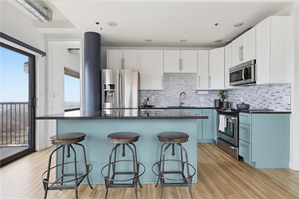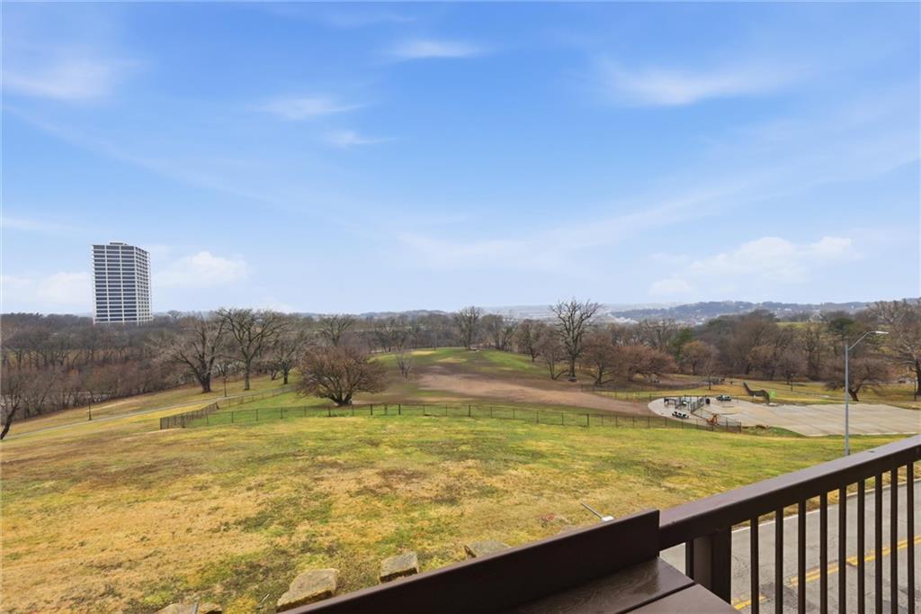 Enjoy stunning views of Penn Valley Park from the kitchen, living room, and primary bedroom in this bright and open 2-bedroom, 2-bath condo. The updated modern kitchen features a spacious 6-foot center island, perfect for cooking and entertaining. Step onto the private balcony to take in beautiful downtown views. The large primary suite offers a generous bath and two walk-in closets for excellent storage. Recent updates include refinished hardwood floors, new paint throughout, tinted windows, and a new HVAC system. Additional features include in-unit laundry and a light, bright, open layout. The building offers corporate-style amenities including a pool and fitness center. This unit also comes with two parking spaces—one dedicated lot space and one leased garage space—plus a basement storage unit. Ideally located near shopping, dining, and downtown attractions, with convenient access to venues hosting events for the 2026 FIFA World Cup.