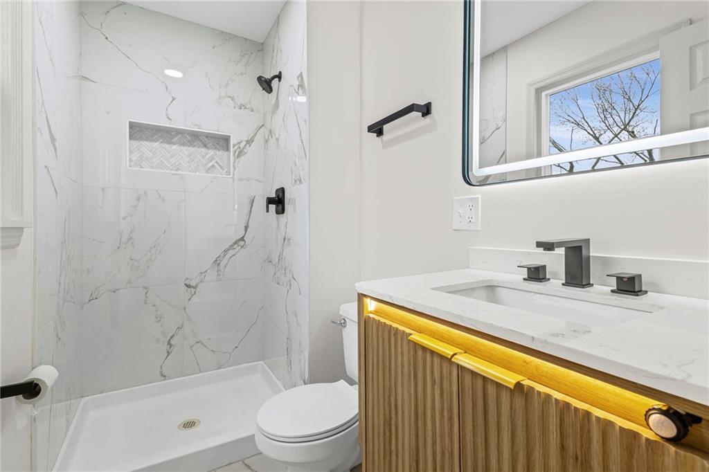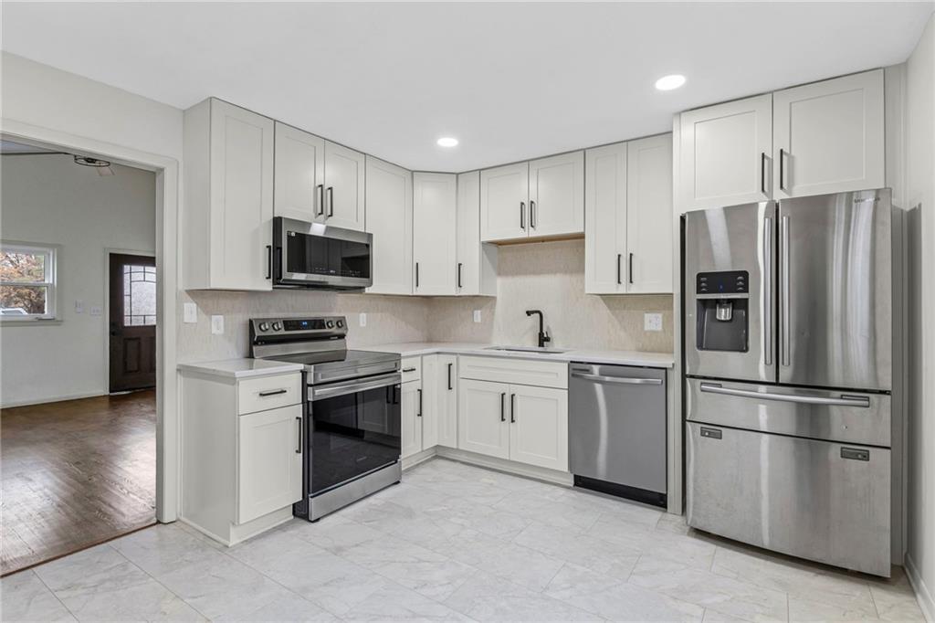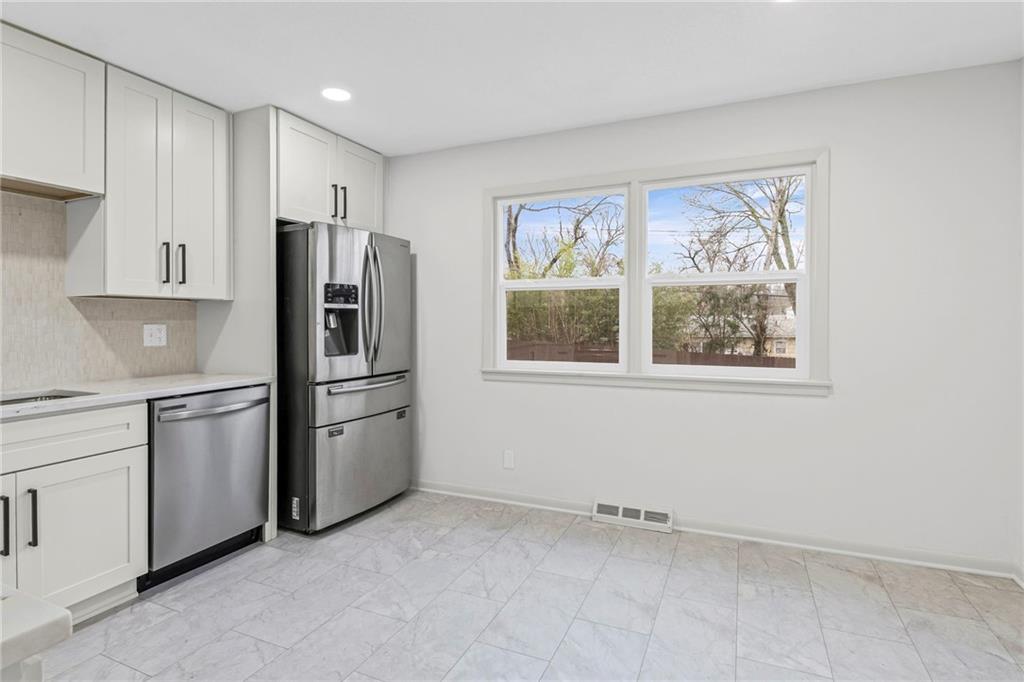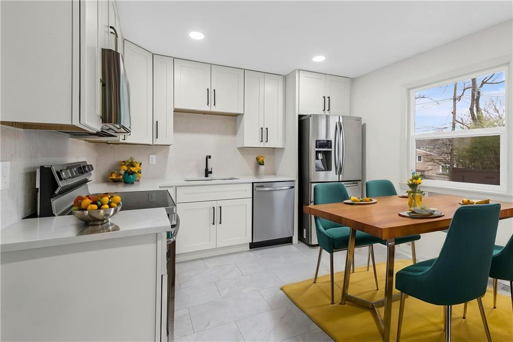 Stylish mid-century inspired home with a unique tri-level layout and beautifully updated interior.This 3 bedroom, 2 bathroom home offers vaulted ceilings, rich hardwood floors, and abundant natural light throughout the main living space. The updated kitchen includes white shaker cabinets, quartz countertops, stainless steel appliances, and modern tile backsplash with dining space nearby. Upstairs you'll find three bedrooms and two fully renovated bathrooms with stylish tile surrounds and modern vanities. The finished lower level provides a spacious second living area or family room, perfect for entertaining, a home office, or media space. Additional highlights include an attached garage with epoxy flooring, updated finishes throughout, and a large yard with mature trees. Move-in ready with style, function, and character.