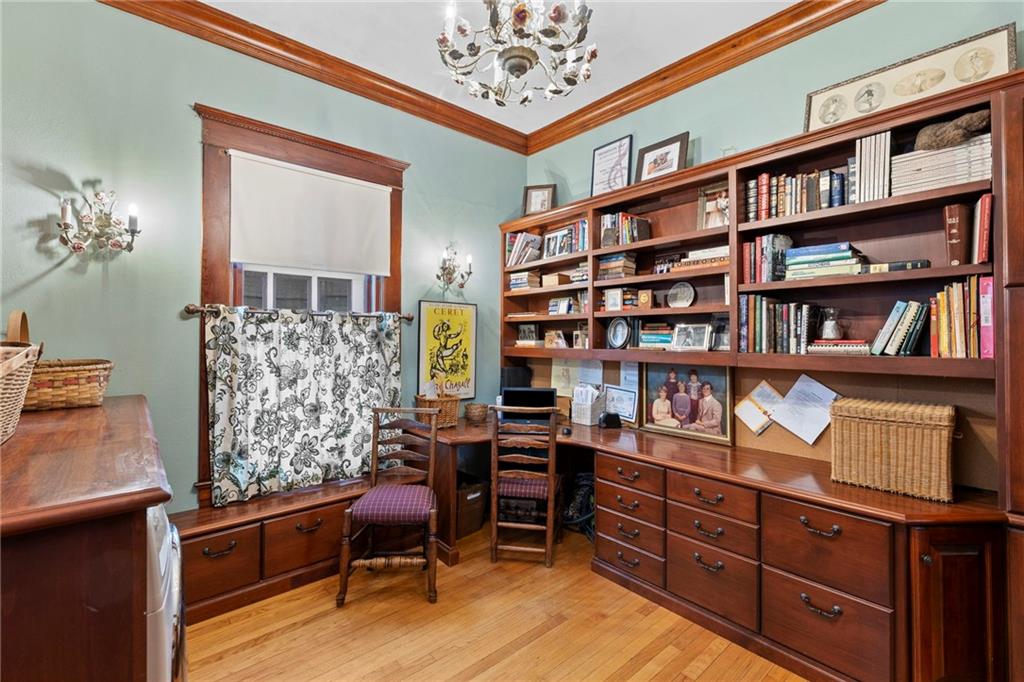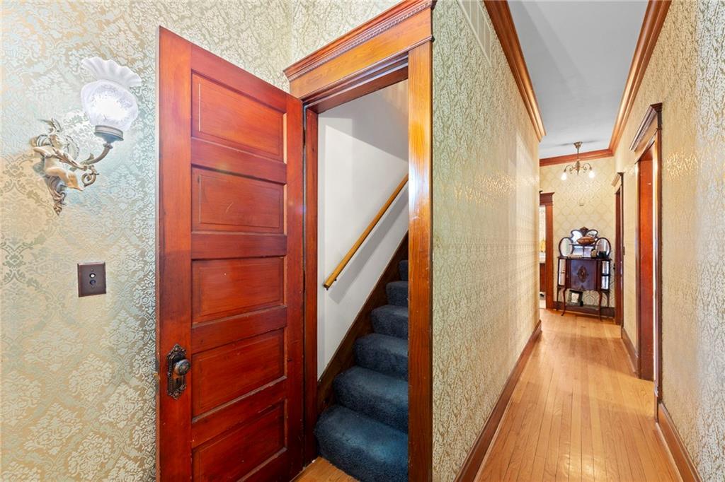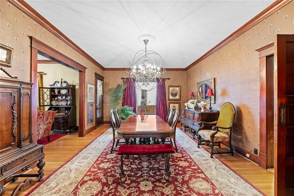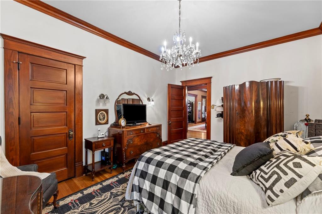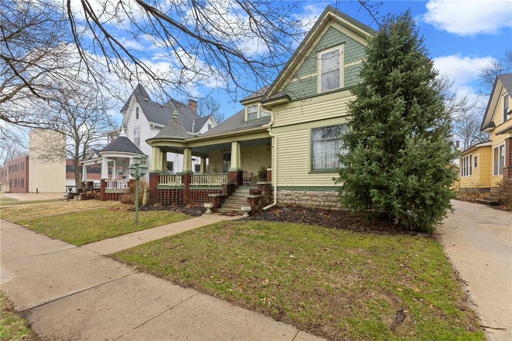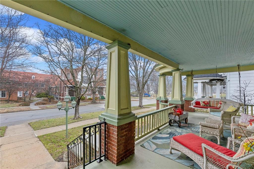 Expect to be impressed as you step into the timeless elegance of the "Washburn" house, a rare residence that masterfully blends old-world charm with sophisticated modern comfort. Meticulously updated while preserving its historic integrity, this home showcases authentic craftsmanship through unique chandeliers, ornate trim, wide crown and baseboard moldings, and original solid wood interior doors. The architectural character shines in the 3 sets of beautiful pocket doors and the lead glass windows that grace the front of the home, while modern peace of mind is provided by newer windows throughout the rest of the house and a central heat and air system installed within the last 5 years. A large, covered front porch invites you into a grand entry room, flanked by an elegant living room featuring an original fireplace and a lovely, sunlit parlor. The gourmet kitchen is a chef's dream, boasting cherry cabinetry, a quartz island, and high-end appliances including a gas stove and a new convection oven with air-frying capabilities. Two butler doors offer seamless flow into the massive formal dining room, perfect for hosting memorable gatherings. The main level features gorgeous hardwood floors and houses 3 spacious bedrooms—including a primary suite —all equipped with walk-in cedar closets and accompanied by 2 full. bathrooms. Upstairs you will find a fourth bedroom, a third bathroom, a cozy den, and a sprawling unfinished area brimming with potential for additional living space. With laundry hookups available on both the main floor and the basement, a detached garage with a finished room above, and a courtyard-style yard ideal for summer barbecues, this property is truly one of a kind. Located within walking distance of the historic Paola square, this home is ready for its next chapter—schedule your private tour today!