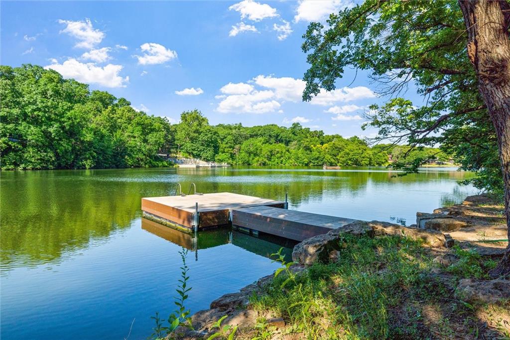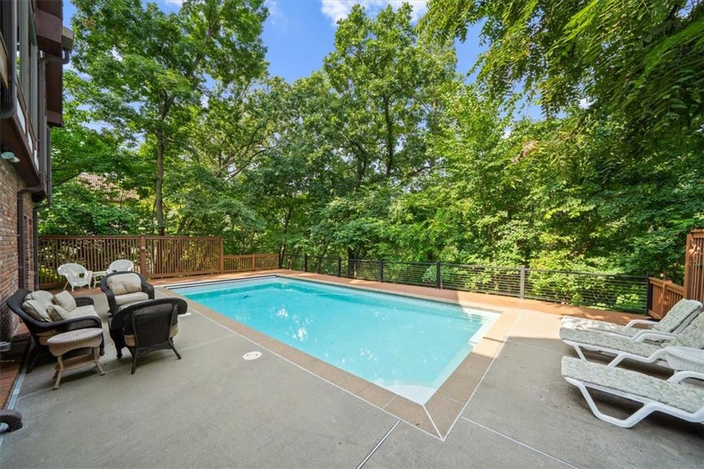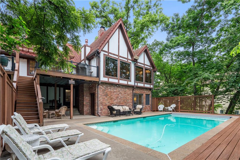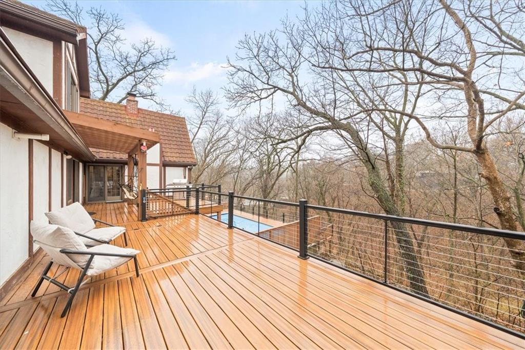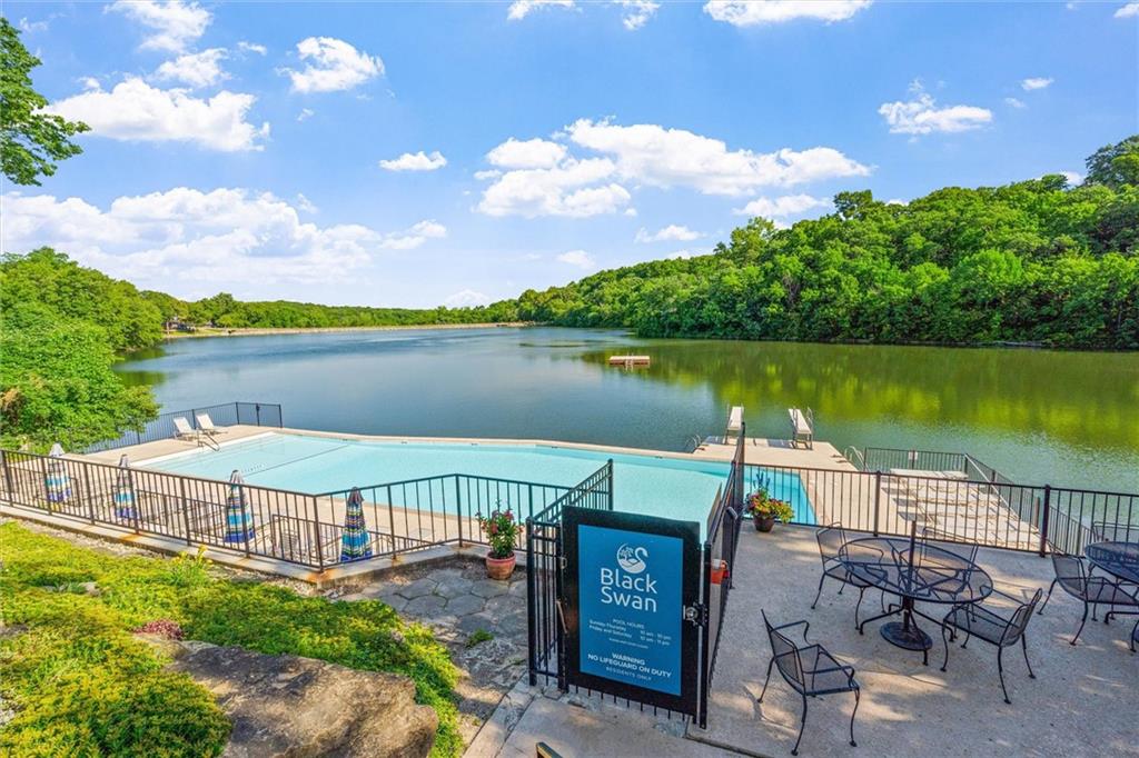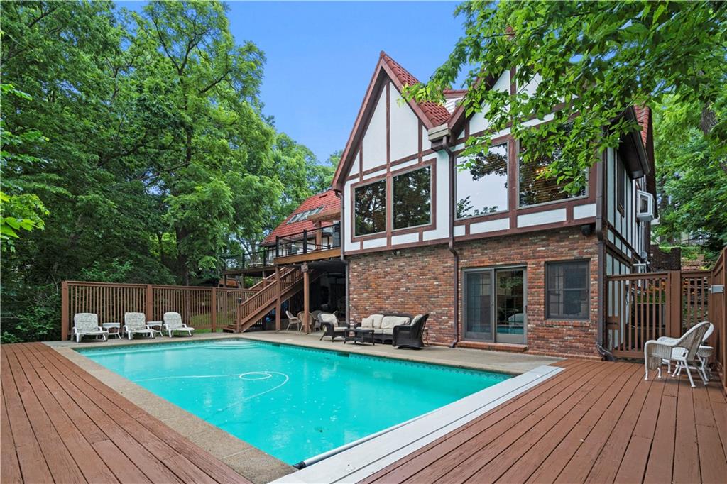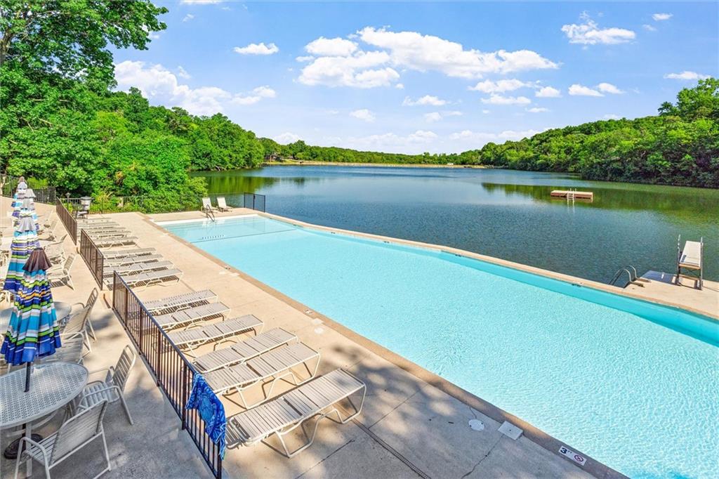 Here’s your chance to own something truly special—nestled in nature’s beauty yet just minutes from downtown Shawnee. This 5-bedroom home sits on nearly an acre and offers beautiful curb appeal, extensive landscaping, and exceptional design throughout. The main level features a spacious great room with open-beam cathedral ceilings and a floor-to-ceiling fireplace, along with a large kitchen that includes an island, eating bar, and breakfast area. The main-floor primary suite provides convenience and privacy along with a large walk-in closet, dual vanities and direct patio access. You’ll also find a vaulted formal dining room, a flexible den or office, and a bright sitting room that looks out over the pool and sunsets. Wood floors and large windows throughout much of the main level bring in plenty of natural light. Upstairs are three generously sized bedrooms, a full bath, skylights, and lots of storage. The finished lower level adds additional living space with a rec room and fireplace, full bath, laundry area, workshop, and a fifth bedroom with a wet bar/kitchenette—ideal for pool traffic. Step outside from the living room or primary suite to enjoy the low-maintenance deck, relax on the patio, or spend time in the in-ground pool. There’s also a tiered terrace that provides a nice spot to unwind. Dive into your private pool or take a refreshing swim in the lake—welcome to Black Swan, a hidden gem of a private lake community.