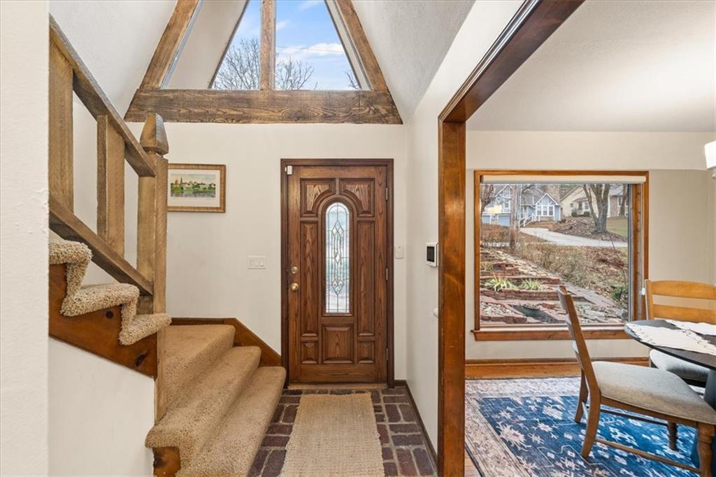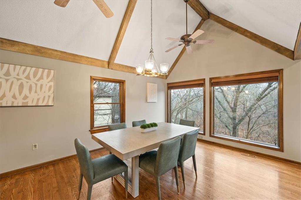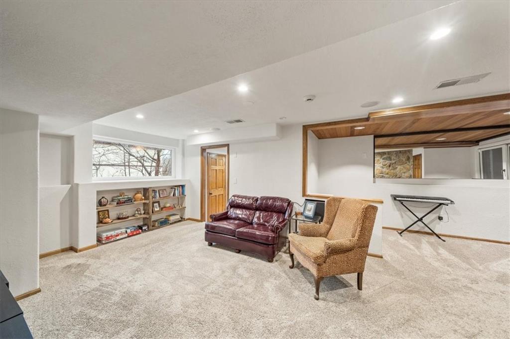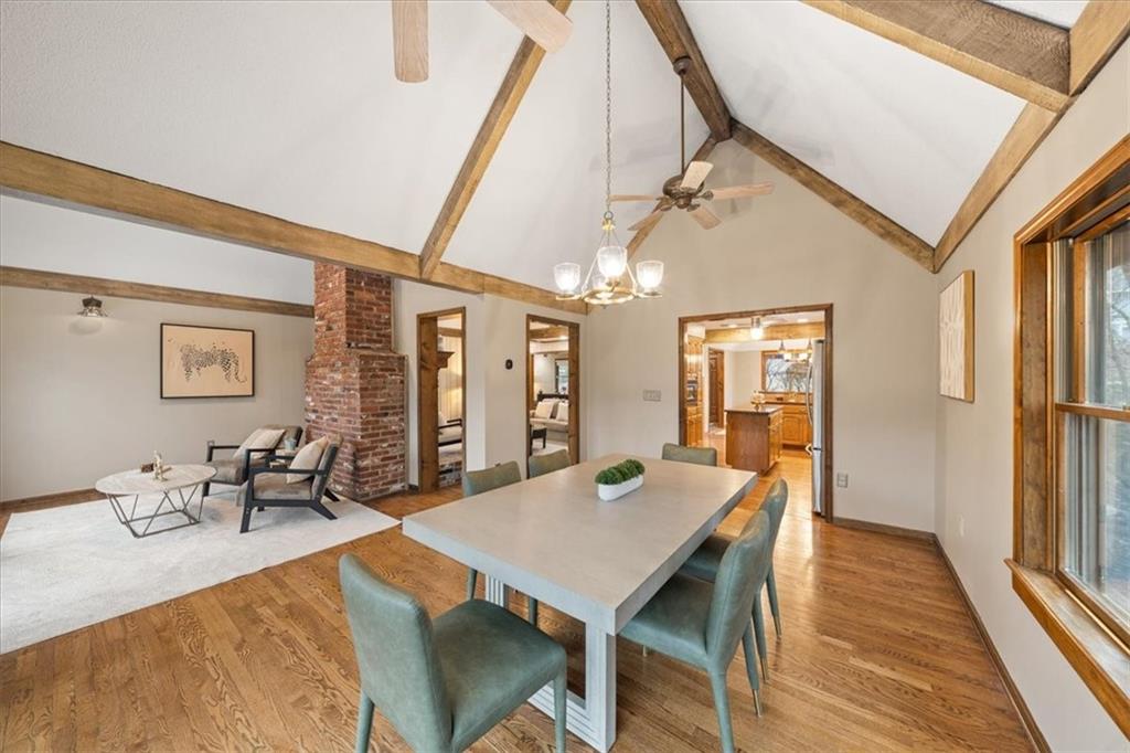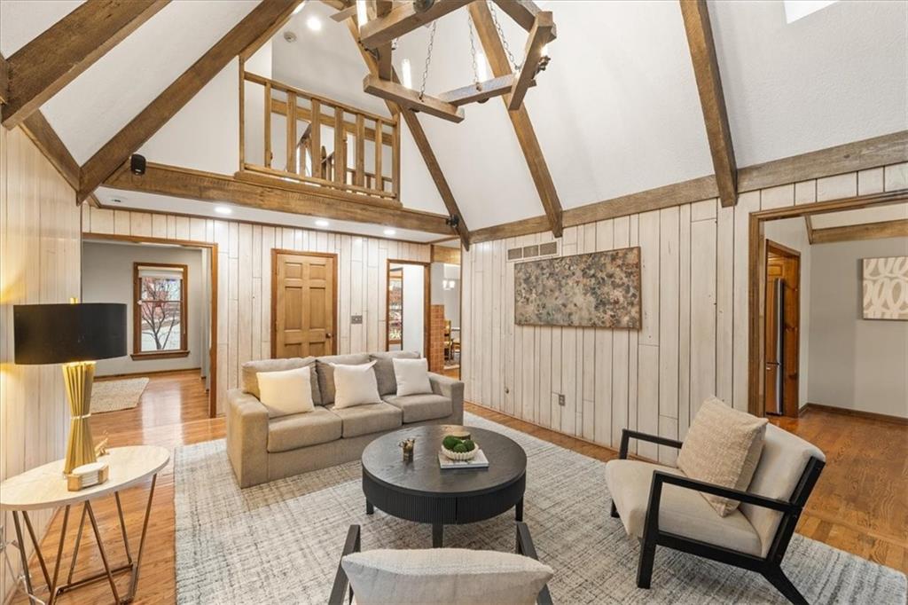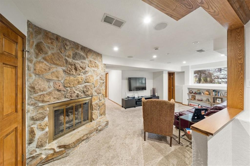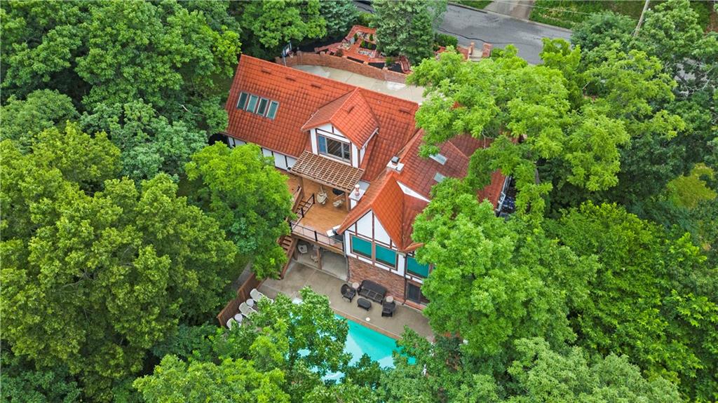Here’s your chance to own something truly special—nestled in nature’s beauty yet just minutes from downtown Shawnee. This 5-bedroom home sits on nearly an acre and offers beautiful curb appeal, extensive landscaping, and exceptional design throughout. The main level features a spacious great room with open-beam cathedral ceilings and a floor-to-ceiling fireplace, along with a large kitchen that includes an island, eating bar, and breakfast area. The main-floor primary suite provides convenience and privacy along with a large walk-in closet, dual vanities and direct patio access. You’ll also find a vaulted formal dining room, a flexible den or office, and a bright sitting room that looks out over the pool and sunsets. Wood floors and large windows throughout much of the main level bring in plenty of natural light. Upstairs are three generously sized bedrooms, a full bath, skylights, and lots of storage. The finished lower level adds additional living space with a rec room and fireplace, full bath, laundry area, workshop, and a fifth bedroom with a wet bar/kitchenette—ideal for pool traffic. Step outside from the living room or primary suite to enjoy the low-maintenance deck, relax on the patio, or spend time in the in-ground pool. There’s also a tiered terrace that provides a nice spot to unwind. Dive into your private pool or take a refreshing swim in the lake—welcome to Black Swan, a hidden gem of a private lake community.