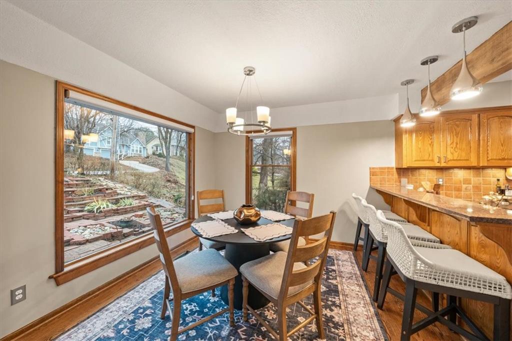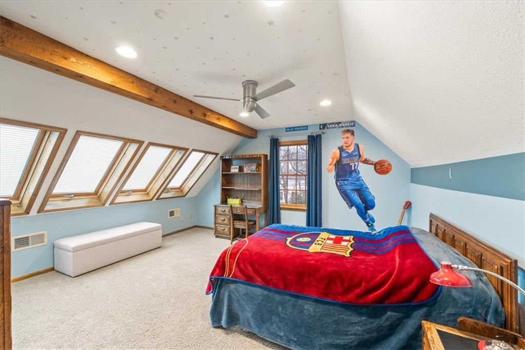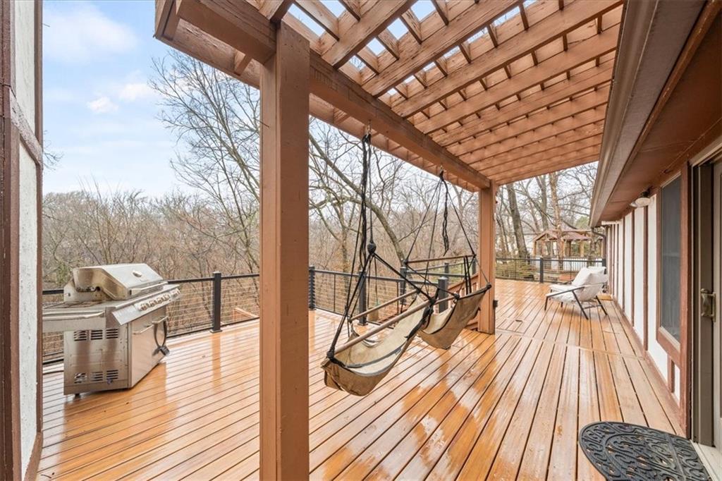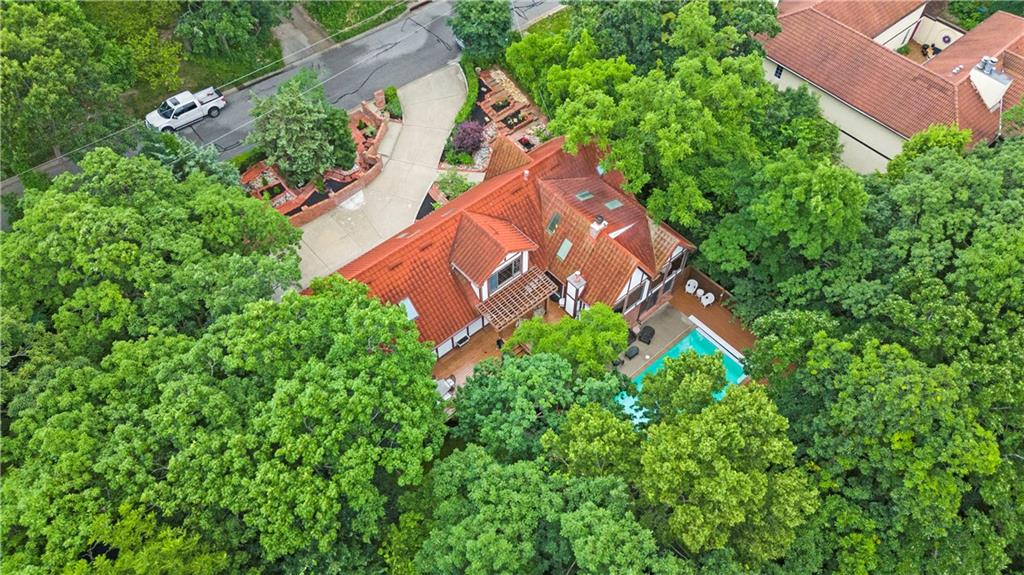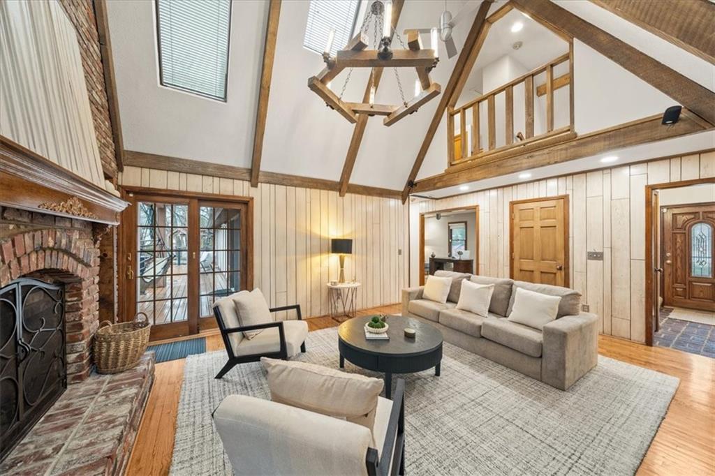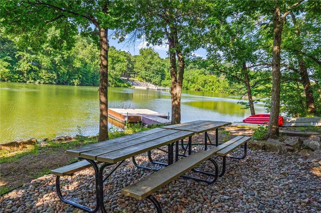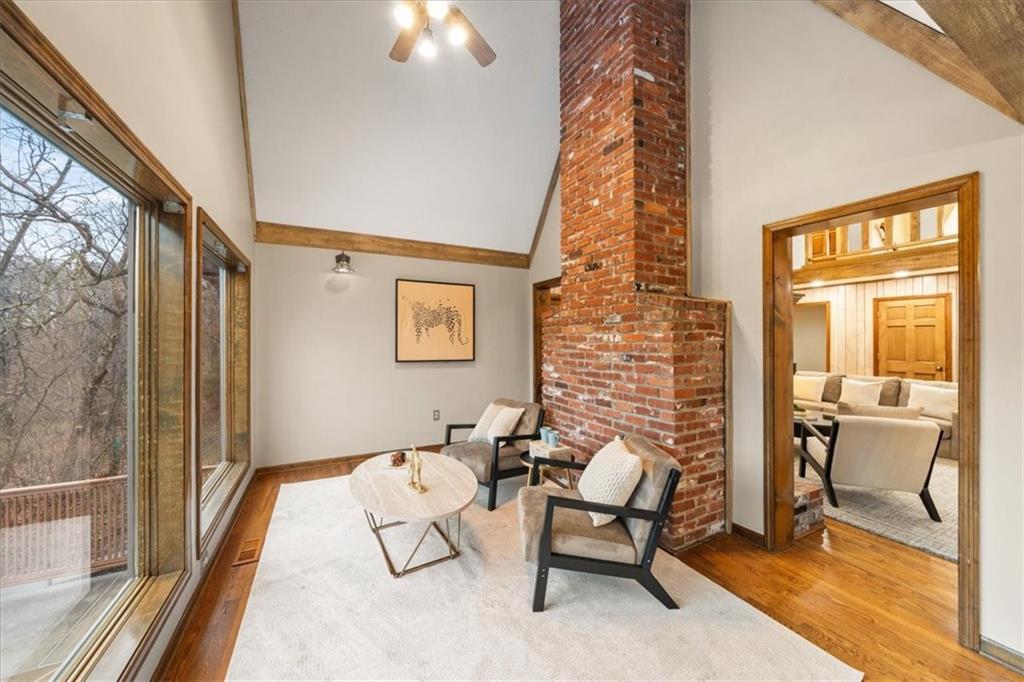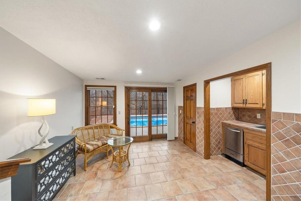 Here’s your chance to own something truly special—nestled in nature’s beauty yet just minutes from downtown Shawnee. This 5-bedroom home sits on nearly an acre and offers beautiful curb appeal, extensive landscaping, and exceptional design throughout. The main level features a spacious great room with open-beam cathedral ceilings and a floor-to-ceiling fireplace, along with a large kitchen that includes an island, eating bar, and breakfast area. The main-floor primary suite provides convenience and privacy along with a large walk-in closet, dual vanities and direct patio access. You’ll also find a vaulted formal dining room, a flexible den or office, and a bright sitting room that looks out over the pool and sunsets. Wood floors and large windows throughout much of the main level bring in plenty of natural light. Upstairs are three generously sized bedrooms, a full bath, skylights, and lots of storage. The finished lower level adds additional living space with a rec room and fireplace, full bath, laundry area, workshop, and a fifth bedroom with a wet bar/kitchenette—ideal for pool traffic. Step outside from the living room or primary suite to enjoy the low-maintenance deck, relax on the patio, or spend time in the in-ground pool. There’s also a tiered terrace that provides a nice spot to unwind. Dive into your private pool or take a refreshing swim in the lake—welcome to Black Swan, a hidden gem of a private lake community.
