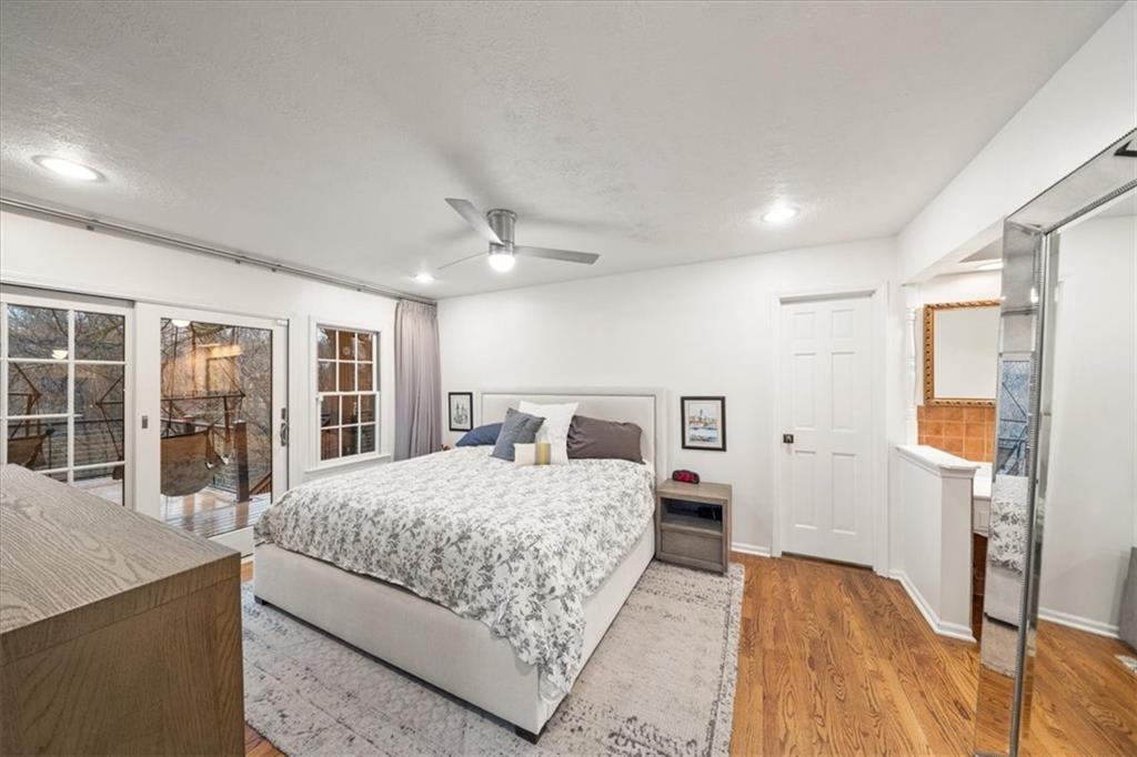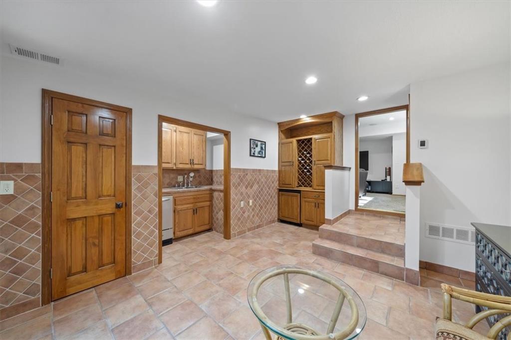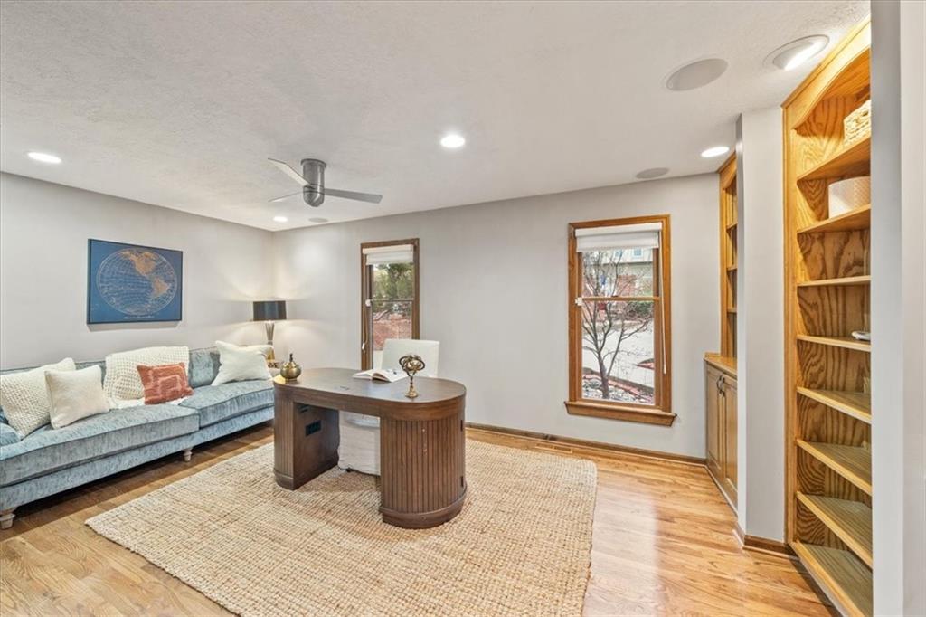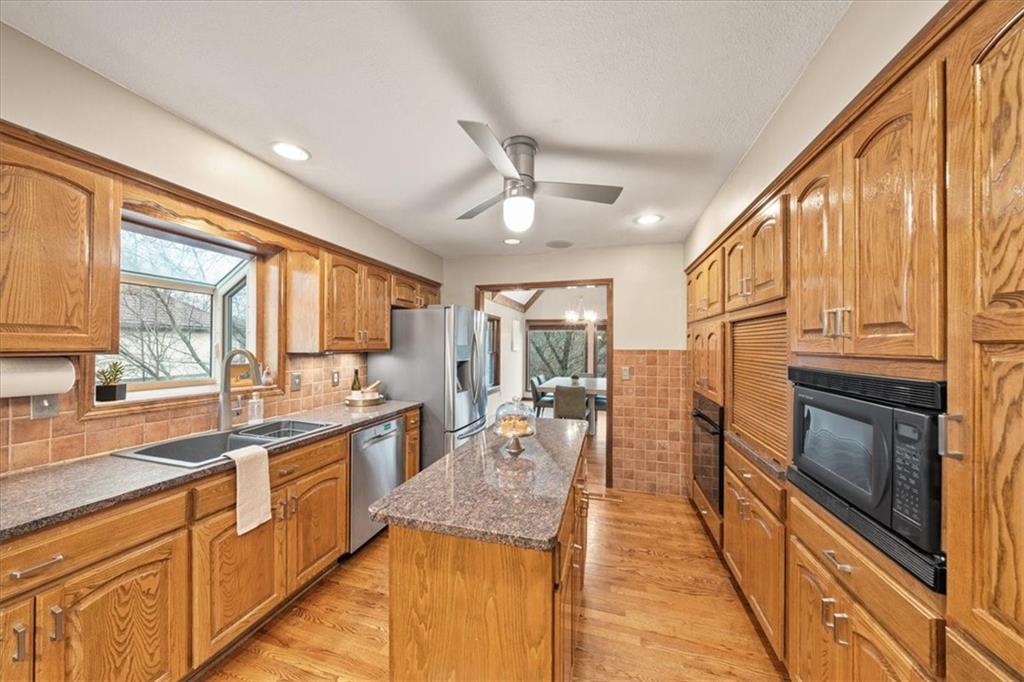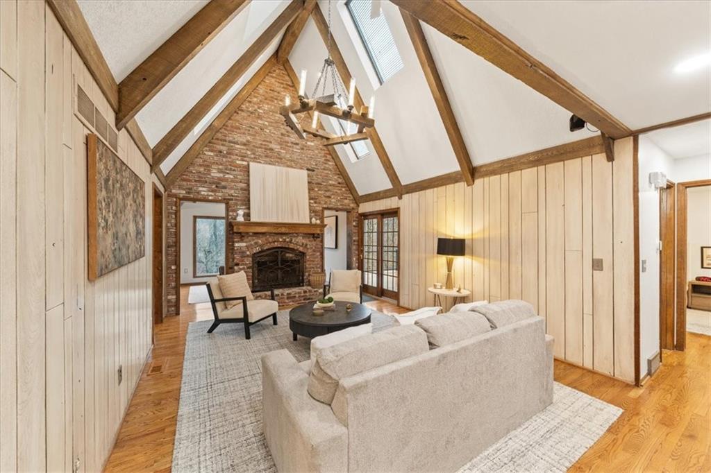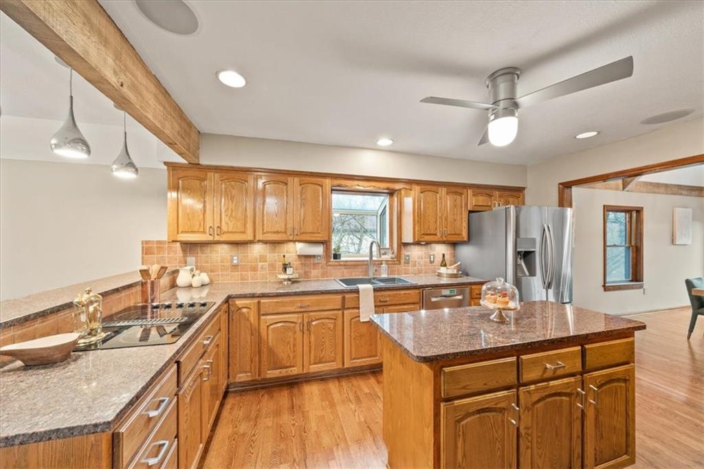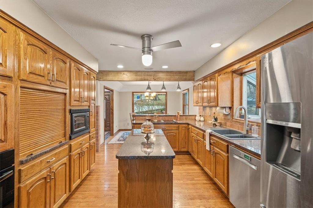 Here’s your chance to own something truly special—nestled in nature’s beauty yet just minutes from downtown Shawnee. This 5-bedroom home sits on nearly an acre and offers beautiful curb appeal, extensive landscaping, and exceptional design throughout. The main level features a spacious great room with open-beam cathedral ceilings and a floor-to-ceiling fireplace, along with a large kitchen that includes an island, eating bar, and breakfast area. The main-floor primary suite provides convenience and privacy along with a large walk-in closet, dual vanities and direct patio access. You’ll also find a vaulted formal dining room, a flexible den or office, and a bright sitting room that looks out over the pool and sunsets. Wood floors and large windows throughout much of the main level bring in plenty of natural light. Upstairs are three generously sized bedrooms, a full bath, skylights, and lots of storage. The finished lower level adds additional living space with a rec room and fireplace, full bath, laundry area, workshop, and a fifth bedroom with a wet bar/kitchenette—ideal for pool traffic. Step outside from the living room or primary suite to enjoy the low-maintenance deck, relax on the patio, or spend time in the in-ground pool. There’s also a tiered terrace that provides a nice spot to unwind. Dive into your private pool or take a refreshing swim in the lake—welcome to Black Swan, a hidden gem of a private lake community.