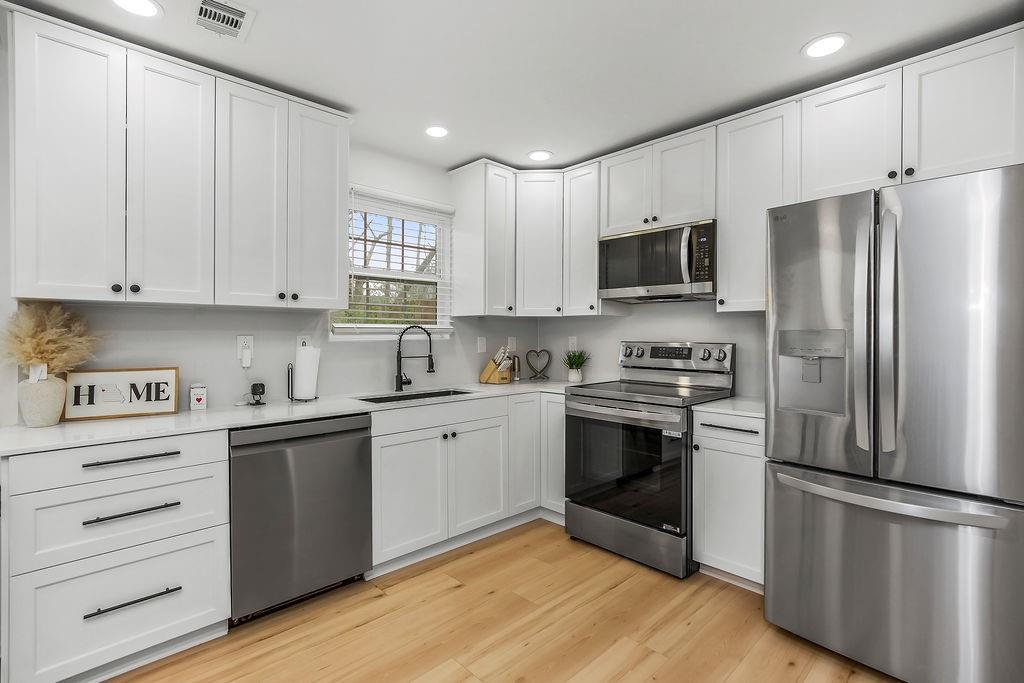 Welcome to this townhome where modern style meets everyday comfort. Step inside to discover a bright, open-concept main level designed for both relaxing and entertaining. The inviting living room features a sleek fireplace with a custom wood accent wall, creating a warm yet contemporary focal point. The neutral color palette and abundant natural light give the space an airy, welcoming feel. The kitchen has been thoughtfully renovated with crisp white cabinetry, stainless steel appliances, modern hardware, and ample counter space perfect for cooking and gathering. It flows seamlessly into the dining area, making it ideal for hosting or everyday living. Upstairs, you’ll find spacious bedrooms with clean lines and modern finishes. The primary suite offers a comfortable retreat with generous closet space. Bathrooms are updated with contemporary fixtures, clean tile work, and a fresh, polished look. Step outside to your private patio, perfect for relaxing or entertaining, backing to a peaceful, tree-lined setting that adds both privacy and charm.