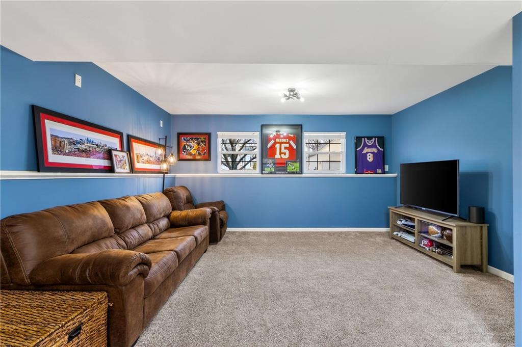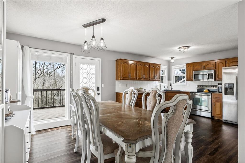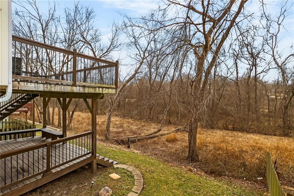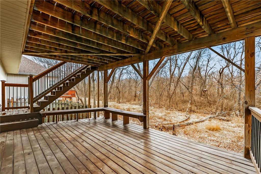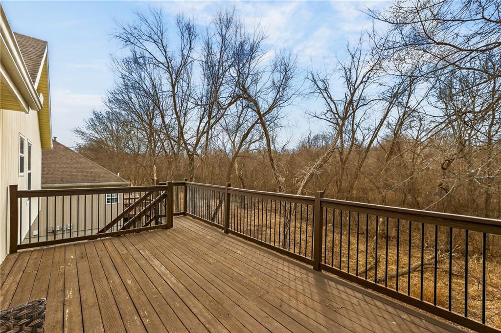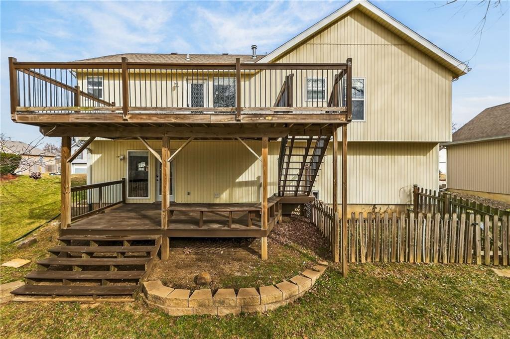 Beautifully maintained home featuring a spacious and open floor plan. The great room boasts a vaulted ceiling and cozy gas fireplace, flowing seamlessly into the bright kitchen with stainless steel appliances and ample counter space. The dining area walks out to the upper deck overlooking a private backyard with tree-lined views and the Big Shoal Greenway walking trail just behind the property—perfect for grilling, relaxing, and enjoying nature. The primary bedroom features a tray ceiling and an updated private bath with a shower and tile floors. Two additional bedrooms and a full bath with a tub and shower complete the main level. The finished walk-out lower level offers additional living space with a large family room, wet bar, game area/office space, half bath, and laundry room, plus direct access to the covered lower deck—ideal for entertaining or unwinding. Conveniently and centrally located with easy access to Kansas City amenities, shopping, dining, and major highways, and less than five minutes from the Oak Ridge Family Social Club.