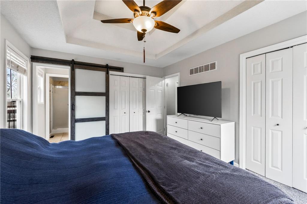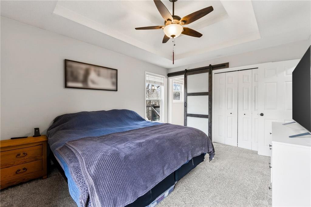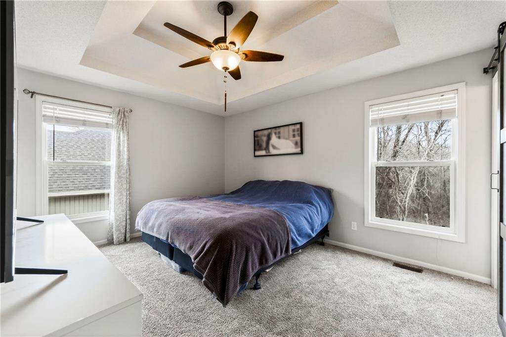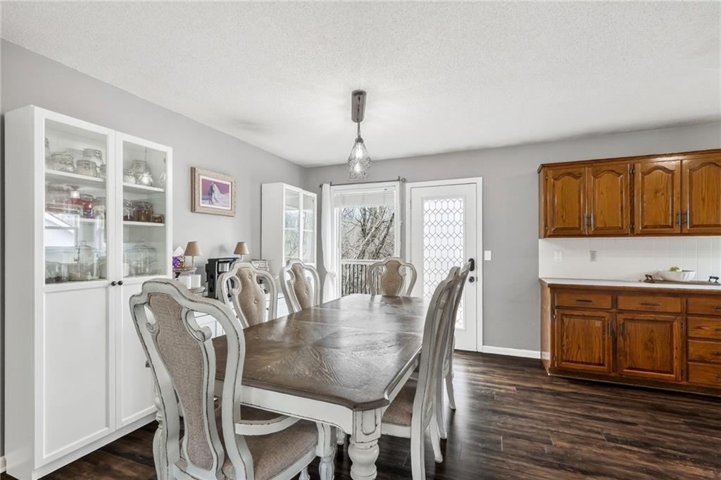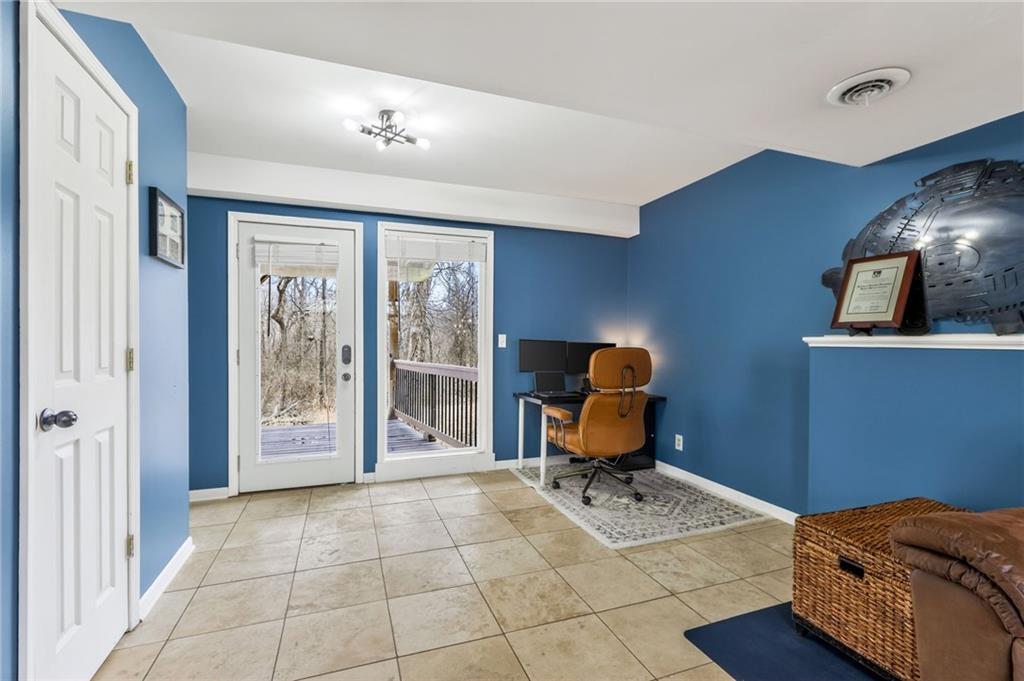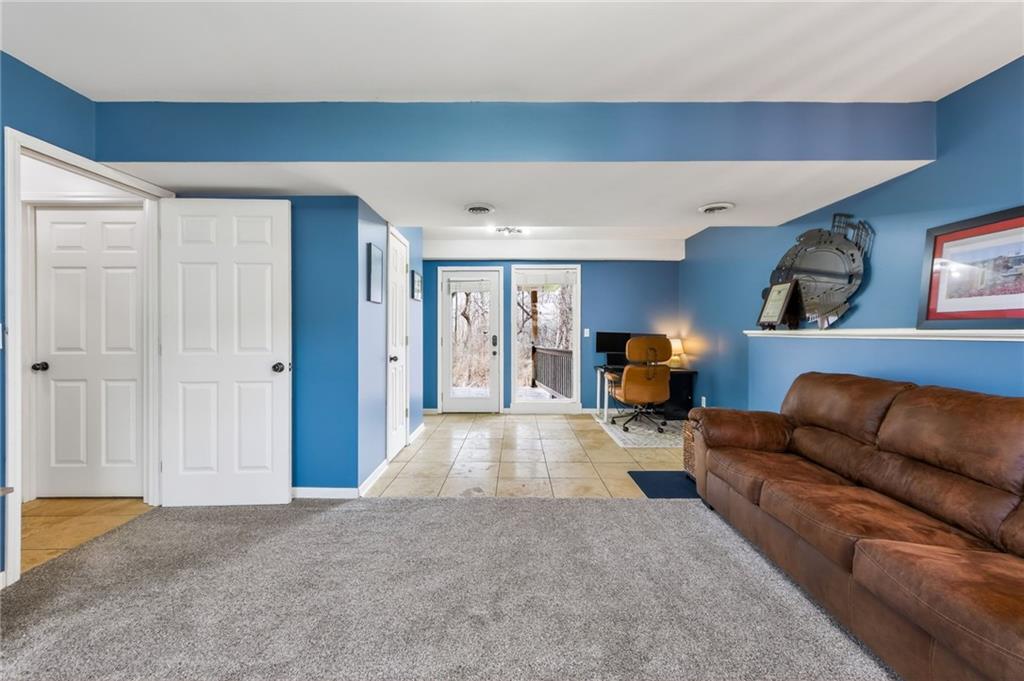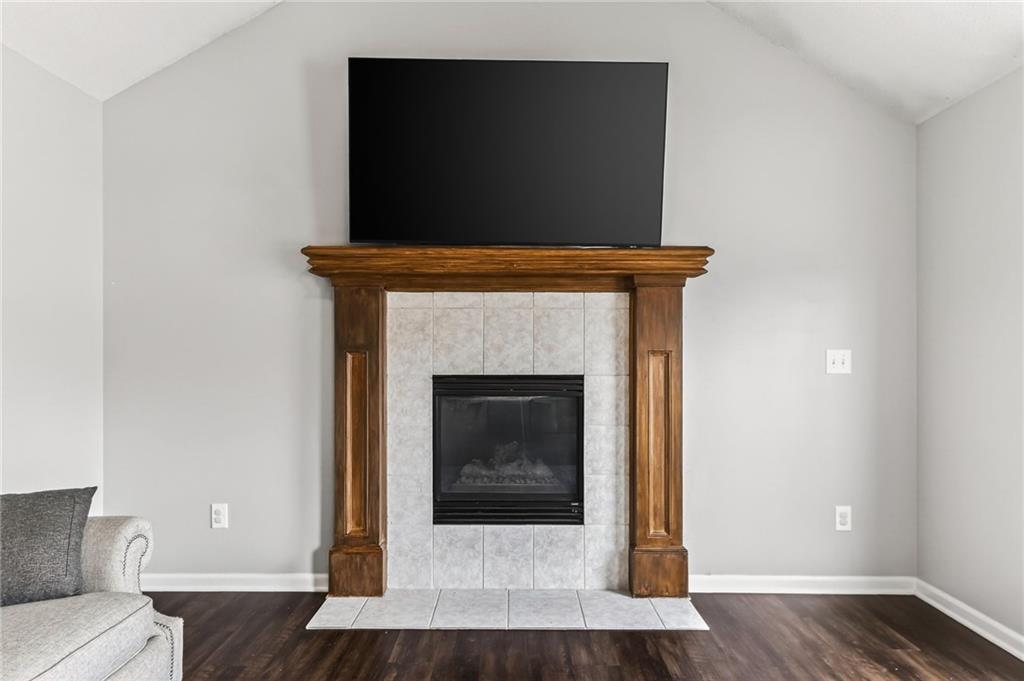 Beautifully maintained home featuring a spacious and open floor plan. The great room boasts a vaulted ceiling and cozy gas fireplace, flowing seamlessly into the bright kitchen with stainless steel appliances and ample counter space. The dining area walks out to the upper deck overlooking a private backyard with tree-lined views and the Big Shoal Greenway walking trail just behind the property—perfect for grilling, relaxing, and enjoying nature. The primary bedroom features a tray ceiling and an updated private bath with a shower and tile floors. Two additional bedrooms and a full bath with a tub and shower complete the main level. The finished walk-out lower level offers additional living space with a large family room, wet bar, game area/office space, half bath, and laundry room, plus direct access to the covered lower deck—ideal for entertaining or unwinding. Conveniently and centrally located with easy access to Kansas City amenities, shopping, dining, and major highways, and less than five minutes from the Oak Ridge Family Social Club.