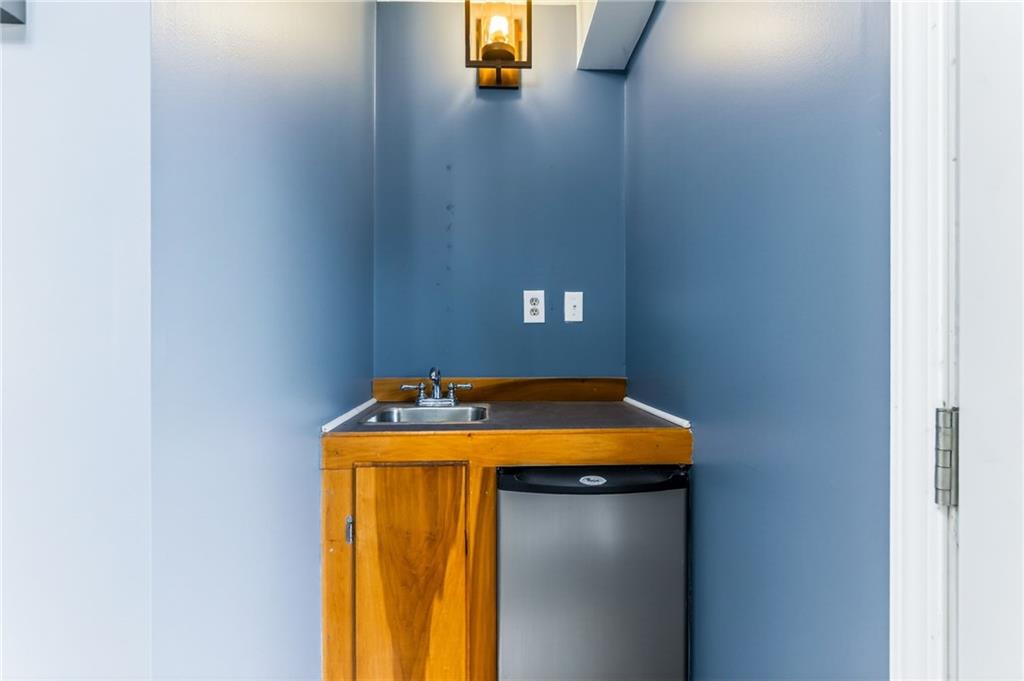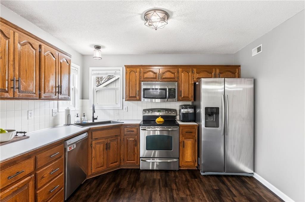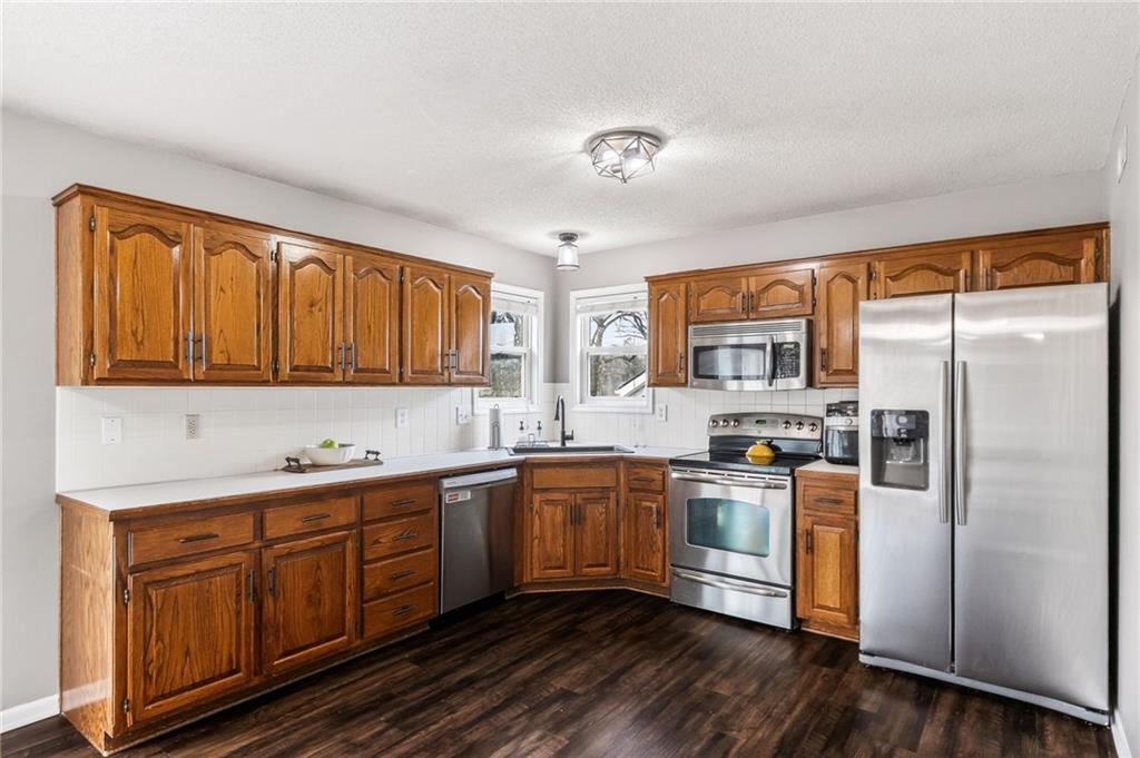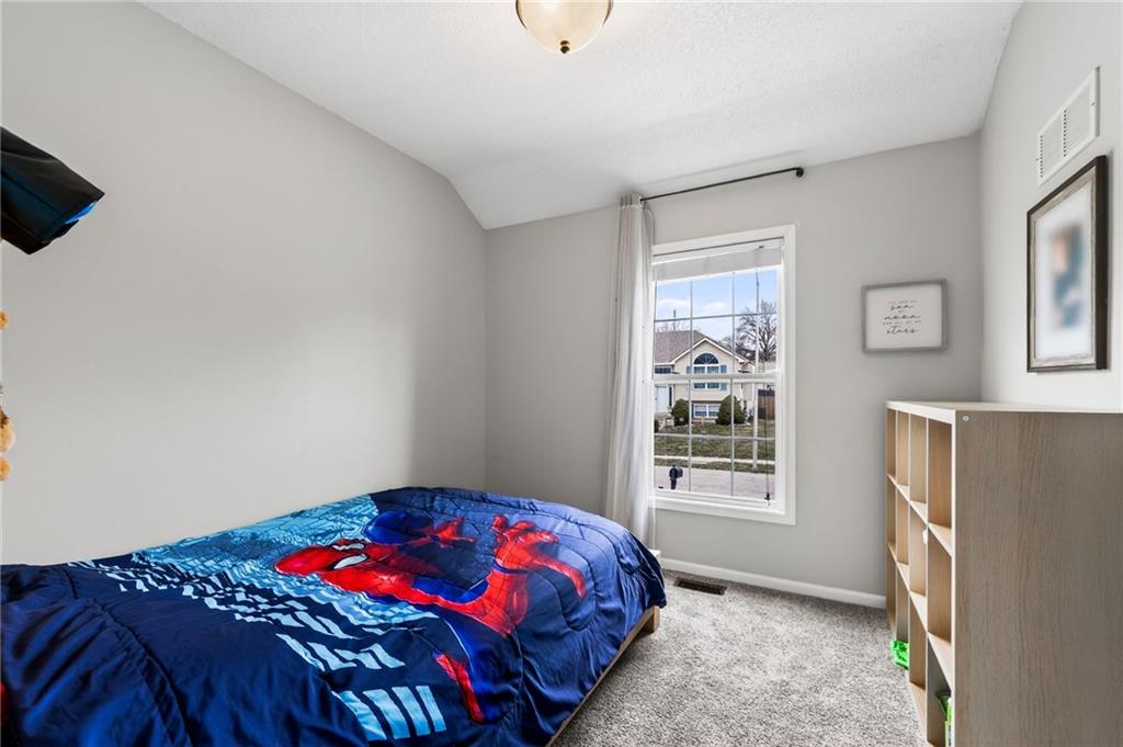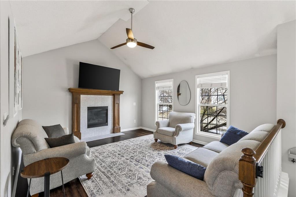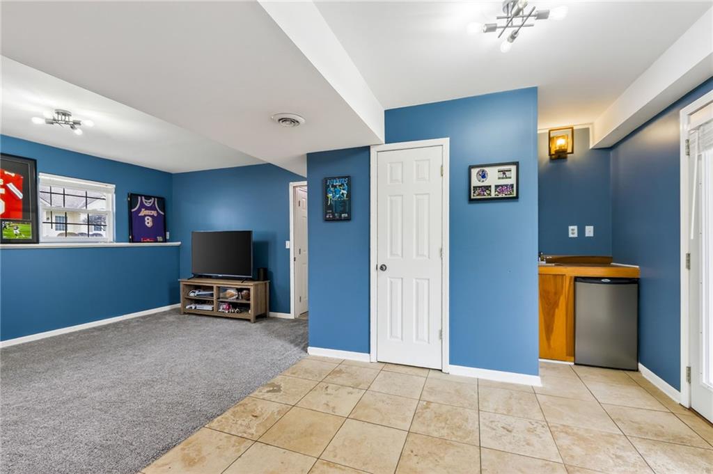 Beautifully maintained home featuring a spacious and open floor plan. The great room boasts a vaulted ceiling and cozy gas fireplace, flowing seamlessly into the bright kitchen with stainless steel appliances and ample counter space. The dining area walks out to the upper deck overlooking a private backyard with tree-lined views and the Big Shoal Greenway walking trail just behind the property—perfect for grilling, relaxing, and enjoying nature. The primary bedroom features a tray ceiling and an updated private bath with a shower and tile floors. Two additional bedrooms and a full bath with a tub and shower complete the main level. The finished walk-out lower level offers additional living space with a large family room, wet bar, game area/office space, half bath, and laundry room, plus direct access to the covered lower deck—ideal for entertaining or unwinding. Conveniently and centrally located with easy access to Kansas City amenities, shopping, dining, and major highways, and less than five minutes from the Oak Ridge Family Social Club.