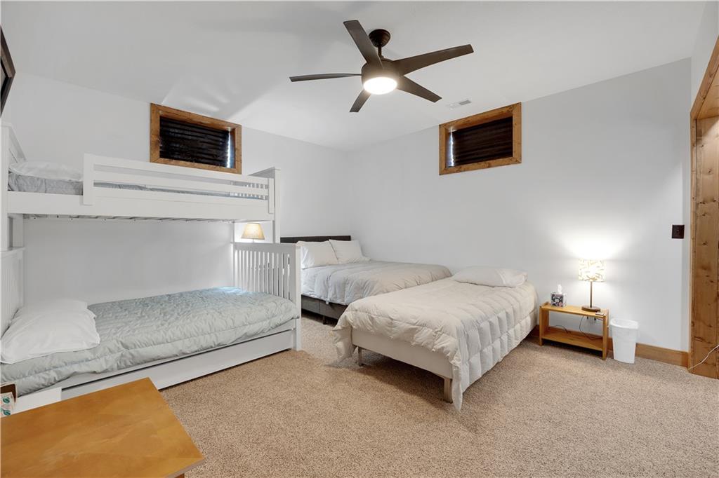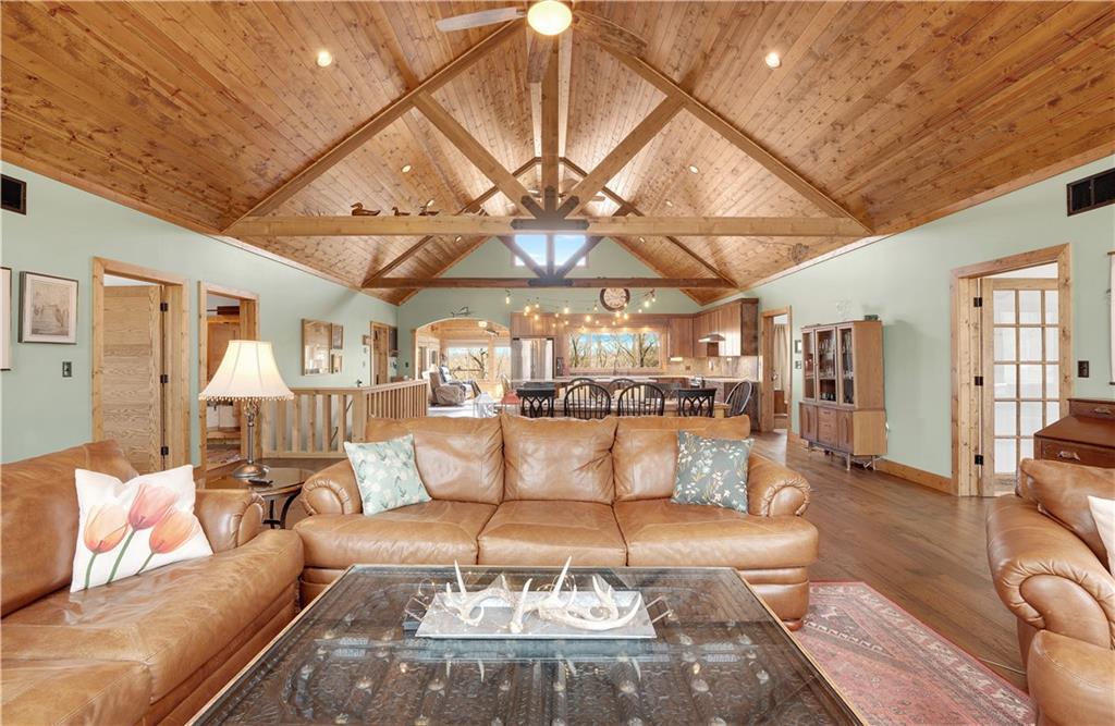 Indulge in waterfront living on approximately 5 serene acres at the 75 mile marker of Lake of the Ozarks. This custom-built home seamlessly blends luxury, Amish craftsmanship, and natural beauty, offering 4 bedrooms and 3.5 bathrooms designed for comfort and style. Very economical to heat and cool with geothermal system. Step into the open-concept main living area, where soaring vaulted wood ceilings with exposed beams, rich wood flooring, and walls of windows frame breathtaking views of the surrounding landscape. The gourmet kitchen is a chef’s dream, featuring a 9-foot island with seating, quartz countertops, custom cabinetry, mosaic tile backsplash, stainless steel appliances, and a walk-in pantry. Focus on work in your own home office or Relax in the sunroom or step outside to enjoy the expansive deck that spans the back of the home—perfect for entertaining—and a cozy firepit for relaxing evenings. The lower level hosts a finished game room with a regulation-size pool table included, two bedrooms, and a full bathroom, along with ample storage and a mechanical room housing a geothermal HVAC system, water heaters, and water filtration system. The property boasts approximately 110 feet of waterfront with an electric tram to a private two-slip covered dock equipped with boat lifts, a swim platform with Wet Steps, and a stainless steel fish cleaning station (Ameren permitted). Nestled in the gated Forbes Lake of the Ozarks Park community, enjoy privacy, road maintenance, and access to shared amenities—all while embracing the ultimate lakefront lifestyle.