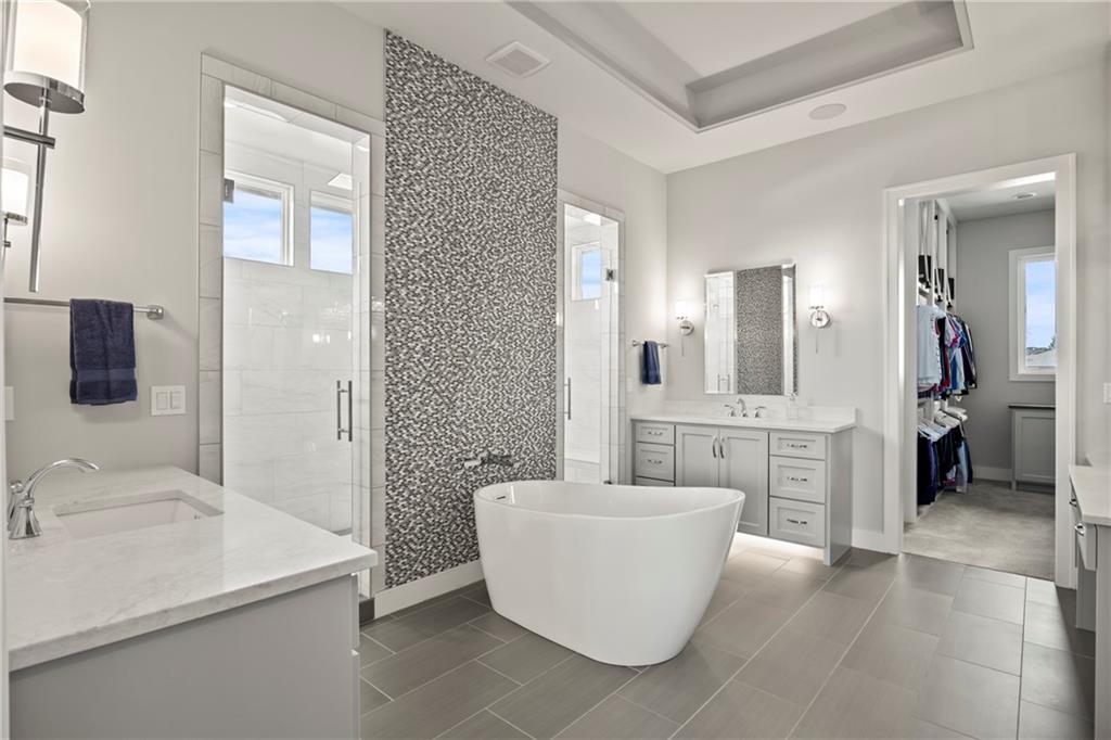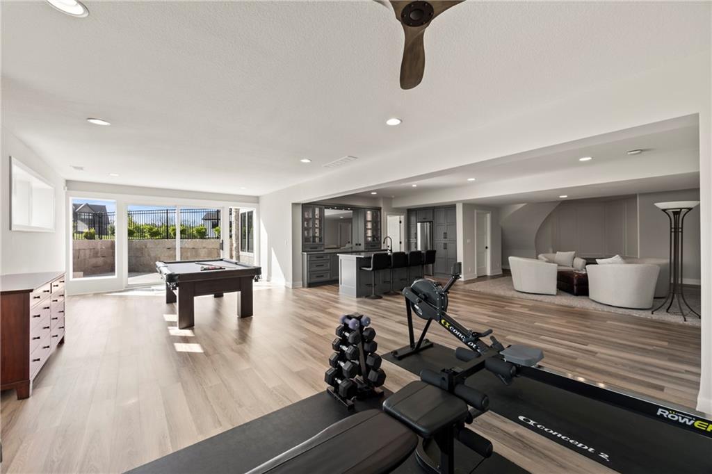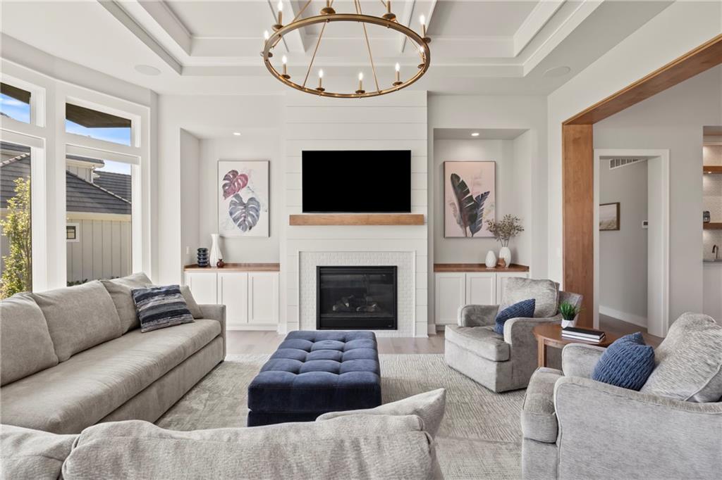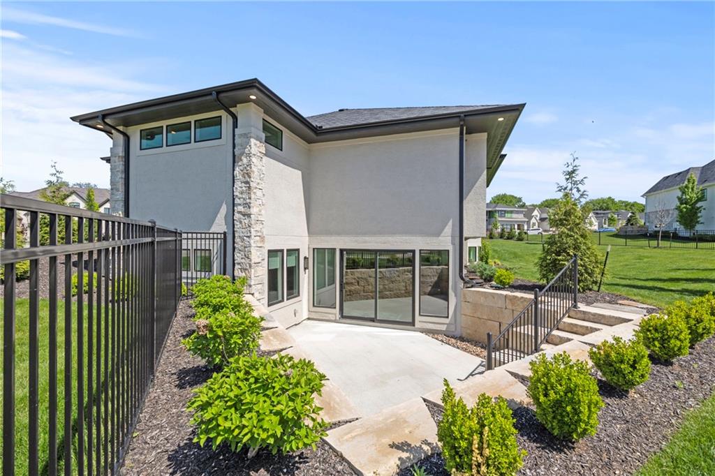 Amazing one and a half story home with a full finished walkout basement in Mills Ranch ready for quick move-in. This nearly new, 3 year old Willis Custom Built home is a stunner with a spacious vaulted main floor living space, impressive curved staircase, arched doorway to the great room, unique 2nd bar, theater room, screened in lanai sun porch, walk in double shower with freestanding tub, huge 4 car split garage with high lift doors, dog wash, pocket office, premium sound system and smart tech package. So many unexpected extras in this home around every corner. This 1.5 Story floor plan features a main floor primary suite with luxurious spa bath with with white quartz and mini tiles. Must see! Upper level offers private spaces with loft, second laundry and two premium bedrooms loaded with extra features and upgraded baths. You'll love the fully finished walkout lower level with LVT flooring, movie room, wet bar and 4th bedroom. This upscale home sits on a corner lot with a side entry four car garage and a front circle drive. Beautiful landscaped and fully fenced unique backyard allows for you to access from the main level and walkout on the side. Move right in to this amazing home located in Mills Ranch with a new neighborhood pool, and easy access to the Johnson County walking trails and quick access to Highway 69. All the luxuries of a new home are already added including premium window coverings, fenced yard, water bottle filler, built in side-by-side refrigerator and premium sound system. Why build when you can move right into this award-winning Willis Custom Home. Blue Valley School District