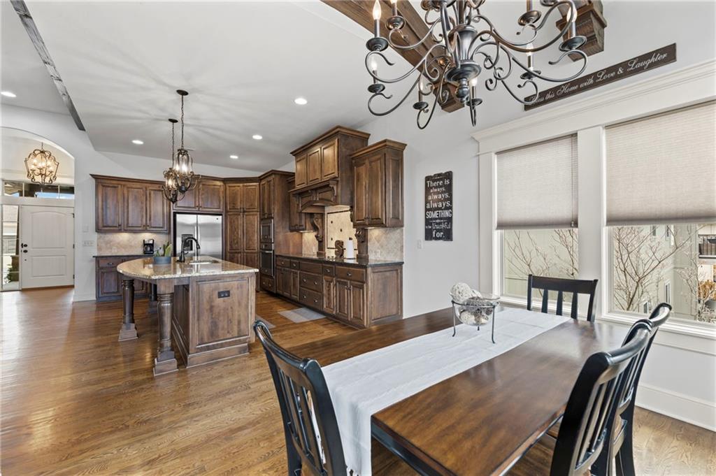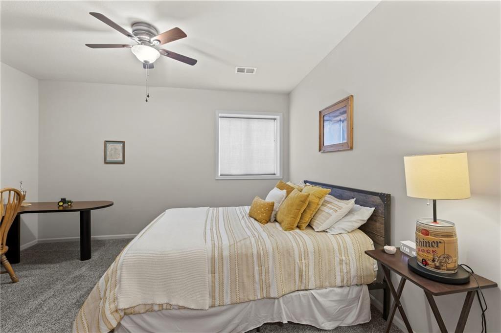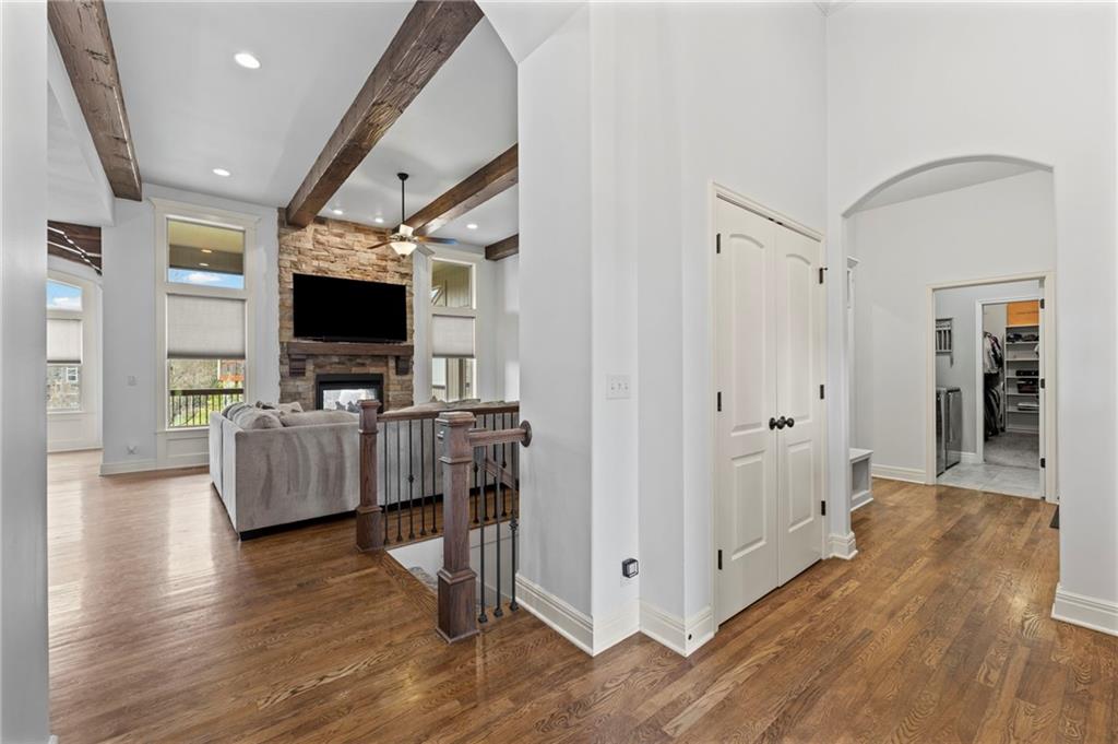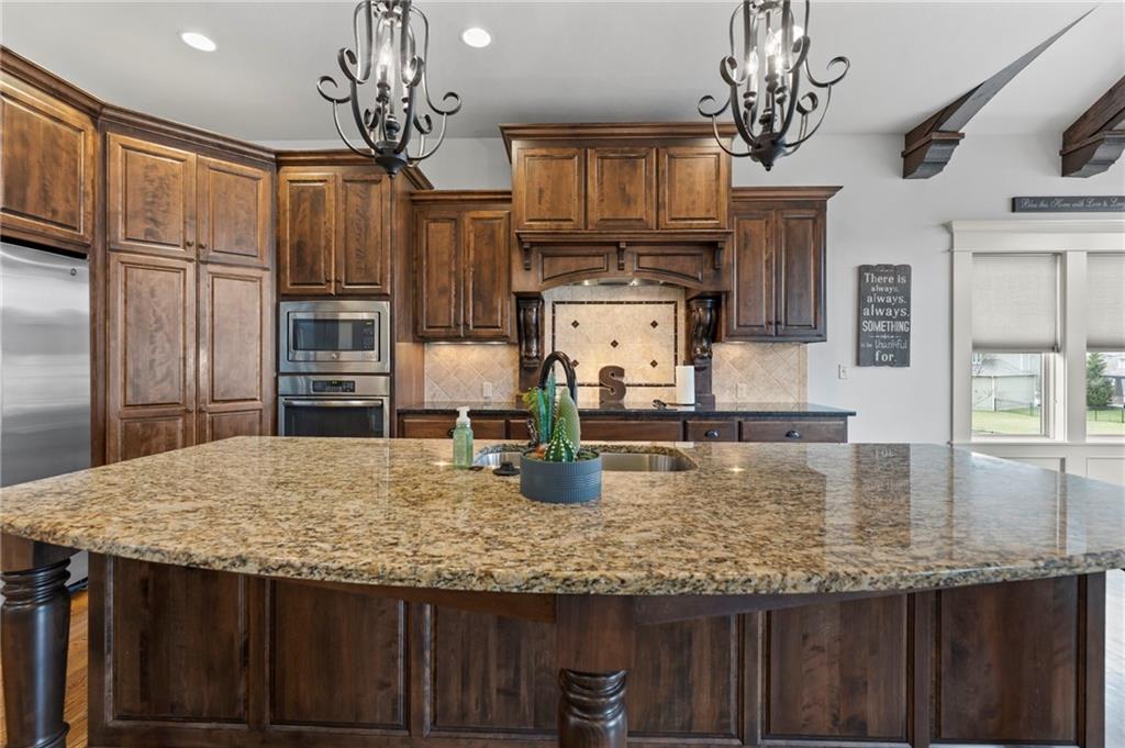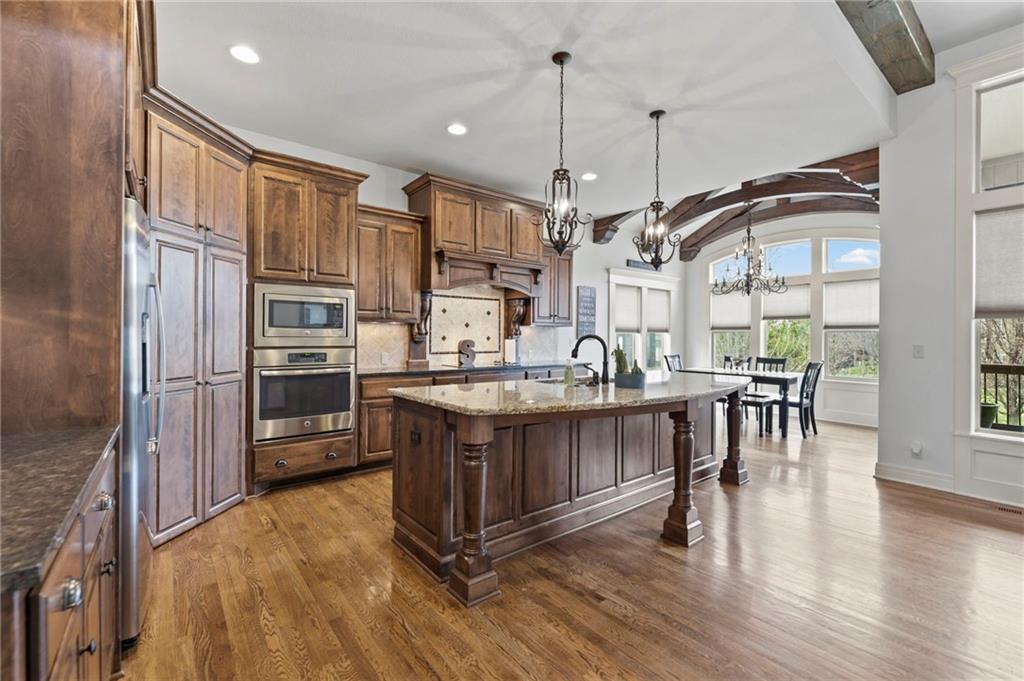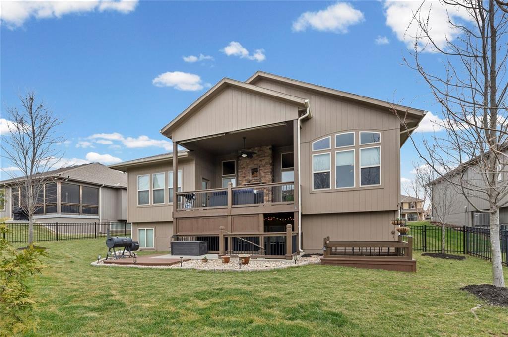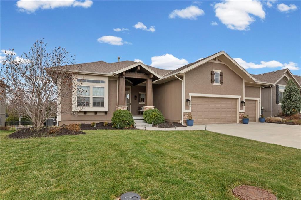 This fabulous Reverse 1.5 Story offers a blend of Craftsman detail and modern comfort. The open-concept layout features vaulted ceilings with exposed beams, hardwood floors, and a floor-to-ceiling stone, see-through fireplace creating a seamless indoor-outdoor connection. The spacious kitchen offers a large granite island, custom cabinetry, built-in appliances, and a walk-in pantry. Dining area is filled with natural light and connects seamlessly to the main living space. Spacious primary suite features tray ceilings and a well-appointed bath with granite double vanity, soaking tub, and walk-in shower, along with a generous walk-in closet. A second bedroom is located on the main level. The finished walkout lower level includes two additional bedrooms with large walk-in closets, a family room, and a full wet bar, offering excellent space for entertaining and everyday living with easy access to outdoor areas. Located in the desirable Southbridge/Stonebridge community, residents enjoy access to multiple neighborhood amenities including four zero-entry pools (one Junior Olympic size), two clubhouses with fitness facilities, playgrounds, pickleball courts, volleyball areas, and connected walking trails. Just minutes away, Heritage Park offers over 1,200 acres of recreation including a 40-acre lake, off-leash dog park, disc golf course, golf course and driving range, picnic shelters, trails, and multiple athletic fields for soccer, football, and more. Convenient access to nearby shopping, dining, and major highways adds to the appeal, making this location ideal for both everyday living and easy commuting.