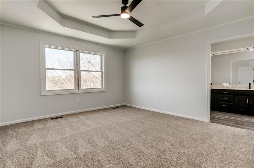 Welcome to this updated 2-story home in Bonner Springs offering a functional layout, natural light, and flexible living spaces. The main level features a spacious living room with a beautiful stone fireplace and built-in shelving, creating a warm and inviting gathering space. The open kitchen showcases vaulted ceilings, ample cabinet storage, built-in desk, and great window light, with easy access to the newly repaired and painted back deck—perfect for outdoor dining or entertaining. A separate dining area sits just off the entry, and the main-level laundry adds everyday convenience. Recent updates include fresh interior paint, knock down ceilings, new carpet in living room and primary bedroom, luxury vinyl plank flooring, new remote control LED ceiling fans, and new LED can lights, giving the home a clean, modern feel. Upstairs, the primary suite features a tray ceiling, double vanity, soaking tub, separate shower, and skylight for additional natural light. Three additional bedrooms and a full bath complete the upper level. The unfinished lower level with an egress window provides flexible space to make your own. Step outside to the elevated deck overlooking a spacious yard with plenty of room for your outdoor needs. NEW roof and gutters-2025. New siding and windows installed in 2018. Additional highlights include a two-car attached garage with sandwich panel insulated garage doors, neutral interior palette, and convenient access to nearby amenities. *Since the original list date, the seller has painted the garage doors, added new exterior lighting in front, painted the shed, and added a beautiful decorative tile to the front of the jetted tub. Located near parks, retail, restaurants, and with easy highway access via K-7 to I-70 and the greater Kansas City area. This property offers space, updates, and a great location—ready for its next owner to call home!