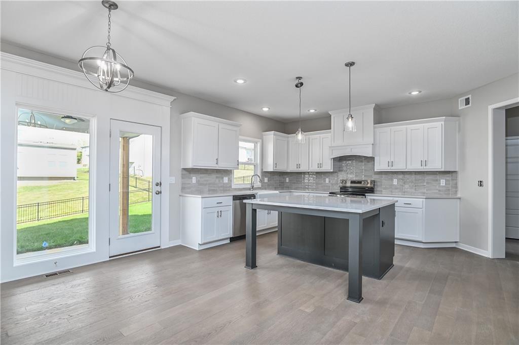 This updated version of the beloved original Levi plan offers expanded square footage and premium upgrades throughout. The open-concept main floor features a spacious kitchen and breakfast area, a larger granite center island with ample seating, and upgraded granite countertops in the kitchen. Kitchen offers soft closet doors and drawers. Enjoy versatile living with a main floor flex room—perfect for a home office or 5th bedroom—plus a mud room with boot bench and entry closet. Upstairs, the expanded master suite boasts a separate sitting area, larger walk-in closet for 2 different sections, and an upgraded primary bath with a freestanding tub. The laundry room has been enhanced with additional workspace, and the open loft with window provides extra living space. Located within walking distance to Lake Olathe, this home also offers access to neighborhood amenities including trails, a pool, and playground. Don’t miss your chance to own this upgraded and spacious home in a prime location!