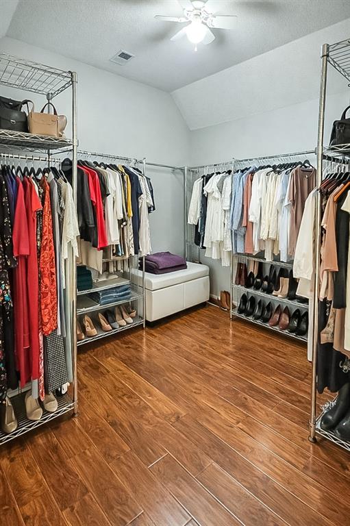 Walk in closet featuring vaulted ceiling, dark wood-style floors, and ceiling fan