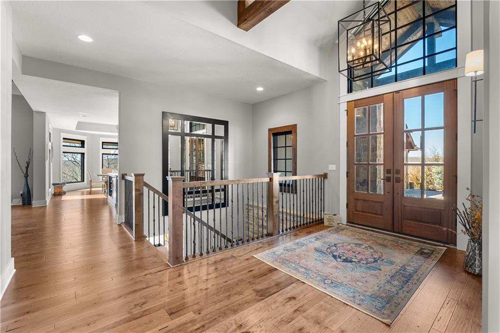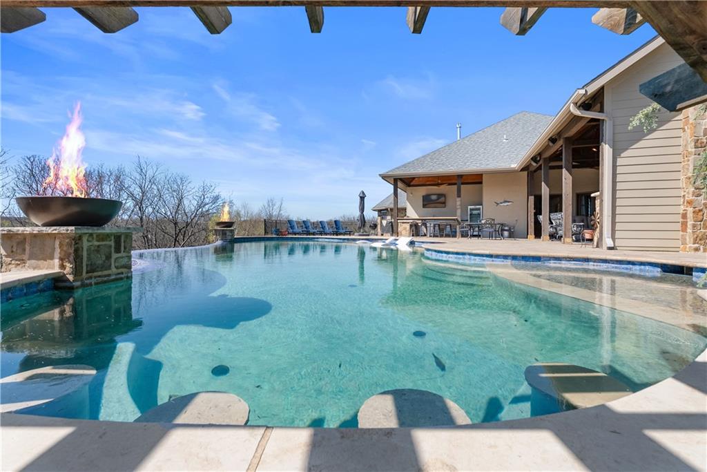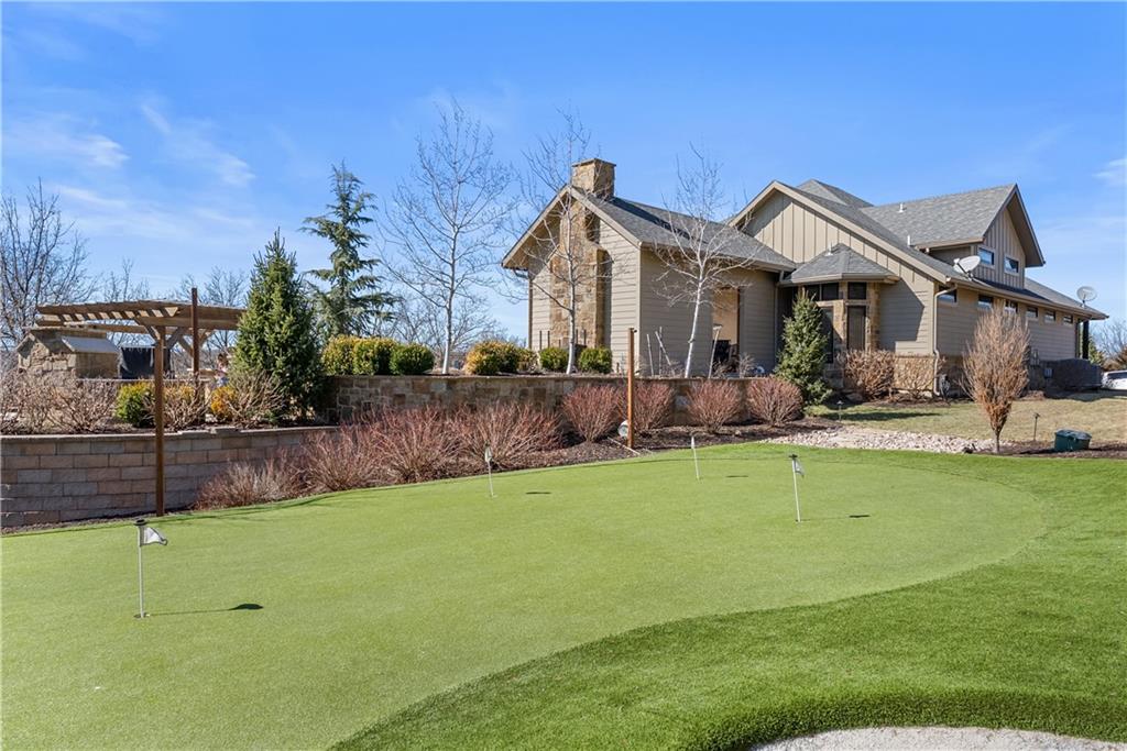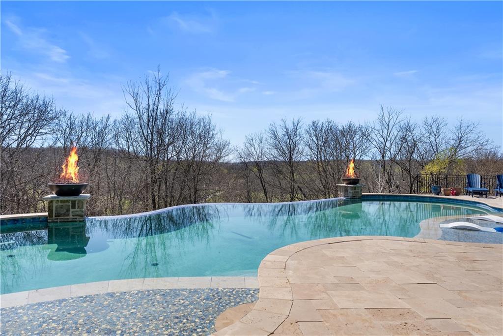 Dreams truly come alive in this one-of-a-kind custom Reverse 1.5 Story estate nestled on 9+ breathtaking acres in unincorporated Jackson County within the Lee’s Summit School District. This private retreat offers unmatched craftsmanship, panoramic treetop views & resort-level amenities that cannot be replicated. A grand front porch w/stone accents & custom doors welcomes you into a stunning interior featuring soaring 12-foot ceilings on both levels & architectural detail throughout. The main level showcases a dramatic living area w/west-facing views and a chef’s kitchen designed for everyday luxury and entertaining—complete with oversized island, custom shelving, walk-in pantry, double refrigerator/freezer combo, & oversized gas range. Light filled dining space, coffee bar-perfect for morning routines. The primary suite is a private sanctuary w/direct access to the covered patio for seamless indoor/outdoor living. The spa inspired bath features dual vanities,deep soaker tub, walk-in shower, & a generous walk-in closet w/custom built-ins. A main-level den (or 2nd bdrm) & convenient laundry complete the layout. The finished lower level is an entertainer’s dream featuring an oversized golf simulator & projector ,full wet bar, media/rec space, pool table area, exercise room w/sauna, & 2 additional bedroom suites each w/private baths & walk-in closets. A suspended garage provides rare lower-level 4th garage access—ideal for workshop, car collection, or storage. And then…This resort-caliber setting rivals luxury destinations. The vaulted covered patio w/stone FP creates year-round ambiance. Step outside to a spectacular infinity-edge pool with swim-up bar, tanning ledge, outdoor kitchen, & unobstructed treetop views offering 100% privacy. Entertain in your custom silo bar, practice on the putting green, unwind beside three cascading rock waterfalls surrounded by professional landscaping & custom exterior lighting. A signature property offering an unmatched lifestyle.
