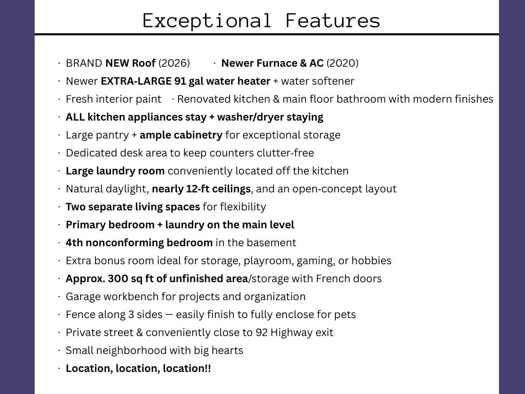 LOCATION, LOCATION, LOCATION! Over $200k in home improvements over the years. BRAND NEW roof (March 2026), Newer Furnace, AC (2020). 4th Non-conforming bedroom in basement. 2 separate living spaces. Beautifully updated 1.5-story home with main-level primary bedroom with large closet and incredible storage. The renovated kitchen with granite countertops & updated cabinetry opens into a bright living space with soaring ceilings—nearly 12 feet—and abundant natural light. Convenient spacious laundry room off kitchen. Fresh interior paint, newer wood floors, and BRAND new carpet make the home feel crisp and move-in ready. 2 bedrooms upstairs with full bathroom. Downstairs you’ll find additional living space, a full bathroom, a non-conforming 4th bedroom, and over 300 sq ft of unfinished space ready to become extra storage, gym, workshop, or future finished area.