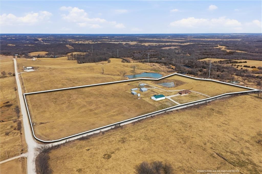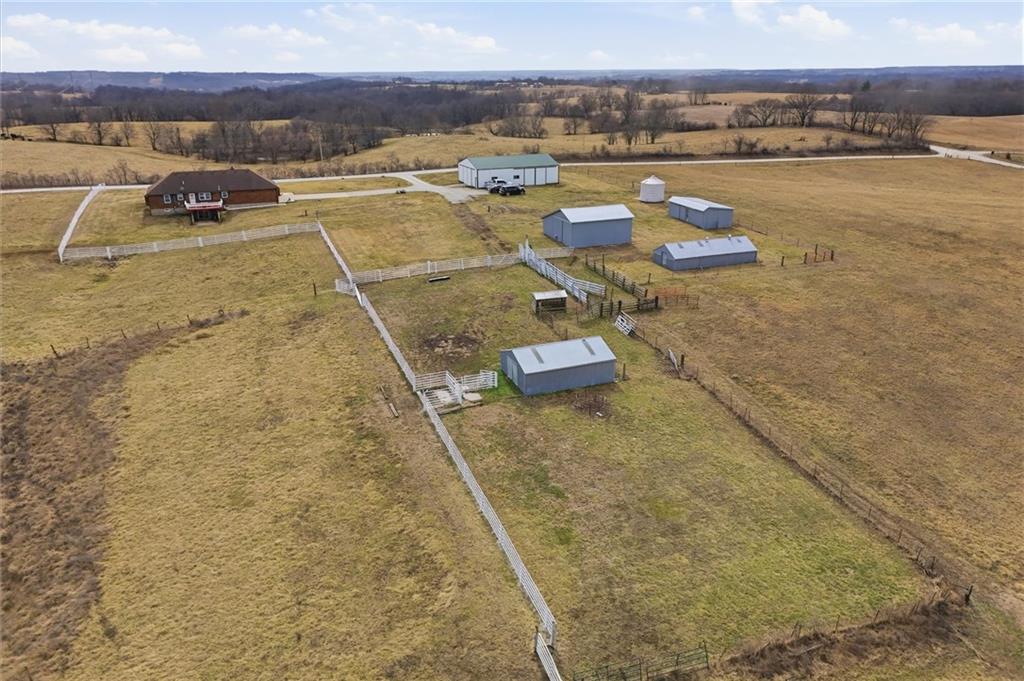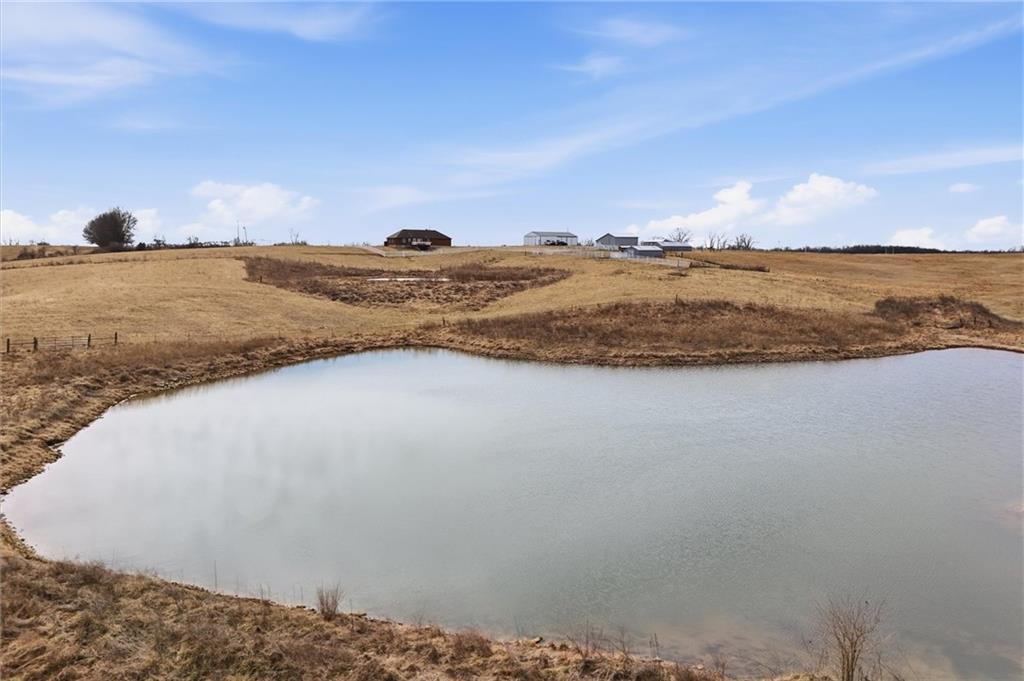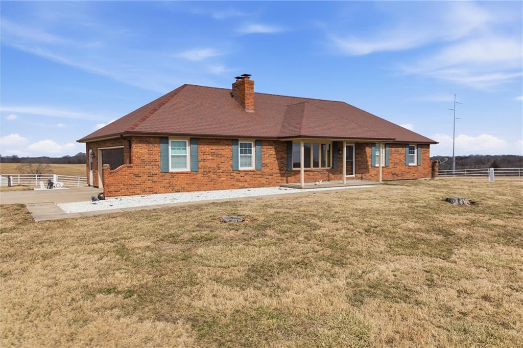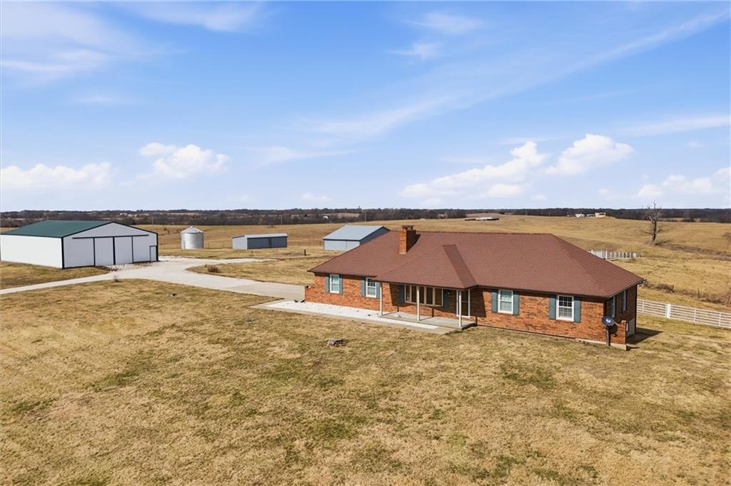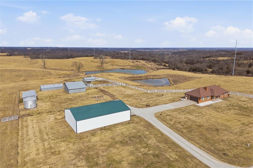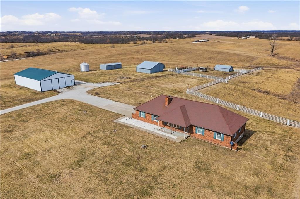 Beautifully maintained ranch home on 19+/- rolling acres featuring 2 main level bedrooms plus 3 non-conforming bedrooms in a fully finished walkout basement complete with a large second kitchen and spacious living room. Meticulously prepped for your comfort and located just 25 minutes from Kansas City, this property delivers the perfect mix of comfort, function, and wide open space. As you drive up, scenic views unfold across your land, buildings, fencing, and stocked pond. The large covered front porch is made for conversations that turn into lasting memories. The main level offers an open concept layout filled with natural light. The kitchen has northern exposure to the property, while the living room features large south-facing windows. Two oversized bedrooms sit on the main floor, including a spacious primary suite with private bath and pond views. A full hallway bath adds convenience. The kitchen includes granite countertops and space for a full size dining table. The walkout basement expands the living space with three additional non-conforming bedrooms and direct outdoor access, ideal for multi-generational living, guests, or entertaining. Formerly a cattle farm, the property is well suited for horses and includes recently painted fencing and gates, refreshed barns, and five total outbuildings. The 40x60 shop with concrete floors and power offers serious workspace. Fencing supports multiple farm animals, including that sought after Highland cow. An additional acreage directly north is available to expand your farm life even more. In the spring, the land comes alive with lush grass and vibrant views. Peaceful country living with city access within minutes. Well cared for. Move in ready. Built for lifestyle and legacy.