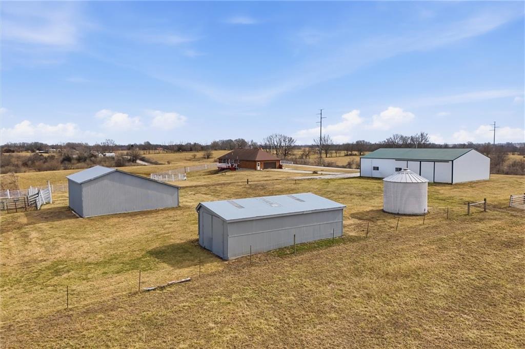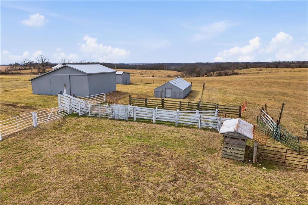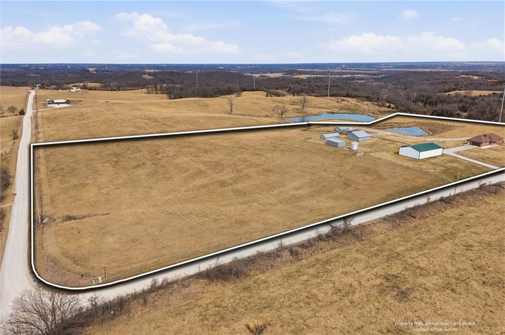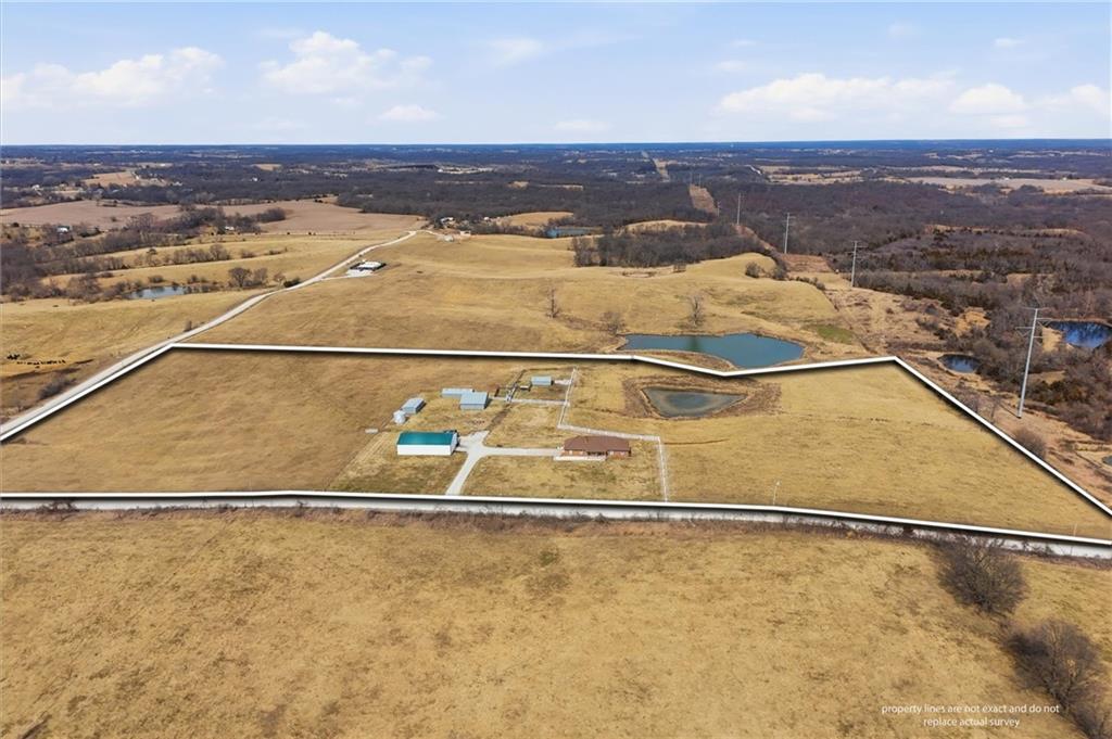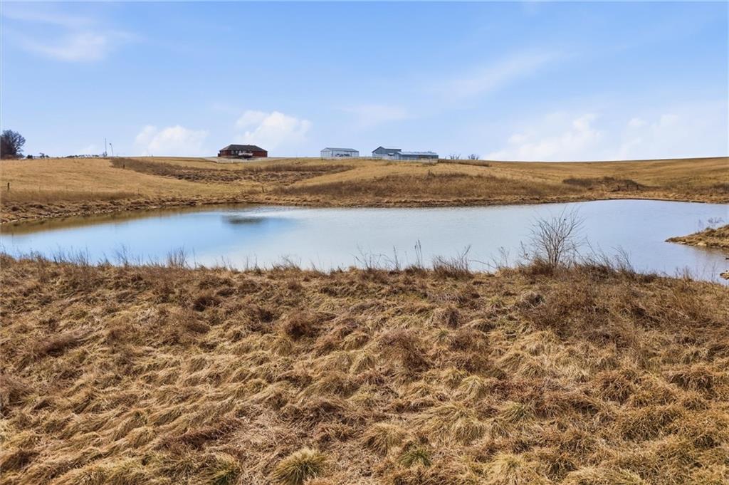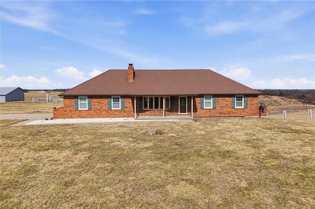 Beautifully maintained ranch home on 19+/- rolling acres featuring 2 main level bedrooms plus 3 non-conforming bedrooms in a fully finished walkout basement complete with a large second kitchen and spacious living room. Meticulously prepped for your comfort and located just 25 minutes from Kansas City, this property delivers the perfect mix of comfort, function, and wide open space. As you drive up, scenic views unfold across your land, buildings, fencing, and stocked pond. The large covered front porch is made for conversations that turn into lasting memories. The main level offers an open concept layout filled with natural light. The kitchen has northern exposure to the property, while the living room features large south-facing windows. Two oversized bedrooms sit on the main floor, including a spacious primary suite with private bath and pond views. A full hallway bath adds convenience. The kitchen includes granite countertops and space for a full size dining table. The walkout basement expands the living space with three additional non-conforming bedrooms and direct outdoor access, ideal for multi-generational living, guests, or entertaining. Formerly a cattle farm, the property is well suited for horses and includes recently painted fencing and gates, refreshed barns, and five total outbuildings. The 40x60 shop with concrete floors and power offers serious workspace. Fencing supports multiple farm animals, including that sought after Highland cow. An additional acreage directly north is available to expand your farm life even more. In the spring, the land comes alive with lush grass and vibrant views. Peaceful country living with city access within minutes. Well cared for. Move in ready. Built for lifestyle and legacy.