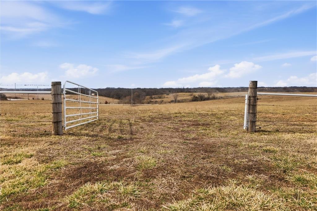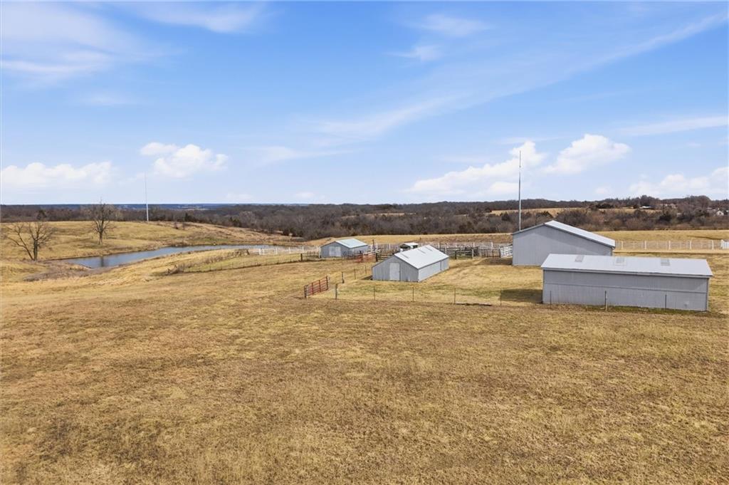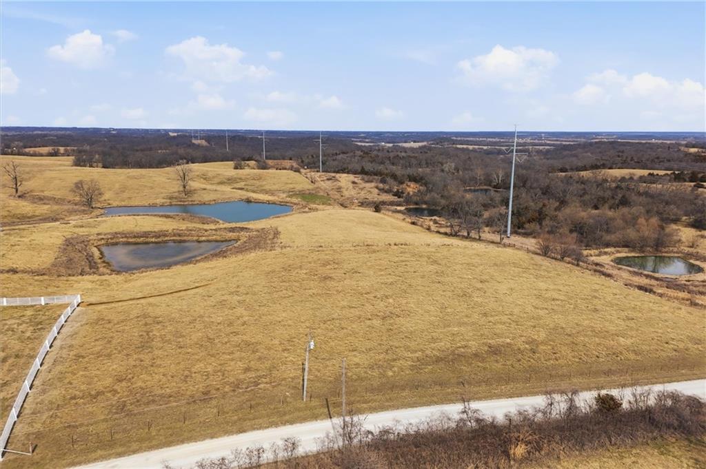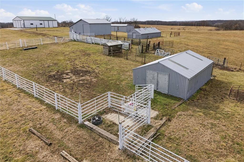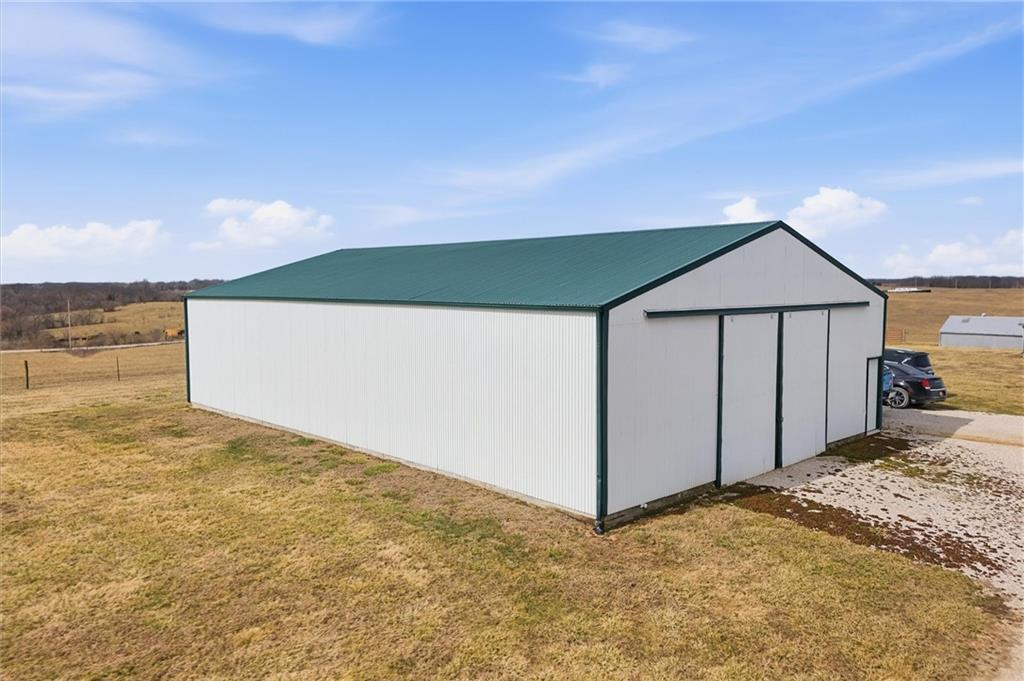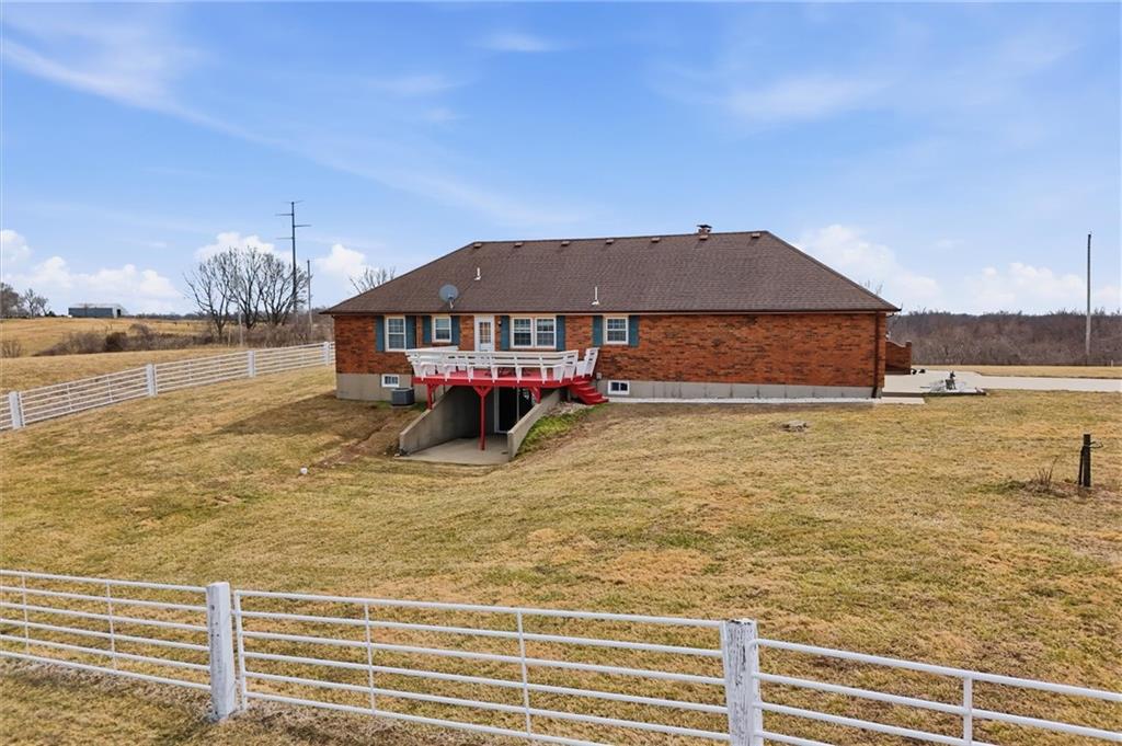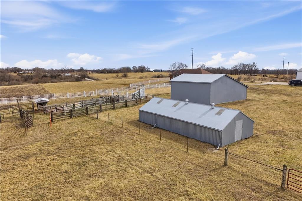 Beautifully maintained ranch home on 19+/- rolling acres featuring 2 main level bedrooms plus 3 non-conforming bedrooms in a fully finished walkout basement complete with a large second kitchen and spacious living room. Meticulously prepped for your comfort and located just 25 minutes from Kansas City, this property delivers the perfect mix of comfort, function, and wide open space. As you drive up, scenic views unfold across your land, buildings, fencing, and stocked pond. The large covered front porch is made for conversations that turn into lasting memories. The main level offers an open concept layout filled with natural light. The kitchen has northern exposure to the property, while the living room features large south-facing windows. Two oversized bedrooms sit on the main floor, including a spacious primary suite with private bath and pond views. A full hallway bath adds convenience. The kitchen includes granite countertops and space for a full size dining table. The walkout basement expands the living space with three additional non-conforming bedrooms and direct outdoor access, ideal for multi-generational living, guests, or entertaining. Formerly a cattle farm, the property is well suited for horses and includes recently painted fencing and gates, refreshed barns, and five total outbuildings. The 40x60 shop with concrete floors and power offers serious workspace. Fencing supports multiple farm animals, including that sought after Highland cow. An additional acreage directly north is available to expand your farm life even more. In the spring, the land comes alive with lush grass and vibrant views. Peaceful country living with city access within minutes. Well cared for. Move in ready. Built for lifestyle and legacy.