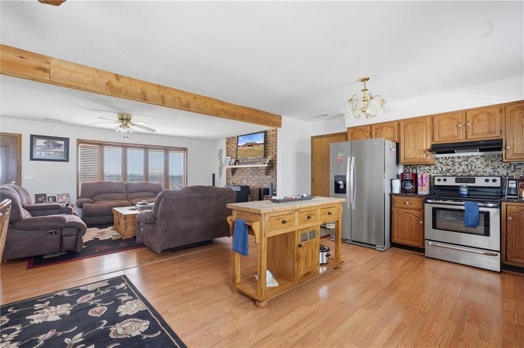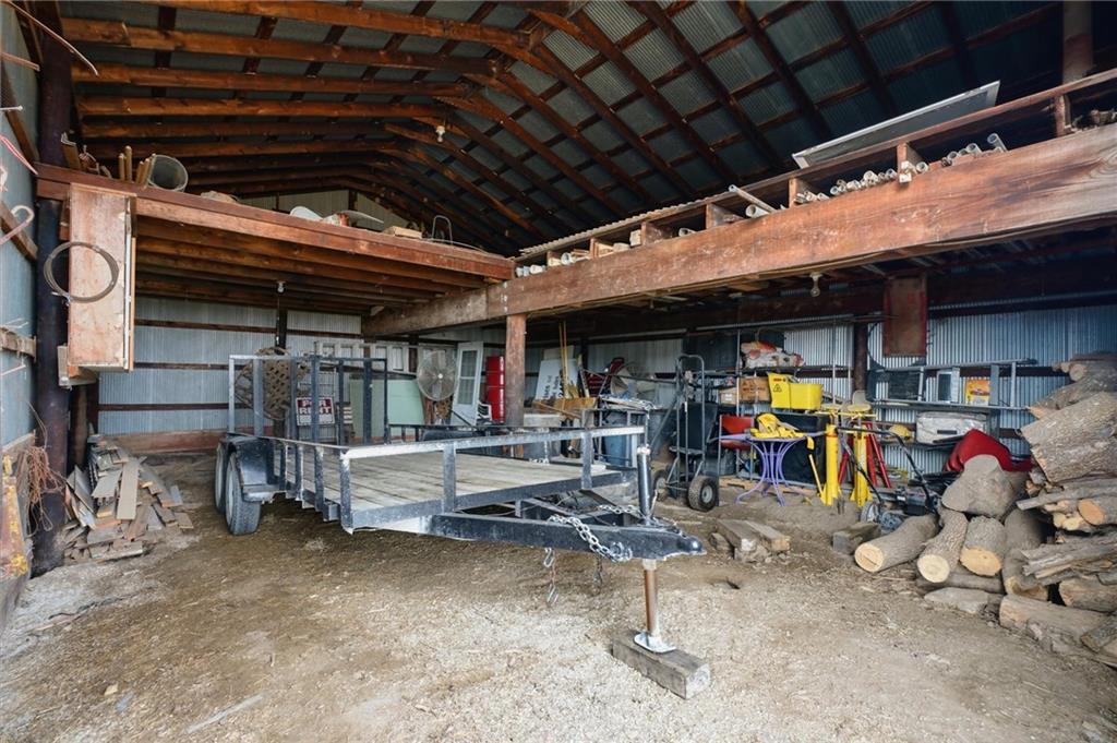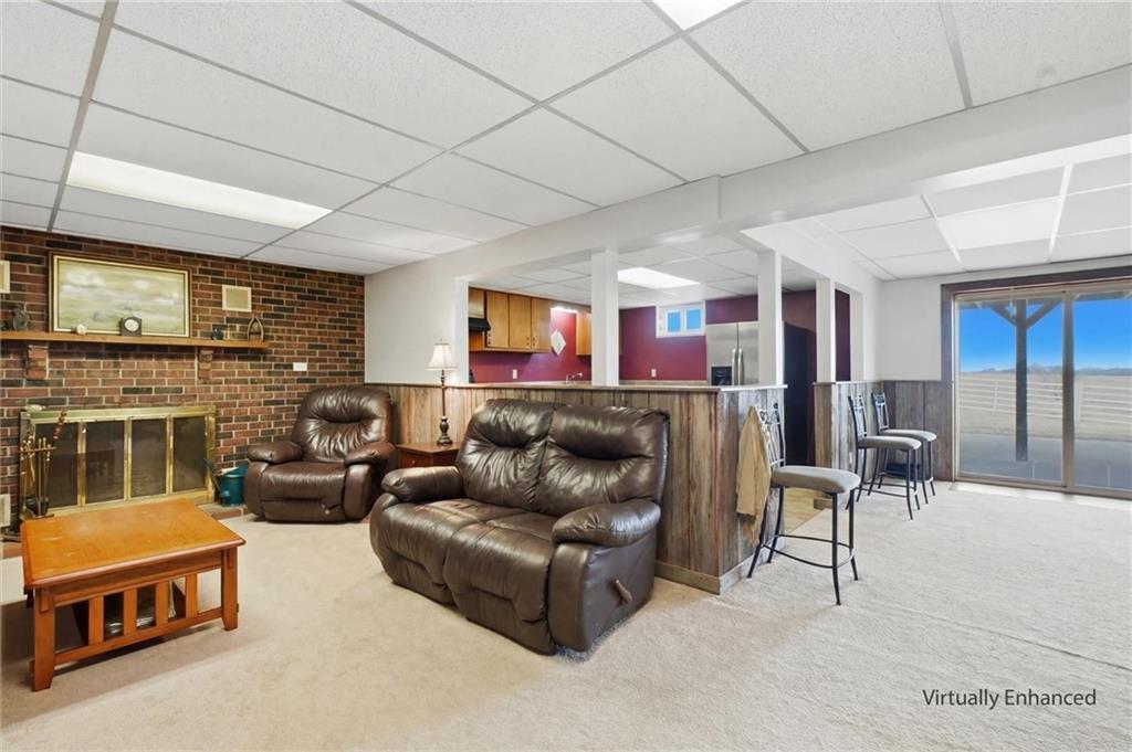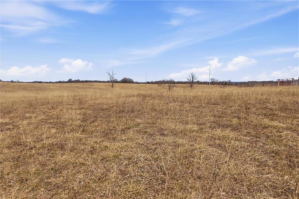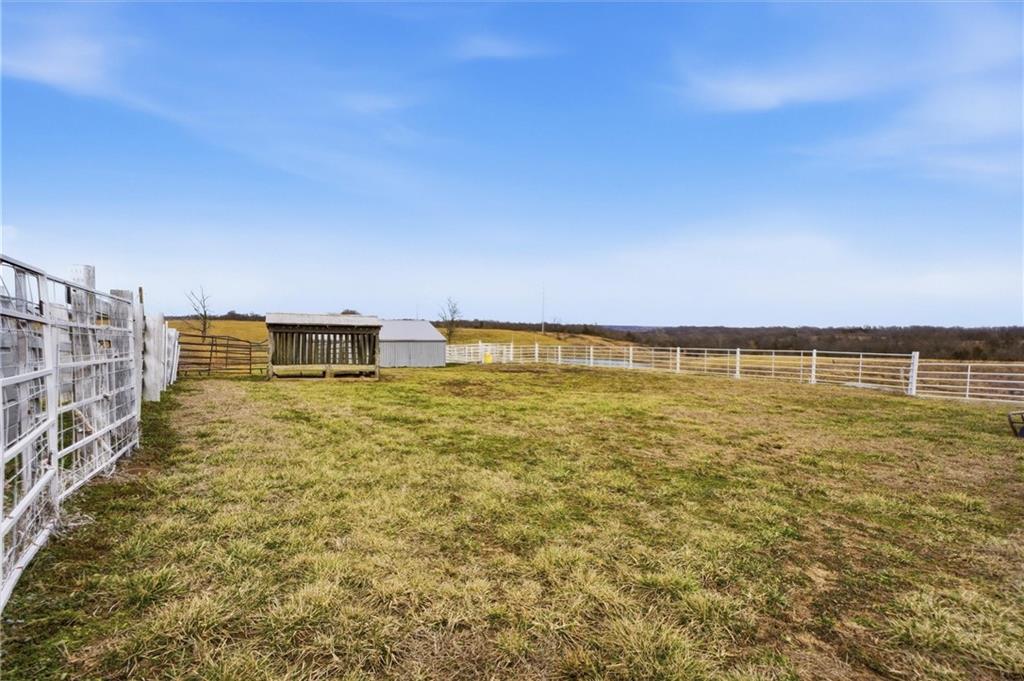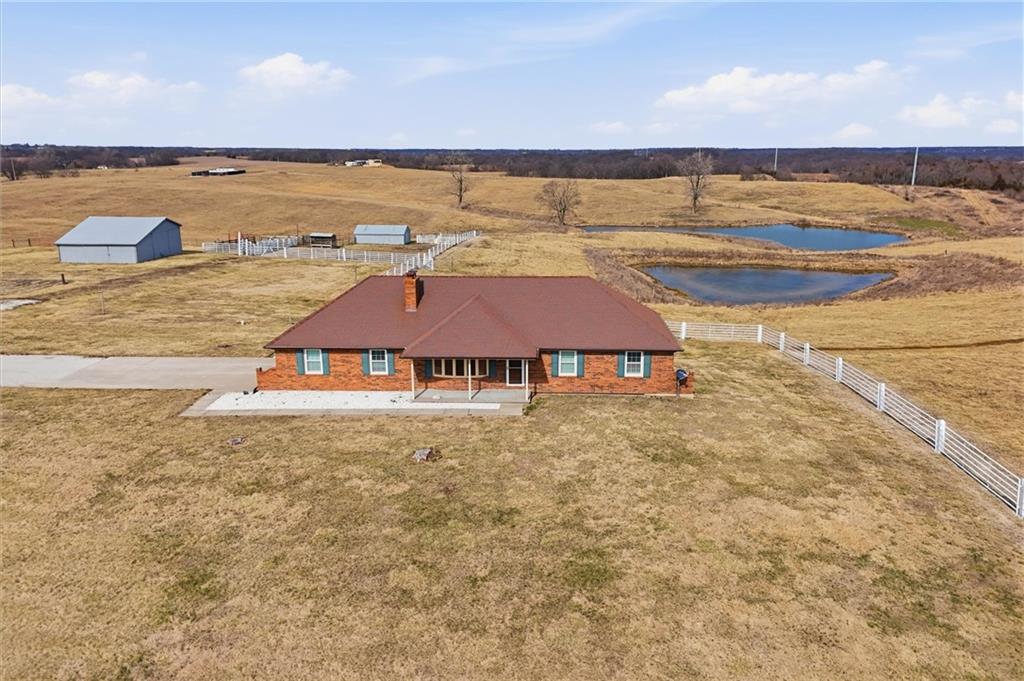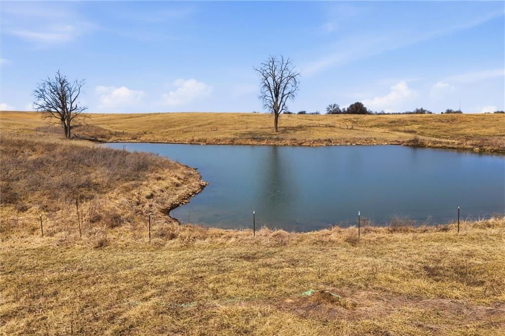 Beautifully maintained ranch home on 19+/- rolling acres featuring 2 main level bedrooms plus 3 non-conforming bedrooms in a fully finished walkout basement complete with a large second kitchen and spacious living room. Meticulously prepped for your comfort and located just 25 minutes from Kansas City, this property delivers the perfect mix of comfort, function, and wide open space. As you drive up, scenic views unfold across your land, buildings, fencing, and stocked pond. The large covered front porch is made for conversations that turn into lasting memories. The main level offers an open concept layout filled with natural light. The kitchen has northern exposure to the property, while the living room features large south-facing windows. Two oversized bedrooms sit on the main floor, including a spacious primary suite with private bath and pond views. A full hallway bath adds convenience. The kitchen includes granite countertops and space for a full size dining table. The walkout basement expands the living space with three additional non-conforming bedrooms and direct outdoor access, ideal for multi-generational living, guests, or entertaining. Formerly a cattle farm, the property is well suited for horses and includes recently painted fencing and gates, refreshed barns, and five total outbuildings. The 40x60 shop with concrete floors and power offers serious workspace. Fencing supports multiple farm animals, including that sought after Highland cow. An additional acreage directly north is available to expand your farm life even more. In the spring, the land comes alive with lush grass and vibrant views. Peaceful country living with city access within minutes. Well cared for. Move in ready. Built for lifestyle and legacy.