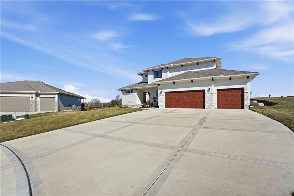 Price Reduction on this STUNNING 1.5 Story Home on a corner cul-de-sac lot. 4 bedroom with 3.5 baths 3 car garage with EV charging. Vaulted ceilings in the living room, Main floor master suite with office on main level. The kitchen offers high end cabinetry to the ceiling with walk in pantry and Calacatta Quartz countertops. 3 Bedrooms upstairs with additional living space. 2 full baths upstairs. Large unfished basement. Covered patio for enjoying your morning coffee and your evenings. Kearney address with Liberty Schools. Upgrades New sliding glass door with blinds, custom blinds throughout, Double front door, soaker tub in master bath, covered patio, sprinkler system