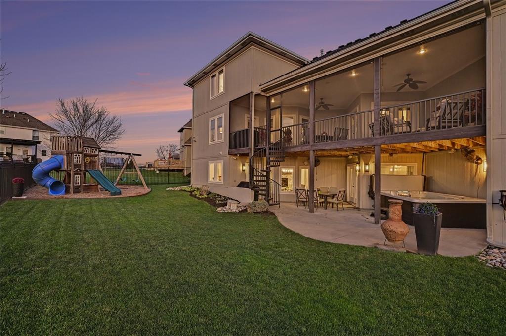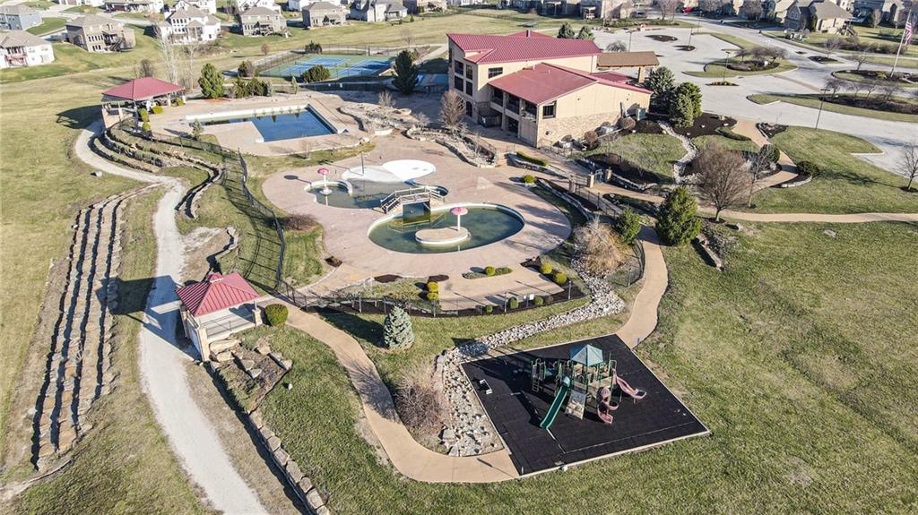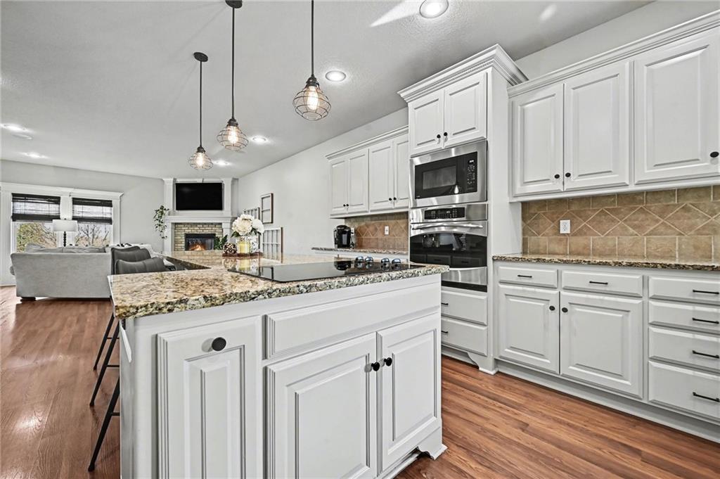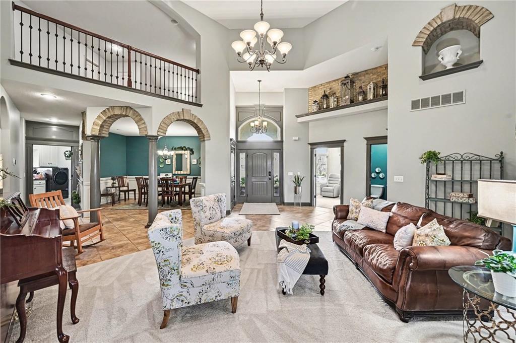 Welcome home! This 5 BR, 4.5 Bath 2-story home with 5,068 finished sq ft plus an additional 1,150 workshop in the basement, is ready for new owners. The main level has new paint and new carpet in the bedrooms and the formal living room, and includes an oversized primary bedroom suite with private bath and a large walk-in closet, with a walkout door to a screened patio. The 2 story-high vaulted ceilings in the formal living room and the dining room flow nicely into the kitchen/dining/hearth room, complete with newly painted cabinets, granite countertops, a spacious island, and gas fireplace. Ready for cozy evenings and easy entrance to screened-in porch to capture stunning sunsets. Main-level living with a laundry room right off the kitchen. The 3-Car garage has two garage door openers & features a utility sink. Second floor has its own HVAC system and includes a spacious loft overlooking the main-level living room and a hidden extra storage space over the garage. The second bedroom has a large walk-in closet & a private bathroom, which is also accessible from the loft area. Bedrooms three & four share a Jack & Jill bathroom with private sinks for each bedroom. The 2021 finished basement includes a large family room exiting to a covered patio, a built-in wine storage area, fireplace, and kitchenette with quartz counters, a luxury bath, a bedroom with private patio doors exiting to a covered patio, an exercise room, and extended finished area that could be converted to theater room, playroom, or extra extended living space. The generous 1,150 sq foot workshop off the finished basement includes a utility sink, a built-in workbench, exterior double doors for easy access to projects, storage, or hobby space. Stubbed for a 5th full bathroom. Outdoor features include manicured landscaping, full wrought-iron fencing, backs up to HOA greenspace & close proximity to a full playground, community center, pool, and walking trails. New, high-impact-resistant roof installed.
