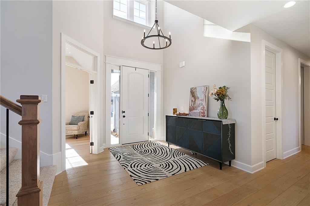 Stunning Award-Winning 1.5-Story will back to the future Blue Valley elementary school. This floor plan is designed for luxury and functionality. Thoughtful details include wood end caps, iron spindles, and vaulted ceilings, creating an elegant and spacious feel. The see-through fireplace seamlessly connects the great room to the covered patio, perfect for indoor-outdoor living. The center-island kitchen shines with painted cabinetry, offering both style and practicality. The main-level owner’s suite is a true retreat, featuring an oversized closet and a spa-like walk-in shower with dual shower heads. The office located off the entry provides the perfect work-from-home or study space. Tesla charger installed in garage stays with the home. Sundance Ridge’s premier amenities are now open! Enjoy a state-of-the-art fitness center, a resort-style pool, and scenic nature trails. Planned future amenities include a full gymnasium, pickleball and bocce ball courts, a playground, and a community garden. Clubhouse & first pool now open! Don’t wait—schedule your tour today!