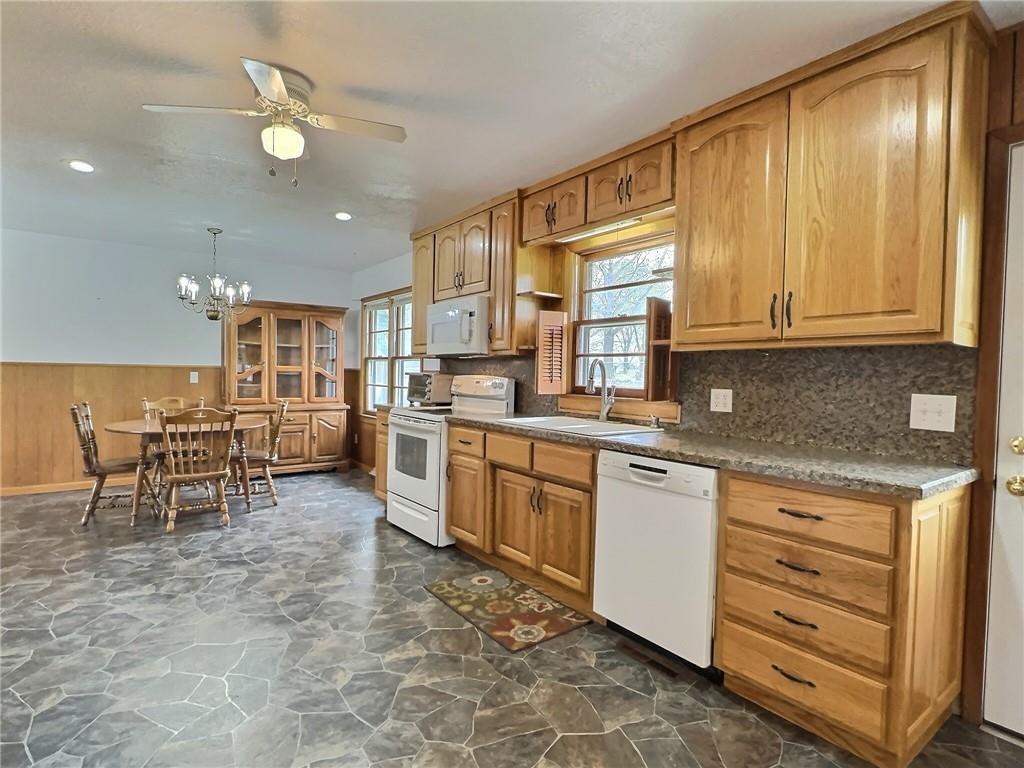 Kitchen with white appliances, a wainscoted wall, stone floors, wooden walls, and suspended lighting