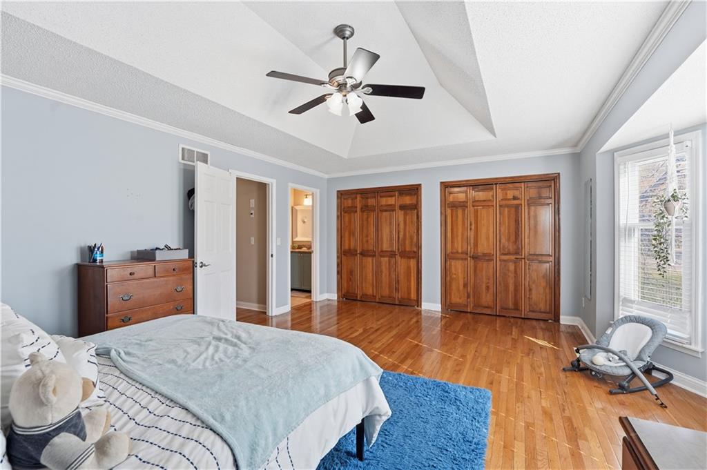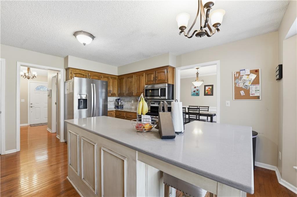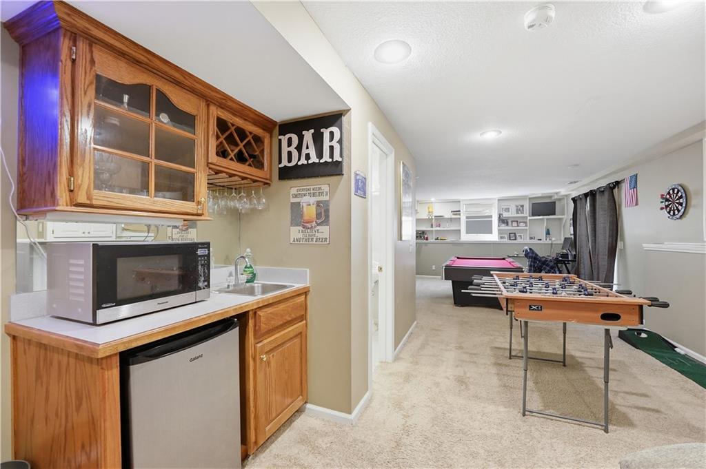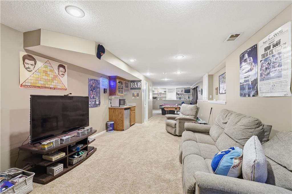 Ideally situated near Little Mill Creek South Park, great location! Gleaming wood floors run throughout the main level and continue upstairs into the hallway and bedrooms, creating a warm, cohesive feel. The main level offers flexibility and function, featuring a spacious living room with classic wainscoting—ideal as a sitting area or home office—alongside a formal dining room with direct access to the back deck. The kitchen is both stylish and practical, showcasing abundant cabinetry, granite and quartz countertops, stainless steel appliances, and a custom island with pullouts and seating. It opens seamlessly to the cozy great room, where a fireplace and built-in shelving create the perfect gathering space.Upstairs, you’ll find four generously sized bedrooms, a charming loft area, and two beautifully updated tiled bathrooms. The primary suite is a standout with its coffered ceiling, dual closets, and a refreshed en-suite bath featuring a tiled shower and floor and vanity with granite top. The finished walk-out basement expands your living space even further, offering the ultimate hangout zone with built-in shelving, a rec area with pool table, half bath, wet bar, and a media space with fireplace. Great opporunity.