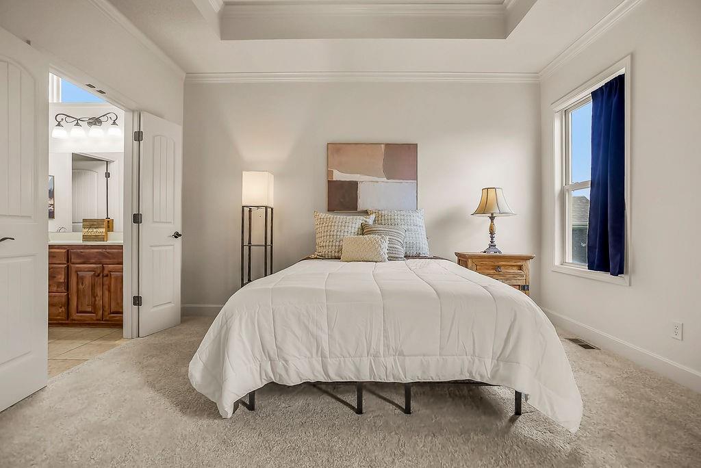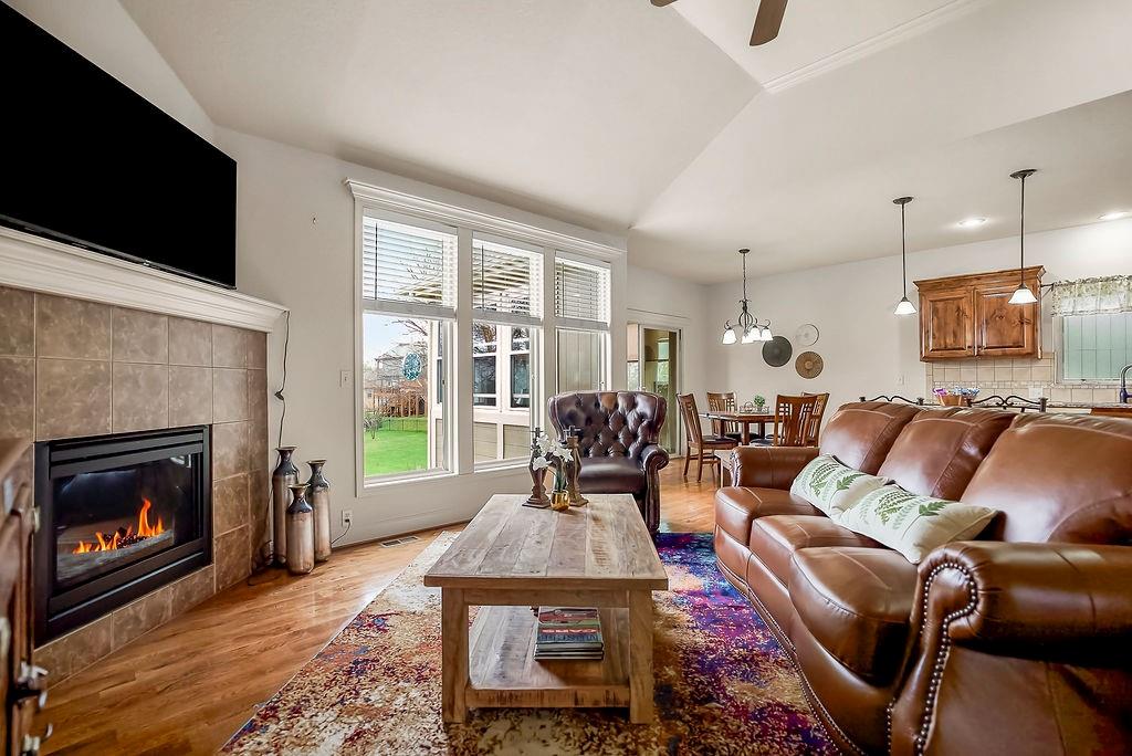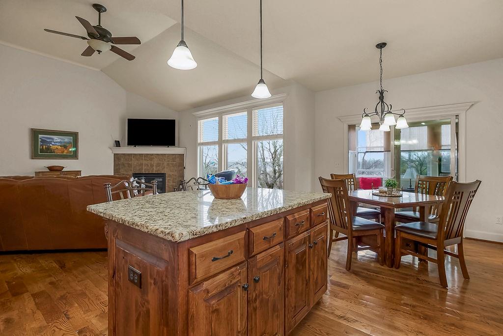Stunning 4 bedroom, 3 bath reverse 1.5 story nestled on a cul-de-sac, offering a walk-out lower level to a fully fenced backyard. This meticulously maintained home features fresh paint inside and out, new carpet in bedrooms and stairs and newly landscaped grounds — truly move-in ready. The thoughtful layout places the primary suite and a second bedroom and full bath on the main floor, while the lower level offers a second living area, two additional bedrooms, and a third full bath — just the right amount of space for everyone. The open floor plan is packed with modern features and designed for comfortable living and entertaining. At the heart of the home, the kitchen, dining area, and great room flow seamlessly together, anchored by a cozy gas fireplace. The kitchen showcases custom cabinetry, granite countertops, a large island, and a pantry for ample storage. A wall of windows floods the great room with natural light and frames beautiful views of the backyard. Step into the sunroom, an additional 110 sq feet, is just off the dining area — the perfect spot for your morning coffee or evening wind-down, with more serene backyard views. The lower level recreational room walks out to a patio and the fenced backyard, and the property extends beyond the fenced area for added space. Conveniently located near highways, retail, dining, and entertainment — this home truly has it all!